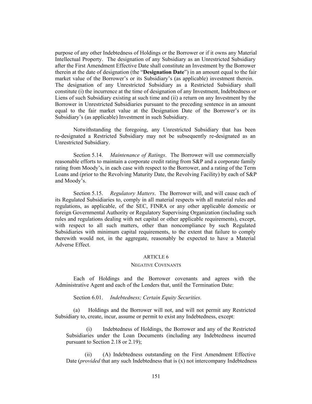 purpose of any other Indebtedness of Holdings or the Borrower or if it owns any Material Intellectual Property. The designation of any Subsidiary as an Unrestricted Subsidiary after the First Amendment Effective Date shall constitute an Investment by the Borrower therein at the date of designation (the “Designation Date”) in an amount equal to the fair market value of the Borrower’s or its Subsidiary’s (as applicable) investment therein. The designation of any Unrestricted Subsidiary as a Restricted Subsidiary shall constitute (i) the incurrence at the time of designation of any Investment, Indebtedness or Liens of such Subsidiary existing at such time and (ii) a return on any Investment by the Borrower in Unrestricted Subsidiaries pursuant to the preceding sentence in an amount equal to the fair market value at the Designation Date of the Borrower’s or its Subsidiary’s (as applicable) Investment in such Subsidiary. Notwithstanding the foregoing, any Unrestricted Subsidiary that has been re-designated a Restricted Subsidiary may not be subsequently re-designated as an Unrestricted Subsidiary. Section 5.14. Maintenance of Ratings. The Borrower will use commercially reasonable efforts to maintain a corporate credit rating from S&P and a corporate family rating from Moody’s, in each case with respect to the Borrower, and a rating of the Term Loans and (prior to the Revolving Maturity Date, the Revolving Facility) by each of S&P and Moody’s. Section 5.15. Regulatory Matters. The Borrower will, and will cause each of its Regulated Subsidiaries to, comply in all material respects with all material rules and regulations, as applicable, of the SEC, FINRA or any other applicable domestic or foreign Governmental Authority or Regulatory Supervising Organization (including such rules and regulations dealing with net capital or other applicable requirements), except, with respect to all such matters, other than noncompliance by such Regulated Subsidiaries with minimum capital requirements, to the extent that failure to comply therewith would not, in the aggregate, reasonably be expected to have a Material Adverse Effect. ARTICLE 6 NEGATIVE COVENANTS Each of Holdings and the Borrower covenants and agrees with the Administrative Agent and each of the Lenders that, until the Termination Date: Section 6.01. Indebtedness; Certain Equity Securities. (a) Holdings and the Borrower will not, and will not permit any Restricted Subsidiary to, create, incur, assume or permit to exist any Indebtedness, except: (i) Indebtedness of Holdings, the Borrower and any of the Restricted Subsidiaries under the Loan Documents (including any Indebtedness incurred pursuant to Section 2.18 or 2.19); (ii) (A) Indebtedness outstanding on the First Amendment Effective Date (provided that any such Indebtedness that is (x) not intercompany Indebtedness 151