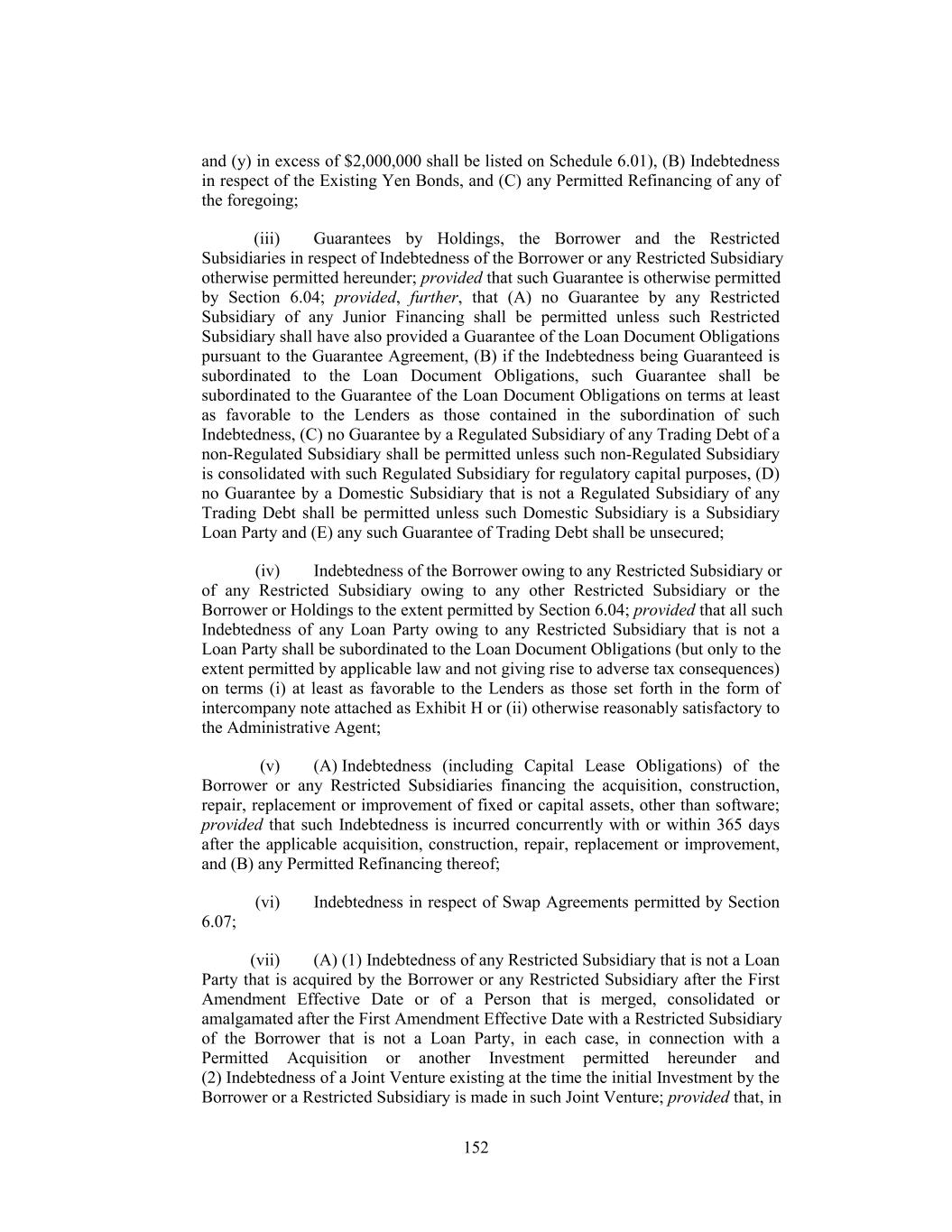 and (y) in excess of $2,000,000 shall be listed on Schedule 6.01), (B) Indebtedness in respect of the Existing Yen Bonds, and (C) any Permitted Refinancing of any of the foregoing; (iii) Guarantees by Holdings, the Borrower and the Restricted Subsidiaries in respect of Indebtedness of the Borrower or any Restricted Subsidiary otherwise permitted hereunder; provided that such Guarantee is otherwise permitted by Section 6.04; provided, further, that (A) no Guarantee by any Restricted Subsidiary of any Junior Financing shall be permitted unless such Restricted Subsidiary shall have also provided a Guarantee of the Loan Document Obligations pursuant to the Guarantee Agreement, (B) if the Indebtedness being Guaranteed is subordinated to the Loan Document Obligations, such Guarantee shall be subordinated to the Guarantee of the Loan Document Obligations on terms at least as favorable to the Lenders as those contained in the subordination of such Indebtedness, (C) no Guarantee by a Regulated Subsidiary of any Trading Debt of a non-Regulated Subsidiary shall be permitted unless such non-Regulated Subsidiary is consolidated with such Regulated Subsidiary for regulatory capital purposes, (D) no Guarantee by a Domestic Subsidiary that is not a Regulated Subsidiary of any Trading Debt shall be permitted unless such Domestic Subsidiary is a Subsidiary Loan Party and (E) any such Guarantee of Trading Debt shall be unsecured; (iv) Indebtedness of the Borrower owing to any Restricted Subsidiary or of any Restricted Subsidiary owing to any other Restricted Subsidiary or the Borrower or Holdings to the extent permitted by Section 6.04; provided that all such Indebtedness of any Loan Party owing to any Restricted Subsidiary that is not a Loan Party shall be subordinated to the Loan Document Obligations (but only to the extent permitted by applicable law and not giving rise to adverse tax consequences) on terms (i) at least as favorable to the Lenders as those set forth in the form of intercompany note attached as Exhibit H or (ii) otherwise reasonably satisfactory to the Administrative Agent; (v) (A) Indebtedness (including Capital Lease Obligations) of the Borrower or any Restricted Subsidiaries financing the acquisition, construction, repair, replacement or improvement of fixed or capital assets, other than software; provided that such Indebtedness is incurred concurrently with or within 365 days after the applicable acquisition, construction, repair, replacement or improvement, and (B) any Permitted Refinancing thereof; (vi) Indebtedness in respect of Swap Agreements permitted by Section 6.07; (vii) (A) (1) Indebtedness of any Restricted Subsidiary that is not a Loan Party that is acquired by the Borrower or any Restricted Subsidiary after the First Amendment Effective Date or of a Person that is merged, consolidated or amalgamated after the First Amendment Effective Date with a Restricted Subsidiary of the Borrower that is not a Loan Party, in each case, in connection with a Permitted Acquisition or another Investment permitted hereunder and (2) Indebtedness of a Joint Venture existing at the time the initial Investment by the Borrower or a Restricted Subsidiary is made in such Joint Venture; provided that, in 152