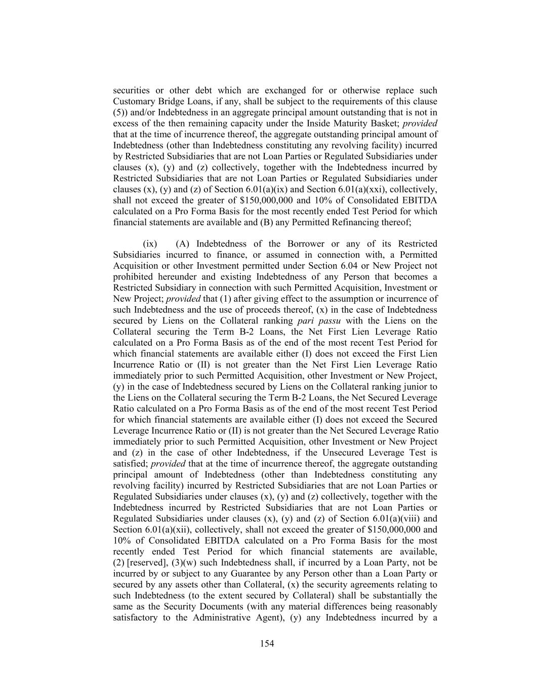 securities or other debt which are exchanged for or otherwise replace such Customary Bridge Loans, if any, shall be subject to the requirements of this clause (5)) and/or Indebtedness in an aggregate principal amount outstanding that is not in excess of the then remaining capacity under the Inside Maturity Basket; provided that at the time of incurrence thereof, the aggregate outstanding principal amount of Indebtedness (other than Indebtedness constituting any revolving facility) incurred by Restricted Subsidiaries that are not Loan Parties or Regulated Subsidiaries under clauses (x), (y) and (z) collectively, together with the Indebtedness incurred by Restricted Subsidiaries that are not Loan Parties or Regulated Subsidiaries under clauses (x), (y) and (z) of Section 6.01(a)(ix) and Section 6.01(a)(xxi), collectively, shall not exceed the greater of $150,000,000 and 10% of Consolidated EBITDA calculated on a Pro Forma Basis for the most recently ended Test Period for which financial statements are available and (B) any Permitted Refinancing thereof; (ix) (A) Indebtedness of the Borrower or any of its Restricted Subsidiaries incurred to finance, or assumed in connection with, a Permitted Acquisition or other Investment permitted under Section 6.04 or New Project not prohibited hereunder and existing Indebtedness of any Person that becomes a Restricted Subsidiary in connection with such Permitted Acquisition, Investment or New Project; provided that (1) after giving effect to the assumption or incurrence of such Indebtedness and the use of proceeds thereof, (x) in the case of Indebtedness secured by Liens on the Collateral ranking pari passu with the Liens on the Collateral securing the Term B-2 Loans, the Net First Lien Leverage Ratio calculated on a Pro Forma Basis as of the end of the most recent Test Period for which financial statements are available either (I) does not exceed the First Lien Incurrence Ratio or (II) is not greater than the Net First Lien Leverage Ratio immediately prior to such Permitted Acquisition, other Investment or New Project, (y) in the case of Indebtedness secured by Liens on the Collateral ranking junior to the Liens on the Collateral securing the Term B-2 Loans, the Net Secured Leverage Ratio calculated on a Pro Forma Basis as of the end of the most recent Test Period for which financial statements are available either (I) does not exceed the Secured Leverage Incurrence Ratio or (II) is not greater than the Net Secured Leverage Ratio immediately prior to such Permitted Acquisition, other Investment or New Project and (z) in the case of other Indebtedness, if the Unsecured Leverage Test is satisfied; provided that at the time of incurrence thereof, the aggregate outstanding principal amount of Indebtedness (other than Indebtedness constituting any revolving facility) incurred by Restricted Subsidiaries that are not Loan Parties or Regulated Subsidiaries under clauses (x), (y) and (z) collectively, together with the Indebtedness incurred by Restricted Subsidiaries that are not Loan Parties or Regulated Subsidiaries under clauses (x), (y) and (z) of Section 6.01(a)(viii) and Section 6.01(a)(xii), collectively, shall not exceed the greater of $150,000,000 and 10% of Consolidated EBITDA calculated on a Pro Forma Basis for the most recently ended Test Period for which financial statements are available, (2) [reserved], (3)(w) such Indebtedness shall, if incurred by a Loan Party, not be incurred by or subject to any Guarantee by any Person other than a Loan Party or secured by any assets other than Collateral, (x) the security agreements relating to such Indebtedness (to the extent secured by Collateral) shall be substantially the same as the Security Documents (with any material differences being reasonably satisfactory to the Administrative Agent), (y) any Indebtedness incurred by a 154