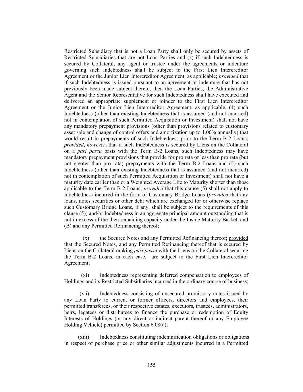 Restricted Subsidiary that is not a Loan Party shall only be secured by assets of Restricted Subsidiaries that are not Loan Parties and (z) if such Indebtedness is secured by Collateral, any agent or trustee under the agreements or indenture governing such Indebtedness shall be subject to the First Lien Intercreditor Agreement or the Junior Lien Intercreditor Agreement, as applicable; provided that if such Indebtedness is issued pursuant to an agreement or indenture that has not previously been made subject thereto, then the Loan Parties, the Administrative Agent and the Senior Representative for such Indebtedness shall have executed and delivered an appropriate supplement or joinder to the First Lien Intercreditor Agreement or the Junior Lien Intercreditor Agreement, as applicable, (4) such Indebtedness (other than existing Indebtedness that is assumed (and not incurred) not in contemplation of such Permitted Acquisition or Investment) shall not have any mandatory prepayment provisions (other than provisions related to customary asset sale and change of control offers and amortization up to 1.00% annually) that would result in prepayments of such Indebtedness prior to the Term B-2 Loans; provided, however, that if such Indebtedness is secured by Liens on the Collateral on a pari passu basis with the Term B-2 Loans, such Indebtedness may have mandatory prepayment provisions that provide for pro rata or less than pro rata (but not greater than pro rata) prepayments with the Term B-2 Loans and (5) such Indebtedness (other than existing Indebtedness that is assumed (and not incurred) not in contemplation of such Permitted Acquisition or Investment) shall not have a maturity date earlier than or a Weighted Average Life to Maturity shorter than those applicable to the Term B-2 Loans; provided that this clause (5) shall not apply to Indebtedness incurred in the form of Customary Bridge Loans (provided that any loans, notes securities or other debt which are exchanged for or otherwise replace such Customary Bridge Loans, if any, shall be subject to the requirements of this clause (5)) and/or Indebtedness in an aggregate principal amount outstanding that is not in excess of the then remaining capacity under the Inside Maturity Basket, and (B) and any Permitted Refinancing thereof; (x) the Secured Notes and any Permitted Refinancing thereof; provided that the Secured Notes, and any Permitted Refinancing thereof that is secured by Liens on the Collateral ranking pari passu with the Liens on the Collateral securing the Term B-2 Loans, in each case, are subject to the First Lien Intercreditor Agreement; (xi) Indebtedness representing deferred compensation to employees of Holdings and its Restricted Subsidiaries incurred in the ordinary course of business; (xii) Indebtedness consisting of unsecured promissory notes issued by any Loan Party to current or former officers, directors and employees, their permitted transferees, or their respective estates, executors, trustees, administrators, heirs, legatees or distributees to finance the purchase or redemption of Equity Interests of Holdings (or any direct or indirect parent thereof or any Employee Holding Vehicle) permitted by Section 6.08(a); (xiii) Indebtedness constituting indemnification obligations or obligations in respect of purchase price or other similar adjustments incurred in a Permitted 155