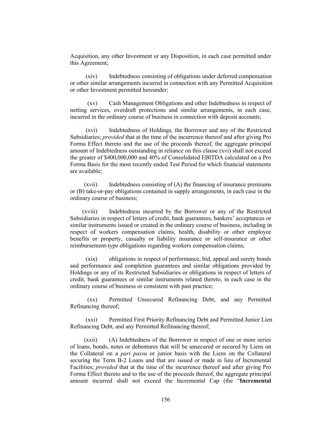 Acquisition, any other Investment or any Disposition, in each case permitted under this Agreement; (xiv) Indebtedness consisting of obligations under deferred compensation or other similar arrangements incurred in connection with any Permitted Acquisition or other Investment permitted hereunder; (xv) Cash Management Obligations and other Indebtedness in respect of netting services, overdraft protections and similar arrangements, in each case, incurred in the ordinary course of business in connection with deposit accounts; (xvi) Indebtedness of Holdings, the Borrower and any of the Restricted Subsidiaries; provided that at the time of the incurrence thereof and after giving Pro Forma Effect thereto and the use of the proceeds thereof, the aggregate principal amount of Indebtedness outstanding in reliance on this clause (xvi) shall not exceed the greater of $400,000,000 and 40% of Consolidated EBITDA calculated on a Pro Forma Basis for the most recently ended Test Period for which financial statements are available; (xvii) Indebtedness consisting of (A) the financing of insurance premiums or (B) take-or-pay obligations contained in supply arrangements, in each case in the ordinary course of business; (xviii) Indebtedness incurred by the Borrower or any of the Restricted Subsidiaries in respect of letters of credit, bank guarantees, bankers’ acceptances or similar instruments issued or created in the ordinary course of business, including in respect of workers compensation claims, health, disability or other employee benefits or property, casualty or liability insurance or self-insurance or other reimbursement-type obligations regarding workers compensation claims; (xix) obligations in respect of performance, bid, appeal and surety bonds and performance and completion guarantees and similar obligations provided by Holdings or any of its Restricted Subsidiaries or obligations in respect of letters of credit, bank guarantees or similar instruments related thereto, in each case in the ordinary course of business or consistent with past practice; (xx) Permitted Unsecured Refinancing Debt, and any Permitted Refinancing thereof; (xxi) Permitted First Priority Refinancing Debt and Permitted Junior Lien Refinancing Debt, and any Permitted Refinancing thereof; (xxii) (A) Indebtedness of the Borrower in respect of one or more series of loans, bonds, notes or debentures that will be unsecured or secured by Liens on the Collateral on a pari passu or junior basis with the Liens on the Collateral securing the Term B-2 Loans and that are issued or made in lieu of Incremental Facilities; provided that at the time of the incurrence thereof and after giving Pro Forma Effect thereto and to the use of the proceeds thereof, the aggregate principal amount incurred shall not exceed the Incremental Cap (the “Incremental 156