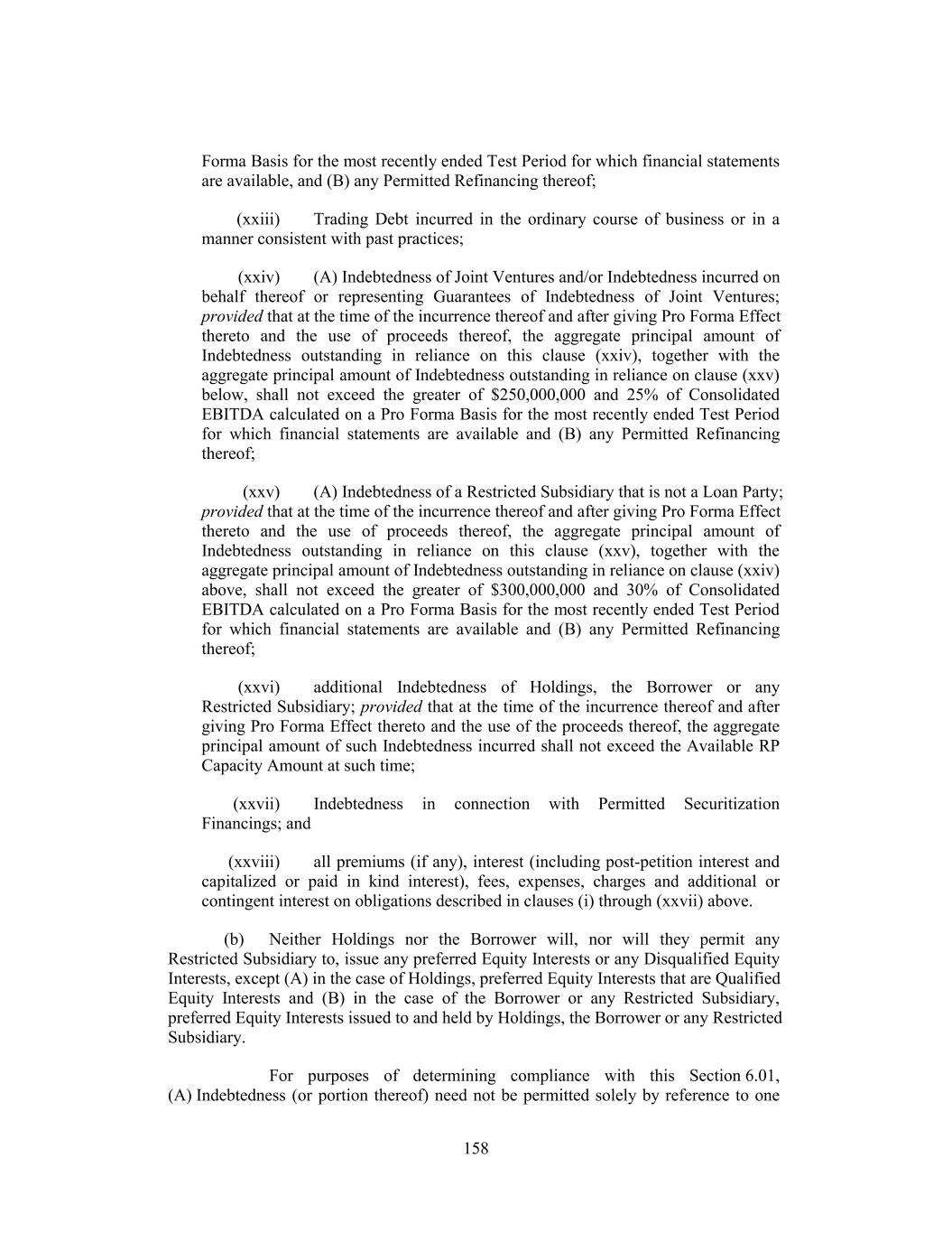 Forma Basis for the most recently ended Test Period for which financial statements are available, and (B) any Permitted Refinancing thereof; (xxiii) Trading Debt incurred in the ordinary course of business or in a manner consistent with past practices; (xxiv) (A) Indebtedness of Joint Ventures and/or Indebtedness incurred on behalf thereof or representing Guarantees of Indebtedness of Joint Ventures; provided that at the time of the incurrence thereof and after giving Pro Forma Effect thereto and the use of proceeds thereof, the aggregate principal amount of Indebtedness outstanding in reliance on this clause (xxiv), together with the aggregate principal amount of Indebtedness outstanding in reliance on clause (xxv) below, shall not exceed the greater of $250,000,000 and 25% of Consolidated EBITDA calculated on a Pro Forma Basis for the most recently ended Test Period for which financial statements are available and (B) any Permitted Refinancing thereof; (xxv) (A) Indebtedness of a Restricted Subsidiary that is not a Loan Party; provided that at the time of the incurrence thereof and after giving Pro Forma Effect thereto and the use of proceeds thereof, the aggregate principal amount of Indebtedness outstanding in reliance on this clause (xxv), together with the aggregate principal amount of Indebtedness outstanding in reliance on clause (xxiv) above, shall not exceed the greater of $300,000,000 and 30% of Consolidated EBITDA calculated on a Pro Forma Basis for the most recently ended Test Period for which financial statements are available and (B) any Permitted Refinancing thereof; (xxvi) additional Indebtedness of Holdings, the Borrower or any Restricted Subsidiary; provided that at the time of the incurrence thereof and after giving Pro Forma Effect thereto and the use of the proceeds thereof, the aggregate principal amount of such Indebtedness incurred shall not exceed the Available RP Capacity Amount at such time; (xxvii) Indebtedness in connection with Permitted Securitization Financings; and (xxviii) all premiums (if any), interest (including post-petition interest and capitalized or paid in kind interest), fees, expenses, charges and additional or contingent interest on obligations described in clauses (i) through (xxvii) above. (b) Neither Holdings nor the Borrower will, nor will they permit any Restricted Subsidiary to, issue any preferred Equity Interests or any Disqualified Equity Interests, except (A) in the case of Holdings, preferred Equity Interests that are Qualified Equity Interests and (B) in the case of the Borrower or any Restricted Subsidiary, preferred Equity Interests issued to and held by Holdings, the Borrower or any Restricted Subsidiary. For purposes of determining compliance with this Section 6.01, (A) Indebtedness (or portion thereof) need not be permitted solely by reference to one 158