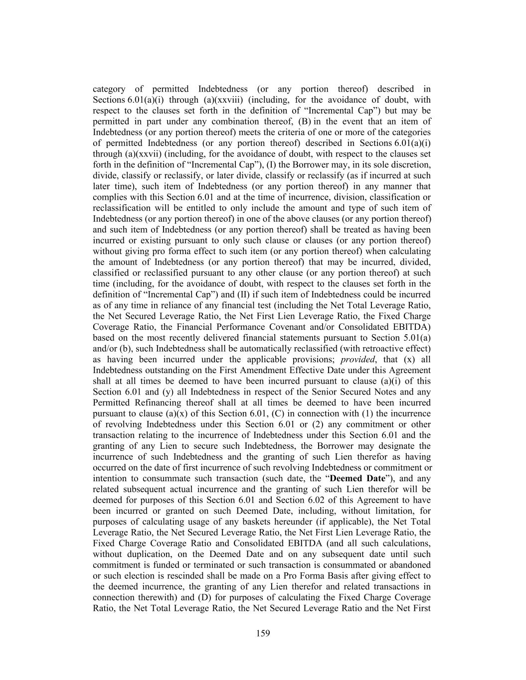 category of permitted Indebtedness (or any portion thereof) described in Sections 6.01(a)(i) through (a)(xxviii) (including, for the avoidance of doubt, with respect to the clauses set forth in the definition of “Incremental Cap”) but may be permitted in part under any combination thereof, (B) in the event that an item of Indebtedness (or any portion thereof) meets the criteria of one or more of the categories of permitted Indebtedness (or any portion thereof) described in Sections 6.01(a)(i) through (a)(xxvii) (including, for the avoidance of doubt, with respect to the clauses set forth in the definition of “Incremental Cap”), (I) the Borrower may, in its sole discretion, divide, classify or reclassify, or later divide, classify or reclassify (as if incurred at such later time), such item of Indebtedness (or any portion thereof) in any manner that complies with this Section 6.01 and at the time of incurrence, division, classification or reclassification will be entitled to only include the amount and type of such item of Indebtedness (or any portion thereof) in one of the above clauses (or any portion thereof) and such item of Indebtedness (or any portion thereof) shall be treated as having been incurred or existing pursuant to only such clause or clauses (or any portion thereof) without giving pro forma effect to such item (or any portion thereof) when calculating the amount of Indebtedness (or any portion thereof) that may be incurred, divided, classified or reclassified pursuant to any other clause (or any portion thereof) at such time (including, for the avoidance of doubt, with respect to the clauses set forth in the definition of “Incremental Cap”) and (II) if such item of Indebtedness could be incurred as of any time in reliance of any financial test (including the Net Total Leverage Ratio, the Net Secured Leverage Ratio, the Net First Lien Leverage Ratio, the Fixed Charge Coverage Ratio, the Financial Performance Covenant and/or Consolidated EBITDA) based on the most recently delivered financial statements pursuant to Section 5.01(a) and/or (b), such Indebtedness shall be automatically reclassified (with retroactive effect) as having been incurred under the applicable provisions; provided, that (x) all Indebtedness outstanding on the First Amendment Effective Date under this Agreement shall at all times be deemed to have been incurred pursuant to clause (a)(i) of this Section 6.01 and (y) all Indebtedness in respect of the Senior Secured Notes and any Permitted Refinancing thereof shall at all times be deemed to have been incurred pursuant to clause (a)(x) of this Section 6.01, (C) in connection with (1) the incurrence of revolving Indebtedness under this Section 6.01 or (2) any commitment or other transaction relating to the incurrence of Indebtedness under this Section 6.01 and the granting of any Lien to secure such Indebtedness, the Borrower may designate the incurrence of such Indebtedness and the granting of such Lien therefor as having occurred on the date of first incurrence of such revolving Indebtedness or commitment or intention to consummate such transaction (such date, the “Deemed Date”), and any related subsequent actual incurrence and the granting of such Lien therefor will be deemed for purposes of this Section 6.01 and Section 6.02 of this Agreement to have been incurred or granted on such Deemed Date, including, without limitation, for purposes of calculating usage of any baskets hereunder (if applicable), the Net Total Leverage Ratio, the Net Secured Leverage Ratio, the Net First Lien Leverage Ratio, the Fixed Charge Coverage Ratio and Consolidated EBITDA (and all such calculations, without duplication, on the Deemed Date and on any subsequent date until such commitment is funded or terminated or such transaction is consummated or abandoned or such election is rescinded shall be made on a Pro Forma Basis after giving effect to the deemed incurrence, the granting of any Lien therefor and related transactions in connection therewith) and (D) for purposes of calculating the Fixed Charge Coverage Ratio, the Net Total Leverage Ratio, the Net Secured Leverage Ratio and the Net First 159