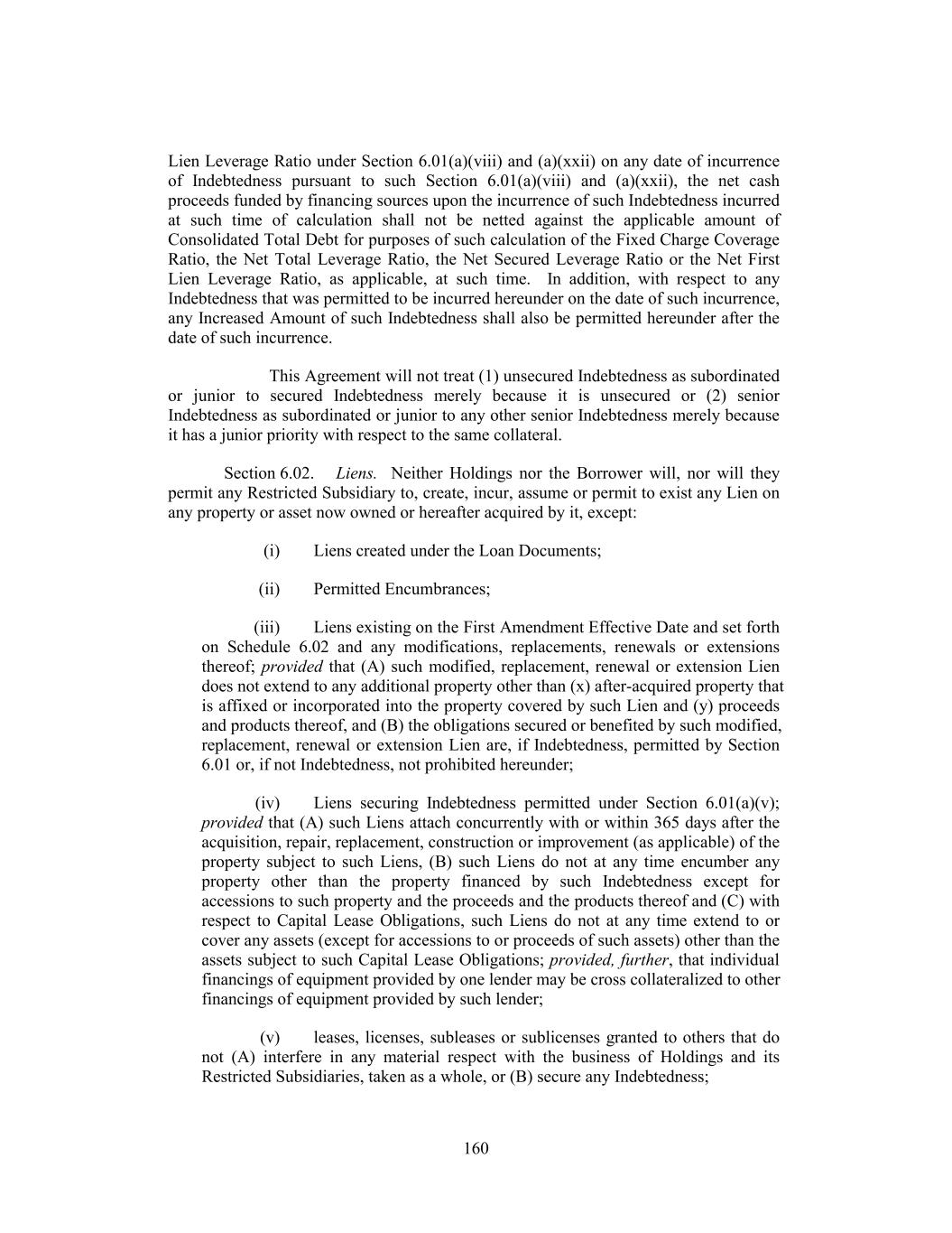 Lien Leverage Ratio under Section 6.01(a)(viii) and (a)(xxii) on any date of incurrence of Indebtedness pursuant to such Section 6.01(a)(viii) and (a)(xxii), the net cash proceeds funded by financing sources upon the incurrence of such Indebtedness incurred at such time of calculation shall not be netted against the applicable amount of Consolidated Total Debt for purposes of such calculation of the Fixed Charge Coverage Ratio, the Net Total Leverage Ratio, the Net Secured Leverage Ratio or the Net First Lien Leverage Ratio, as applicable, at such time. In addition, with respect to any Indebtedness that was permitted to be incurred hereunder on the date of such incurrence, any Increased Amount of such Indebtedness shall also be permitted hereunder after the date of such incurrence. This Agreement will not treat (1) unsecured Indebtedness as subordinated or junior to secured Indebtedness merely because it is unsecured or (2) senior Indebtedness as subordinated or junior to any other senior Indebtedness merely because it has a junior priority with respect to the same collateral. Section 6.02. Liens. Neither Holdings nor the Borrower will, nor will they permit any Restricted Subsidiary to, create, incur, assume or permit to exist any Lien on any property or asset now owned or hereafter acquired by it, except: (i) Liens created under the Loan Documents; (ii) Permitted Encumbrances; (iii) Liens existing on the First Amendment Effective Date and set forth on Schedule 6.02 and any modifications, replacements, renewals or extensions thereof; provided that (A) such modified, replacement, renewal or extension Lien does not extend to any additional property other than (x) after-acquired property that is affixed or incorporated into the property covered by such Lien and (y) proceeds and products thereof, and (B) the obligations secured or benefited by such modified, replacement, renewal or extension Lien are, if Indebtedness, permitted by Section 6.01 or, if not Indebtedness, not prohibited hereunder; (iv) Liens securing Indebtedness permitted under Section 6.01(a)(v); provided that (A) such Liens attach concurrently with or within 365 days after the acquisition, repair, replacement, construction or improvement (as applicable) of the property subject to such Liens, (B) such Liens do not at any time encumber any property other than the property financed by such Indebtedness except for accessions to such property and the proceeds and the products thereof and (C) with respect to Capital Lease Obligations, such Liens do not at any time extend to or cover any assets (except for accessions to or proceeds of such assets) other than the assets subject to such Capital Lease Obligations; provided, further, that individual financings of equipment provided by one lender may be cross collateralized to other financings of equipment provided by such lender; (v) leases, licenses, subleases or sublicenses granted to others that do not (A) interfere in any material respect with the business of Holdings and its Restricted Subsidiaries, taken as a whole, or (B) secure any Indebtedness; 160