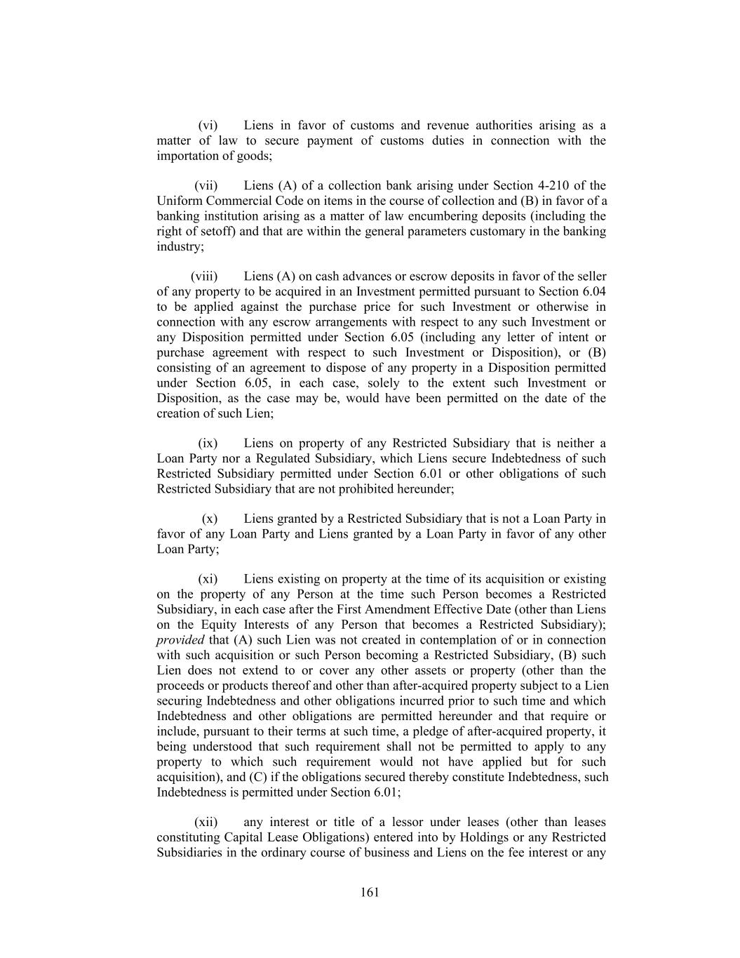 (vi) Liens in favor of customs and revenue authorities arising as a matter of law to secure payment of customs duties in connection with the importation of goods; (vii) Liens (A) of a collection bank arising under Section 4-210 of the Uniform Commercial Code on items in the course of collection and (B) in favor of a banking institution arising as a matter of law encumbering deposits (including the right of setoff) and that are within the general parameters customary in the banking industry; (viii) Liens (A) on cash advances or escrow deposits in favor of the seller of any property to be acquired in an Investment permitted pursuant to Section 6.04 to be applied against the purchase price for such Investment or otherwise in connection with any escrow arrangements with respect to any such Investment or any Disposition permitted under Section 6.05 (including any letter of intent or purchase agreement with respect to such Investment or Disposition), or (B) consisting of an agreement to dispose of any property in a Disposition permitted under Section 6.05, in each case, solely to the extent such Investment or Disposition, as the case may be, would have been permitted on the date of the creation of such Lien; (ix) Liens on property of any Restricted Subsidiary that is neither a Loan Party nor a Regulated Subsidiary, which Liens secure Indebtedness of such Restricted Subsidiary permitted under Section 6.01 or other obligations of such Restricted Subsidiary that are not prohibited hereunder; (x) Liens granted by a Restricted Subsidiary that is not a Loan Party in favor of any Loan Party and Liens granted by a Loan Party in favor of any other Loan Party; (xi) Liens existing on property at the time of its acquisition or existing on the property of any Person at the time such Person becomes a Restricted Subsidiary, in each case after the First Amendment Effective Date (other than Liens on the Equity Interests of any Person that becomes a Restricted Subsidiary); provided that (A) such Lien was not created in contemplation of or in connection with such acquisition or such Person becoming a Restricted Subsidiary, (B) such Lien does not extend to or cover any other assets or property (other than the proceeds or products thereof and other than after-acquired property subject to a Lien securing Indebtedness and other obligations incurred prior to such time and which Indebtedness and other obligations are permitted hereunder and that require or include, pursuant to their terms at such time, a pledge of after-acquired property, it being understood that such requirement shall not be permitted to apply to any property to which such requirement would not have applied but for such acquisition), and (C) if the obligations secured thereby constitute Indebtedness, such Indebtedness is permitted under Section 6.01; (xii) any interest or title of a lessor under leases (other than leases constituting Capital Lease Obligations) entered into by Holdings or any Restricted Subsidiaries in the ordinary course of business and Liens on the fee interest or any 161