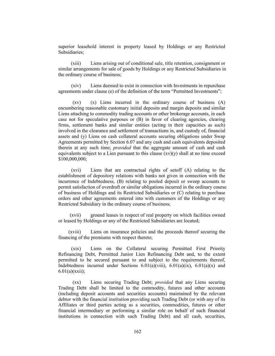 superior leasehold interest in property leased by Holdings or any Restricted Subsidiaries; (xiii) Liens arising out of conditional sale, title retention, consignment or similar arrangements for sale of goods by Holdings or any Restricted Subsidiaries in the ordinary course of business; (xiv) Liens deemed to exist in connection with Investments in repurchase agreements under clause (e) of the definition of the term “Permitted Investments”; (xv) (x) Liens incurred in the ordinary course of business (A) encumbering reasonable customary initial deposits and margin deposits and similar Liens attaching to commodity trading accounts or other brokerage accounts, in each case not for speculative purposes or (B) in favor of clearing agencies, clearing firms, settlement banks and similar entities (acting in their capacities as such) involved in the clearance and settlement of transactions in, and custody of, financial assets and (y) Liens on cash collateral accounts securing obligations under Swap Agreements permitted by Section 6.07 and any cash and cash equivalents deposited therein at any such time; provided that the aggregate amount of cash and cash equivalents subject to a Lien pursuant to this clause (xv)(y) shall at no time exceed $100,000,000; (xvi) Liens that are contractual rights of setoff (A) relating to the establishment of depository relations with banks not given in connection with the incurrence of Indebtedness, (B) relating to pooled deposit or sweep accounts to permit satisfaction of overdraft or similar obligations incurred in the ordinary course of business of Holdings and its Restricted Subsidiaries or (C) relating to purchase orders and other agreements entered into with customers of the Holdings or any Restricted Subsidiary in the ordinary course of business; (xvii) ground leases in respect of real property on which facilities owned or leased by Holdings or any of the Restricted Subsidiaries are located; (xviii) Liens on insurance policies and the proceeds thereof securing the financing of the premiums with respect thereto; (xix) Liens on the Collateral securing Permitted First Priority Refinancing Debt, Permitted Junior Lien Refinancing Debt and, to the extent permitted to be secured pursuant to and subject to the requirements thereof, Indebtedness incurred under Sections 6.01(a)(viii), 6.01(a)(ix), 6.01(a)(x) and 6.01(a)(xxii); (xx) Liens securing Trading Debt; provided that any Liens securing Trading Debt shall be limited to the commodity, futures and other accounts (including deposit accounts and securities accounts) maintained by the relevant debtor with the financial institution providing such Trading Debt (or with any of its Affiliates or third parties acting as a securities, commodities, futures or other financial intermediary or performing a similar role on behalf of such financial institutions in connection with such Trading Debt) and all cash, securities, 162