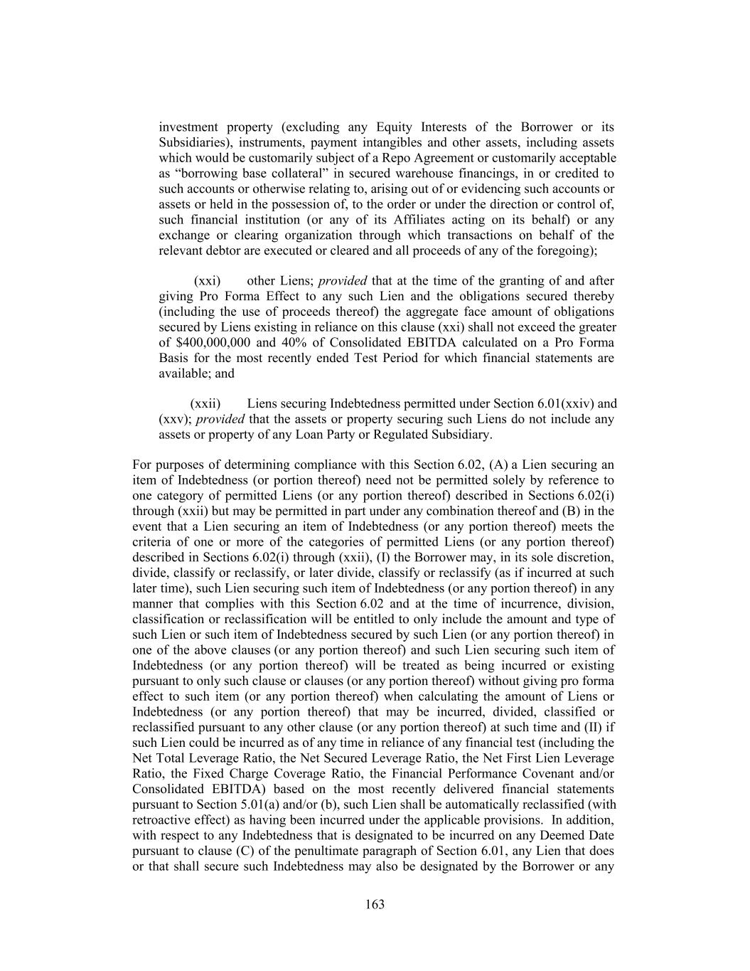 investment property (excluding any Equity Interests of the Borrower or its Subsidiaries), instruments, payment intangibles and other assets, including assets which would be customarily subject of a Repo Agreement or customarily acceptable as “borrowing base collateral” in secured warehouse financings, in or credited to such accounts or otherwise relating to, arising out of or evidencing such accounts or assets or held in the possession of, to the order or under the direction or control of, such financial institution (or any of its Affiliates acting on its behalf) or any exchange or clearing organization through which transactions on behalf of the relevant debtor are executed or cleared and all proceeds of any of the foregoing); (xxi) other Liens; provided that at the time of the granting of and after giving Pro Forma Effect to any such Lien and the obligations secured thereby (including the use of proceeds thereof) the aggregate face amount of obligations secured by Liens existing in reliance on this clause (xxi) shall not exceed the greater of $400,000,000 and 40% of Consolidated EBITDA calculated on a Pro Forma Basis for the most recently ended Test Period for which financial statements are available; and (xxii) Liens securing Indebtedness permitted under Section 6.01(xxiv) and (xxv); provided that the assets or property securing such Liens do not include any assets or property of any Loan Party or Regulated Subsidiary. For purposes of determining compliance with this Section 6.02, (A) a Lien securing an item of Indebtedness (or portion thereof) need not be permitted solely by reference to one category of permitted Liens (or any portion thereof) described in Sections 6.02(i) through (xxii) but may be permitted in part under any combination thereof and (B) in the event that a Lien securing an item of Indebtedness (or any portion thereof) meets the criteria of one or more of the categories of permitted Liens (or any portion thereof) described in Sections 6.02(i) through (xxii), (I) the Borrower may, in its sole discretion, divide, classify or reclassify, or later divide, classify or reclassify (as if incurred at such later time), such Lien securing such item of Indebtedness (or any portion thereof) in any manner that complies with this Section 6.02 and at the time of incurrence, division, classification or reclassification will be entitled to only include the amount and type of such Lien or such item of Indebtedness secured by such Lien (or any portion thereof) in one of the above clauses (or any portion thereof) and such Lien securing such item of Indebtedness (or any portion thereof) will be treated as being incurred or existing pursuant to only such clause or clauses (or any portion thereof) without giving pro forma effect to such item (or any portion thereof) when calculating the amount of Liens or Indebtedness (or any portion thereof) that may be incurred, divided, classified or reclassified pursuant to any other clause (or any portion thereof) at such time and (II) if such Lien could be incurred as of any time in reliance of any financial test (including the Net Total Leverage Ratio, the Net Secured Leverage Ratio, the Net First Lien Leverage Ratio, the Fixed Charge Coverage Ratio, the Financial Performance Covenant and/or Consolidated EBITDA) based on the most recently delivered financial statements pursuant to Section 5.01(a) and/or (b), such Lien shall be automatically reclassified (with retroactive effect) as having been incurred under the applicable provisions. In addition, with respect to any Indebtedness that is designated to be incurred on any Deemed Date pursuant to clause (C) of the penultimate paragraph of Section 6.01, any Lien that does or that shall secure such Indebtedness may also be designated by the Borrower or any 163