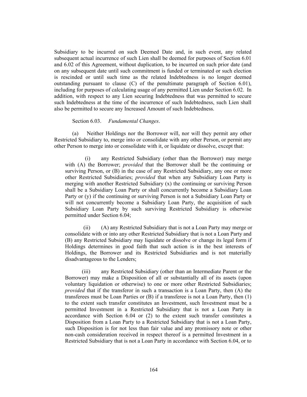 Subsidiary to be incurred on such Deemed Date and, in such event, any related subsequent actual incurrence of such Lien shall be deemed for purposes of Section 6.01 and 6.02 of this Agreement, without duplication, to be incurred on such prior date (and on any subsequent date until such commitment is funded or terminated or such election is rescinded or until such time as the related Indebtedness is no longer deemed outstanding pursuant to clause (C) of the penultimate paragraph of Section 6.01), including for purposes of calculating usage of any permitted Lien under Section 6.02. In addition, with respect to any Lien securing Indebtedness that was permitted to secure such Indebtedness at the time of the incurrence of such Indebtedness, such Lien shall also be permitted to secure any Increased Amount of such Indebtedness. Section 6.03. Fundamental Changes. (a) Neither Holdings nor the Borrower will, nor will they permit any other Restricted Subsidiary to, merge into or consolidate with any other Person, or permit any other Person to merge into or consolidate with it, or liquidate or dissolve, except that: (i) any Restricted Subsidiary (other than the Borrower) may merge with (A) the Borrower; provided that the Borrower shall be the continuing or surviving Person, or (B) in the case of any Restricted Subsidiary, any one or more other Restricted Subsidiaries; provided that when any Subsidiary Loan Party is merging with another Restricted Subsidiary (x) the continuing or surviving Person shall be a Subsidiary Loan Party or shall concurrently become a Subsidiary Loan Party or (y) if the continuing or surviving Person is not a Subsidiary Loan Party or will not concurrently become a Subsidiary Loan Party, the acquisition of such Subsidiary Loan Party by such surviving Restricted Subsidiary is otherwise permitted under Section 6.04; (ii) (A) any Restricted Subsidiary that is not a Loan Party may merge or consolidate with or into any other Restricted Subsidiary that is not a Loan Party and (B) any Restricted Subsidiary may liquidate or dissolve or change its legal form if Holdings determines in good faith that such action is in the best interests of Holdings, the Borrower and its Restricted Subsidiaries and is not materially disadvantageous to the Lenders; (iii) any Restricted Subsidiary (other than an Intermediate Parent or the Borrower) may make a Disposition of all or substantially all of its assets (upon voluntary liquidation or otherwise) to one or more other Restricted Subsidiaries; provided that if the transferor in such a transaction is a Loan Party, then (A) the transferees must be Loan Parties or (B) if a transferee is not a Loan Party, then (1) to the extent such transfer constitutes an Investment, such Investment must be a permitted Investment in a Restricted Subsidiary that is not a Loan Party in accordance with Section 6.04 or (2) to the extent such transfer constitutes a Disposition from a Loan Party to a Restricted Subsidiary that is not a Loan Party, such Disposition is for not less than fair value and any promissory note or other non-cash consideration received in respect thereof is a permitted Investment in a Restricted Subsidiary that is not a Loan Party in accordance with Section 6.04, or to 164