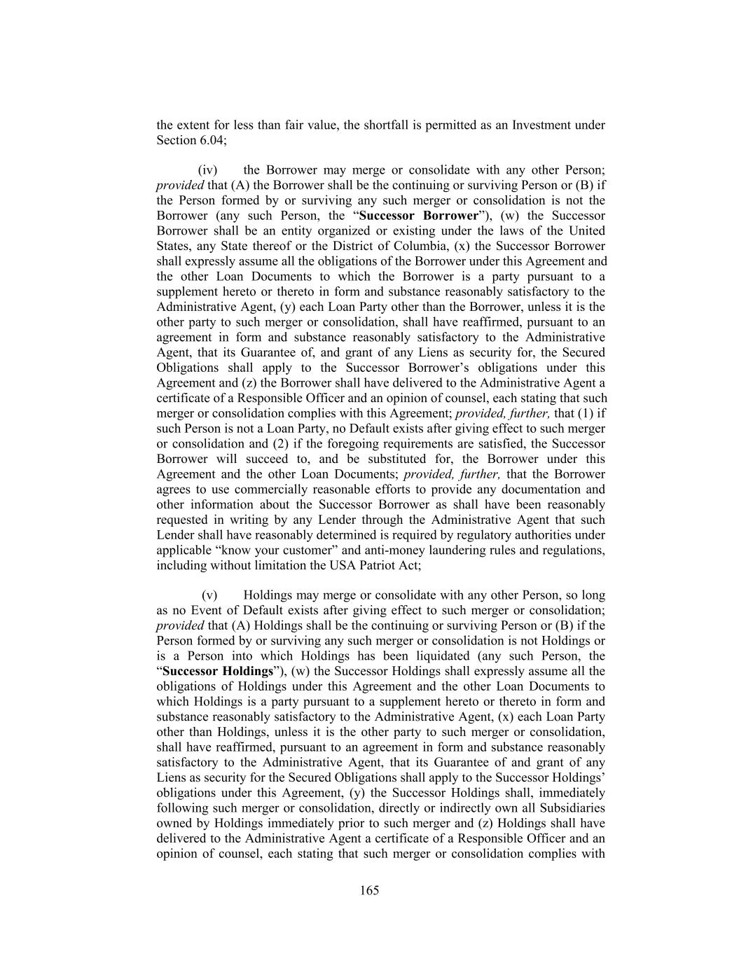 the extent for less than fair value, the shortfall is permitted as an Investment under Section 6.04; (iv) the Borrower may merge or consolidate with any other Person; provided that (A) the Borrower shall be the continuing or surviving Person or (B) if the Person formed by or surviving any such merger or consolidation is not the Borrower (any such Person, the “Successor Borrower”), (w) the Successor Borrower shall be an entity organized or existing under the laws of the United States, any State thereof or the District of Columbia, (x) the Successor Borrower shall expressly assume all the obligations of the Borrower under this Agreement and the other Loan Documents to which the Borrower is a party pursuant to a supplement hereto or thereto in form and substance reasonably satisfactory to the Administrative Agent, (y) each Loan Party other than the Borrower, unless it is the other party to such merger or consolidation, shall have reaffirmed, pursuant to an agreement in form and substance reasonably satisfactory to the Administrative Agent, that its Guarantee of, and grant of any Liens as security for, the Secured Obligations shall apply to the Successor Borrower’s obligations under this Agreement and (z) the Borrower shall have delivered to the Administrative Agent a certificate of a Responsible Officer and an opinion of counsel, each stating that such merger or consolidation complies with this Agreement; provided, further, that (1) if such Person is not a Loan Party, no Default exists after giving effect to such merger or consolidation and (2) if the foregoing requirements are satisfied, the Successor Borrower will succeed to, and be substituted for, the Borrower under this Agreement and the other Loan Documents; provided, further, that the Borrower agrees to use commercially reasonable efforts to provide any documentation and other information about the Successor Borrower as shall have been reasonably requested in writing by any Lender through the Administrative Agent that such Lender shall have reasonably determined is required by regulatory authorities under applicable “know your customer” and anti-money laundering rules and regulations, including without limitation the USA Patriot Act; (v) Holdings may merge or consolidate with any other Person, so long as no Event of Default exists after giving effect to such merger or consolidation; provided that (A) Holdings shall be the continuing or surviving Person or (B) if the Person formed by or surviving any such merger or consolidation is not Holdings or is a Person into which Holdings has been liquidated (any such Person, the “Successor Holdings”), (w) the Successor Holdings shall expressly assume all the obligations of Holdings under this Agreement and the other Loan Documents to which Holdings is a party pursuant to a supplement hereto or thereto in form and substance reasonably satisfactory to the Administrative Agent, (x) each Loan Party other than Holdings, unless it is the other party to such merger or consolidation, shall have reaffirmed, pursuant to an agreement in form and substance reasonably satisfactory to the Administrative Agent, that its Guarantee of and grant of any Liens as security for the Secured Obligations shall apply to the Successor Holdings’ obligations under this Agreement, (y) the Successor Holdings shall, immediately following such merger or consolidation, directly or indirectly own all Subsidiaries owned by Holdings immediately prior to such merger and (z) Holdings shall have delivered to the Administrative Agent a certificate of a Responsible Officer and an opinion of counsel, each stating that such merger or consolidation complies with 165