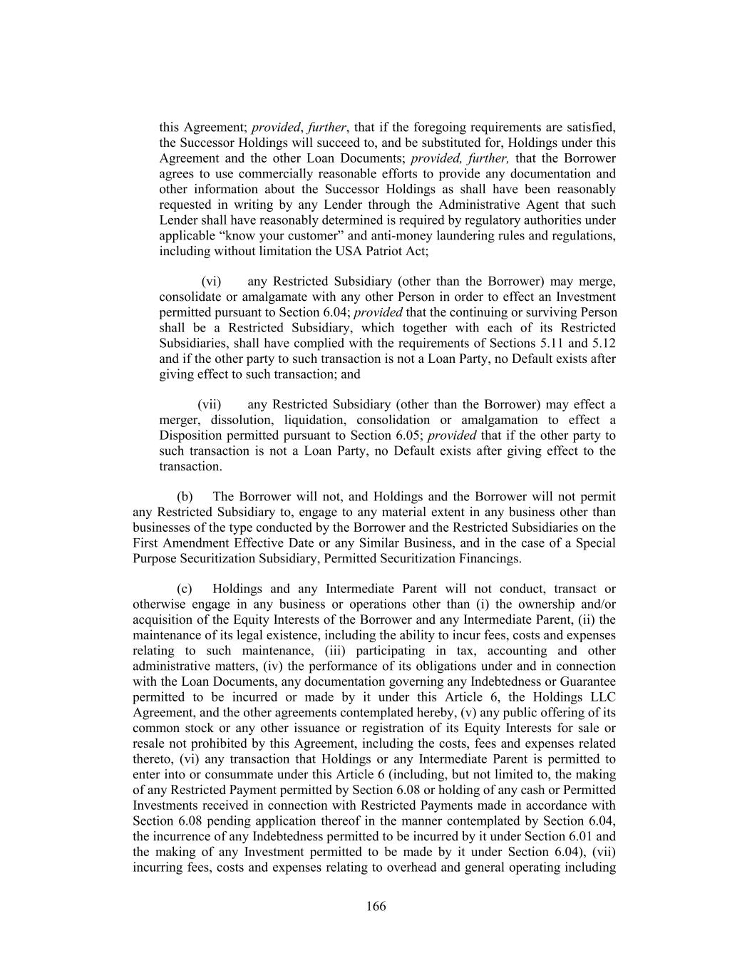 this Agreement; provided, further, that if the foregoing requirements are satisfied, the Successor Holdings will succeed to, and be substituted for, Holdings under this Agreement and the other Loan Documents; provided, further, that the Borrower agrees to use commercially reasonable efforts to provide any documentation and other information about the Successor Holdings as shall have been reasonably requested in writing by any Lender through the Administrative Agent that such Lender shall have reasonably determined is required by regulatory authorities under applicable “know your customer” and anti-money laundering rules and regulations, including without limitation the USA Patriot Act; (vi) any Restricted Subsidiary (other than the Borrower) may merge, consolidate or amalgamate with any other Person in order to effect an Investment permitted pursuant to Section 6.04; provided that the continuing or surviving Person shall be a Restricted Subsidiary, which together with each of its Restricted Subsidiaries, shall have complied with the requirements of Sections 5.11 and 5.12 and if the other party to such transaction is not a Loan Party, no Default exists after giving effect to such transaction; and (vii) any Restricted Subsidiary (other than the Borrower) may effect a merger, dissolution, liquidation, consolidation or amalgamation to effect a Disposition permitted pursuant to Section 6.05; provided that if the other party to such transaction is not a Loan Party, no Default exists after giving effect to the transaction. (b) The Borrower will not, and Holdings and the Borrower will not permit any Restricted Subsidiary to, engage to any material extent in any business other than businesses of the type conducted by the Borrower and the Restricted Subsidiaries on the First Amendment Effective Date or any Similar Business, and in the case of a Special Purpose Securitization Subsidiary, Permitted Securitization Financings. (c) Holdings and any Intermediate Parent will not conduct, transact or otherwise engage in any business or operations other than (i) the ownership and/or acquisition of the Equity Interests of the Borrower and any Intermediate Parent, (ii) the maintenance of its legal existence, including the ability to incur fees, costs and expenses relating to such maintenance, (iii) participating in tax, accounting and other administrative matters, (iv) the performance of its obligations under and in connection with the Loan Documents, any documentation governing any Indebtedness or Guarantee permitted to be incurred or made by it under this Article 6, the Holdings LLC Agreement, and the other agreements contemplated hereby, (v) any public offering of its common stock or any other issuance or registration of its Equity Interests for sale or resale not prohibited by this Agreement, including the costs, fees and expenses related thereto, (vi) any transaction that Holdings or any Intermediate Parent is permitted to enter into or consummate under this Article 6 (including, but not limited to, the making of any Restricted Payment permitted by Section 6.08 or holding of any cash or Permitted Investments received in connection with Restricted Payments made in accordance with Section 6.08 pending application thereof in the manner contemplated by Section 6.04, the incurrence of any Indebtedness permitted to be incurred by it under Section 6.01 and the making of any Investment permitted to be made by it under Section 6.04), (vii) incurring fees, costs and expenses relating to overhead and general operating including 166