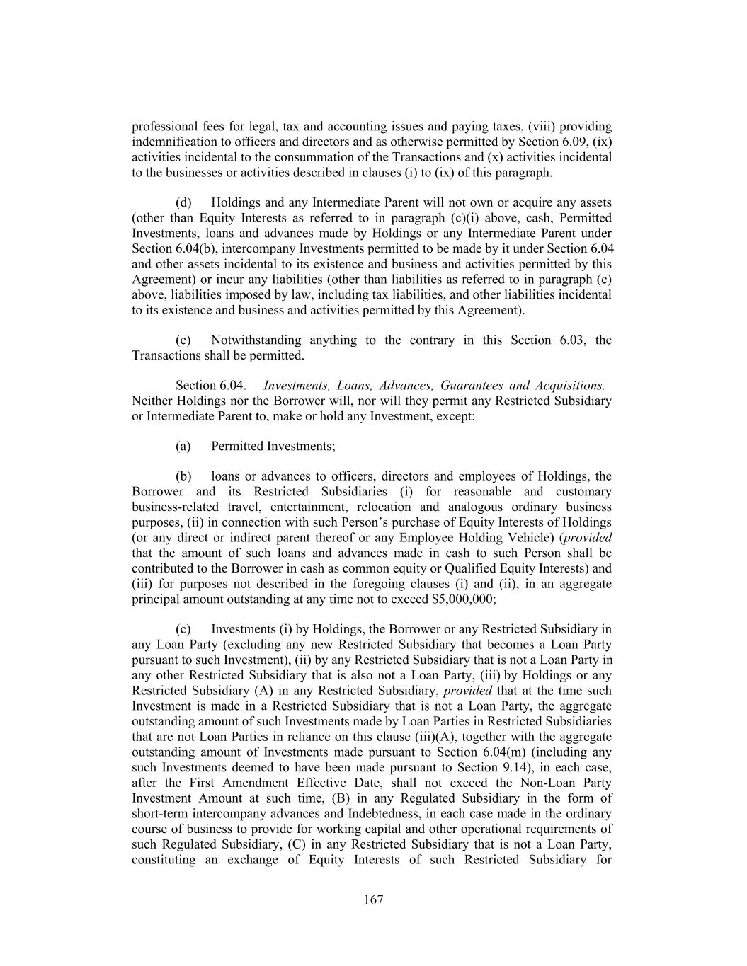 professional fees for legal, tax and accounting issues and paying taxes, (viii) providing indemnification to officers and directors and as otherwise permitted by Section 6.09, (ix) activities incidental to the consummation of the Transactions and (x) activities incidental to the businesses or activities described in clauses (i) to (ix) of this paragraph. (d) Holdings and any Intermediate Parent will not own or acquire any assets (other than Equity Interests as referred to in paragraph (c)(i) above, cash, Permitted Investments, loans and advances made by Holdings or any Intermediate Parent under Section 6.04(b), intercompany Investments permitted to be made by it under Section 6.04 and other assets incidental to its existence and business and activities permitted by this Agreement) or incur any liabilities (other than liabilities as referred to in paragraph (c) above, liabilities imposed by law, including tax liabilities, and other liabilities incidental to its existence and business and activities permitted by this Agreement). (e) Notwithstanding anything to the contrary in this Section 6.03, the Transactions shall be permitted. Section 6.04. Investments, Loans, Advances, Guarantees and Acquisitions. Neither Holdings nor the Borrower will, nor will they permit any Restricted Subsidiary or Intermediate Parent to, make or hold any Investment, except: (a) Permitted Investments; (b) loans or advances to officers, directors and employees of Holdings, the Borrower and its Restricted Subsidiaries (i) for reasonable and customary business-related travel, entertainment, relocation and analogous ordinary business purposes, (ii) in connection with such Person’s purchase of Equity Interests of Holdings (or any direct or indirect parent thereof or any Employee Holding Vehicle) (provided that the amount of such loans and advances made in cash to such Person shall be contributed to the Borrower in cash as common equity or Qualified Equity Interests) and (iii) for purposes not described in the foregoing clauses (i) and (ii), in an aggregate principal amount outstanding at any time not to exceed $5,000,000; (c) Investments (i) by Holdings, the Borrower or any Restricted Subsidiary in any Loan Party (excluding any new Restricted Subsidiary that becomes a Loan Party pursuant to such Investment), (ii) by any Restricted Subsidiary that is not a Loan Party in any other Restricted Subsidiary that is also not a Loan Party, (iii) by Holdings or any Restricted Subsidiary (A) in any Restricted Subsidiary, provided that at the time such Investment is made in a Restricted Subsidiary that is not a Loan Party, the aggregate outstanding amount of such Investments made by Loan Parties in Restricted Subsidiaries that are not Loan Parties in reliance on this clause (iii)(A), together with the aggregate outstanding amount of Investments made pursuant to Section 6.04(m) (including any such Investments deemed to have been made pursuant to Section 9.14), in each case, after the First Amendment Effective Date, shall not exceed the Non-Loan Party Investment Amount at such time, (B) in any Regulated Subsidiary in the form of short-term intercompany advances and Indebtedness, in each case made in the ordinary course of business to provide for working capital and other operational requirements of such Regulated Subsidiary, (C) in any Restricted Subsidiary that is not a Loan Party, constituting an exchange of Equity Interests of such Restricted Subsidiary for 167