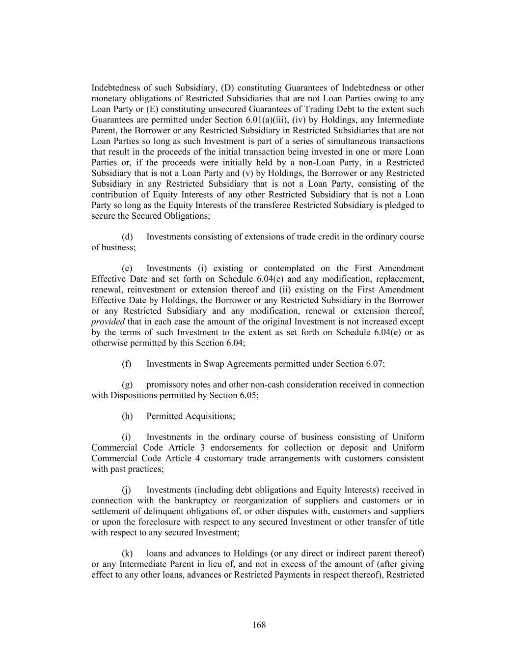 Indebtedness of such Subsidiary, (D) constituting Guarantees of Indebtedness or other monetary obligations of Restricted Subsidiaries that are not Loan Parties owing to any Loan Party or (E) constituting unsecured Guarantees of Trading Debt to the extent such Guarantees are permitted under Section 6.01(a)(iii), (iv) by Holdings, any Intermediate Parent, the Borrower or any Restricted Subsidiary in Restricted Subsidiaries that are not Loan Parties so long as such Investment is part of a series of simultaneous transactions that result in the proceeds of the initial transaction being invested in one or more Loan Parties or, if the proceeds were initially held by a non-Loan Party, in a Restricted Subsidiary that is not a Loan Party and (v) by Holdings, the Borrower or any Restricted Subsidiary in any Restricted Subsidiary that is not a Loan Party, consisting of the contribution of Equity Interests of any other Restricted Subsidiary that is not a Loan Party so long as the Equity Interests of the transferee Restricted Subsidiary is pledged to secure the Secured Obligations; (d) Investments consisting of extensions of trade credit in the ordinary course of business; (e) Investments (i) existing or contemplated on the First Amendment Effective Date and set forth on Schedule 6.04(e) and any modification, replacement, renewal, reinvestment or extension thereof and (ii) existing on the First Amendment Effective Date by Holdings, the Borrower or any Restricted Subsidiary in the Borrower or any Restricted Subsidiary and any modification, renewal or extension thereof; provided that in each case the amount of the original Investment is not increased except by the terms of such Investment to the extent as set forth on Schedule 6.04(e) or as otherwise permitted by this Section 6.04; (f) Investments in Swap Agreements permitted under Section 6.07; (g) promissory notes and other non-cash consideration received in connection with Dispositions permitted by Section 6.05; (h) Permitted Acquisitions; (i) Investments in the ordinary course of business consisting of Uniform Commercial Code Article 3 endorsements for collection or deposit and Uniform Commercial Code Article 4 customary trade arrangements with customers consistent with past practices; (j) Investments (including debt obligations and Equity Interests) received in connection with the bankruptcy or reorganization of suppliers and customers or in settlement of delinquent obligations of, or other disputes with, customers and suppliers or upon the foreclosure with respect to any secured Investment or other transfer of title with respect to any secured Investment; (k) loans and advances to Holdings (or any direct or indirect parent thereof) or any Intermediate Parent in lieu of, and not in excess of the amount of (after giving effect to any other loans, advances or Restricted Payments in respect thereof), Restricted 168