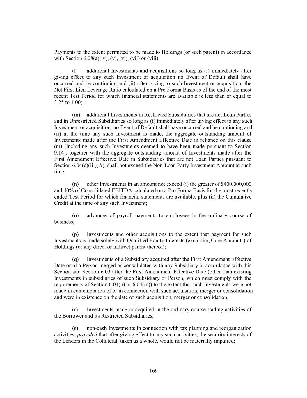 Payments to the extent permitted to be made to Holdings (or such parent) in accordance with Section 6.08(a)(iv), (v), (vi), (vii) or (viii); (l) additional Investments and acquisitions so long as (i) immediately after giving effect to any such Investment or acquisition no Event of Default shall have occurred and be continuing and (ii) after giving to such Investment or acquisition, the Net First Lien Leverage Ratio calculated on a Pro Forma Basis as of the end of the most recent Test Period for which financial statements are available is less than or equal to 3.25 to 1.00; (m) additional Investments in Restricted Subsidiaries that are not Loan Parties and in Unrestricted Subsidiaries so long as (i) immediately after giving effect to any such Investment or acquisition, no Event of Default shall have occurred and be continuing and (ii) at the time any such Investment is made, the aggregate outstanding amount of Investments made after the First Amendment Effective Date in reliance on this clause (m) (including any such Investments deemed to have been made pursuant to Section 9.14), together with the aggregate outstanding amount of Investments made after the First Amendment Effective Date in Subsidiaries that are not Loan Parties pursuant to Section 6.04(c)(iii)(A), shall not exceed the Non-Loan Party Investment Amount at such time; (n) other Investments in an amount not exceed (i) the greater of $400,000,000 and 40% of Consolidated EBITDA calculated on a Pro Forma Basis for the most recently ended Test Period for which financial statements are available, plus (ii) the Cumulative Credit at the time of any such Investment; (o) advances of payroll payments to employees in the ordinary course of business; (p) Investments and other acquisitions to the extent that payment for such Investments is made solely with Qualified Equity Interests (excluding Cure Amounts) of Holdings (or any direct or indirect parent thereof); (q) Investments of a Subsidiary acquired after the First Amendment Effective Date or of a Person merged or consolidated with any Subsidiary in accordance with this Section and Section 6.03 after the First Amendment Effective Date (other than existing Investments in subsidiaries of such Subsidiary or Person, which must comply with the requirements of Section 6.04(h) or 6.04(m)) to the extent that such Investments were not made in contemplation of or in connection with such acquisition, merger or consolidation and were in existence on the date of such acquisition, merger or consolidation; (r) Investments made or acquired in the ordinary course trading activities of the Borrower and its Restricted Subsidiaries; (s) non-cash Investments in connection with tax planning and reorganization activities; provided that after giving effect to any such activities, the security interests of the Lenders in the Collateral, taken as a whole, would not be materially impaired; 169