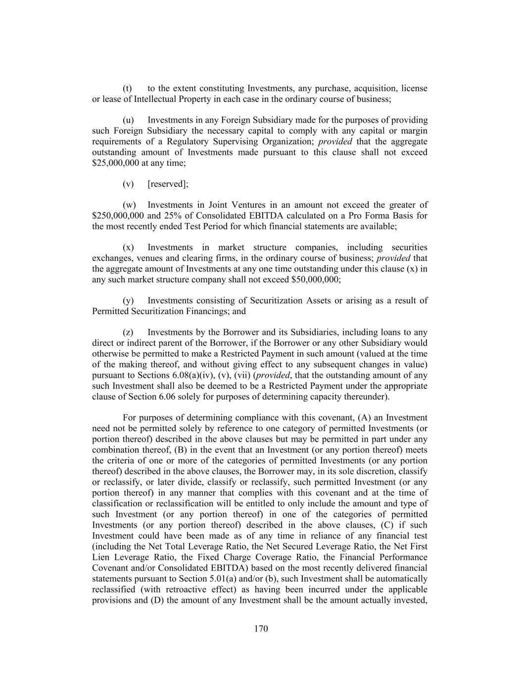 (t) to the extent constituting Investments, any purchase, acquisition, license or lease of Intellectual Property in each case in the ordinary course of business; (u) Investments in any Foreign Subsidiary made for the purposes of providing such Foreign Subsidiary the necessary capital to comply with any capital or margin requirements of a Regulatory Supervising Organization; provided that the aggregate outstanding amount of Investments made pursuant to this clause shall not exceed $25,000,000 at any time; (v) [reserved]; (w) Investments in Joint Ventures in an amount not exceed the greater of $250,000,000 and 25% of Consolidated EBITDA calculated on a Pro Forma Basis for the most recently ended Test Period for which financial statements are available; (x) Investments in market structure companies, including securities exchanges, venues and clearing firms, in the ordinary course of business; provided that the aggregate amount of Investments at any one time outstanding under this clause (x) in any such market structure company shall not exceed $50,000,000; (y) Investments consisting of Securitization Assets or arising as a result of Permitted Securitization Financings; and (z) Investments by the Borrower and its Subsidiaries, including loans to any direct or indirect parent of the Borrower, if the Borrower or any other Subsidiary would otherwise be permitted to make a Restricted Payment in such amount (valued at the time of the making thereof, and without giving effect to any subsequent changes in value) pursuant to Sections 6.08(a)(iv), (v), (vii) (provided, that the outstanding amount of any such Investment shall also be deemed to be a Restricted Payment under the appropriate clause of Section 6.06 solely for purposes of determining capacity thereunder). For purposes of determining compliance with this covenant, (A) an Investment need not be permitted solely by reference to one category of permitted Investments (or portion thereof) described in the above clauses but may be permitted in part under any combination thereof, (B) in the event that an Investment (or any portion thereof) meets the criteria of one or more of the categories of permitted Investments (or any portion thereof) described in the above clauses, the Borrower may, in its sole discretion, classify or reclassify, or later divide, classify or reclassify, such permitted Investment (or any portion thereof) in any manner that complies with this covenant and at the time of classification or reclassification will be entitled to only include the amount and type of such Investment (or any portion thereof) in one of the categories of permitted Investments (or any portion thereof) described in the above clauses, (C) if such Investment could have been made as of any time in reliance of any financial test (including the Net Total Leverage Ratio, the Net Secured Leverage Ratio, the Net First Lien Leverage Ratio, the Fixed Charge Coverage Ratio, the Financial Performance Covenant and/or Consolidated EBITDA) based on the most recently delivered financial statements pursuant to Section 5.01(a) and/or (b), such Investment shall be automatically reclassified (with retroactive effect) as having been incurred under the applicable provisions and (D) the amount of any Investment shall be the amount actually invested, 170