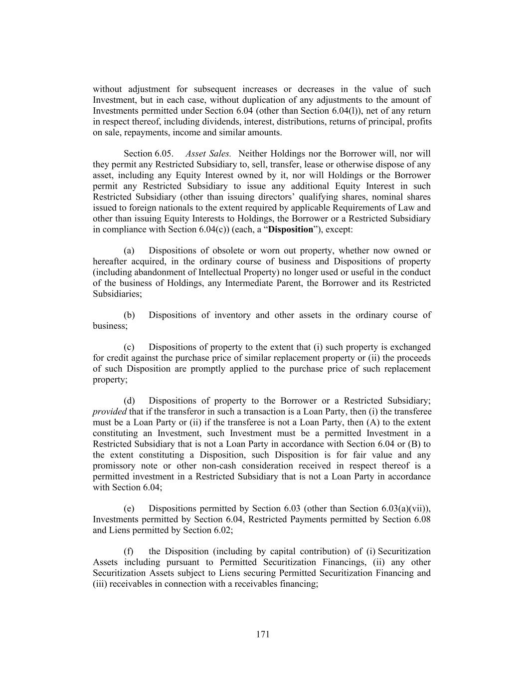 without adjustment for subsequent increases or decreases in the value of such Investment, but in each case, without duplication of any adjustments to the amount of Investments permitted under Section 6.04 (other than Section 6.04(l)), net of any return in respect thereof, including dividends, interest, distributions, returns of principal, profits on sale, repayments, income and similar amounts. Section 6.05. Asset Sales. Neither Holdings nor the Borrower will, nor will they permit any Restricted Subsidiary to, sell, transfer, lease or otherwise dispose of any asset, including any Equity Interest owned by it, nor will Holdings or the Borrower permit any Restricted Subsidiary to issue any additional Equity Interest in such Restricted Subsidiary (other than issuing directors’ qualifying shares, nominal shares issued to foreign nationals to the extent required by applicable Requirements of Law and other than issuing Equity Interests to Holdings, the Borrower or a Restricted Subsidiary in compliance with Section 6.04(c)) (each, a “Disposition”), except: (a) Dispositions of obsolete or worn out property, whether now owned or hereafter acquired, in the ordinary course of business and Dispositions of property (including abandonment of Intellectual Property) no longer used or useful in the conduct of the business of Holdings, any Intermediate Parent, the Borrower and its Restricted Subsidiaries; (b) Dispositions of inventory and other assets in the ordinary course of business; (c) Dispositions of property to the extent that (i) such property is exchanged for credit against the purchase price of similar replacement property or (ii) the proceeds of such Disposition are promptly applied to the purchase price of such replacement property; (d) Dispositions of property to the Borrower or a Restricted Subsidiary; provided that if the transferor in such a transaction is a Loan Party, then (i) the transferee must be a Loan Party or (ii) if the transferee is not a Loan Party, then (A) to the extent constituting an Investment, such Investment must be a permitted Investment in a Restricted Subsidiary that is not a Loan Party in accordance with Section 6.04 or (B) to the extent constituting a Disposition, such Disposition is for fair value and any promissory note or other non-cash consideration received in respect thereof is a permitted investment in a Restricted Subsidiary that is not a Loan Party in accordance with Section 6.04; (e) Dispositions permitted by Section 6.03 (other than Section 6.03(a)(vii)), Investments permitted by Section 6.04, Restricted Payments permitted by Section 6.08 and Liens permitted by Section 6.02; (f) the Disposition (including by capital contribution) of (i) Securitization Assets including pursuant to Permitted Securitization Financings, (ii) any other Securitization Assets subject to Liens securing Permitted Securitization Financing and (iii) receivables in connection with a receivables financing; 171