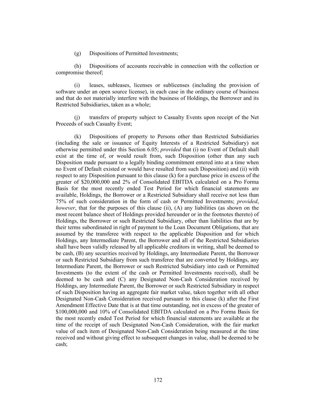 (g) Dispositions of Permitted Investments; (h) Dispositions of accounts receivable in connection with the collection or compromise thereof; (i) leases, subleases, licenses or sublicenses (including the provision of software under an open source license), in each case in the ordinary course of business and that do not materially interfere with the business of Holdings, the Borrower and its Restricted Subsidiaries, taken as a whole; (j) transfers of property subject to Casualty Events upon receipt of the Net Proceeds of such Casualty Event; (k) Dispositions of property to Persons other than Restricted Subsidiaries (including the sale or issuance of Equity Interests of a Restricted Subsidiary) not otherwise permitted under this Section 6.05; provided that (i) no Event of Default shall exist at the time of, or would result from, such Disposition (other than any such Disposition made pursuant to a legally binding commitment entered into at a time when no Event of Default existed or would have resulted from such Disposition) and (ii) with respect to any Disposition pursuant to this clause (k) for a purchase price in excess of the greater of $20,000,000 and 2% of Consolidated EBITDA calculated on a Pro Forma Basis for the most recently ended Test Period for which financial statements are available, Holdings, the Borrower or a Restricted Subsidiary shall receive not less than 75% of such consideration in the form of cash or Permitted Investments; provided, however, that for the purposes of this clause (ii), (A) any liabilities (as shown on the most recent balance sheet of Holdings provided hereunder or in the footnotes thereto) of Holdings, the Borrower or such Restricted Subsidiary, other than liabilities that are by their terms subordinated in right of payment to the Loan Document Obligations, that are assumed by the transferee with respect to the applicable Disposition and for which Holdings, any Intermediate Parent, the Borrower and all of the Restricted Subsidiaries shall have been validly released by all applicable creditors in writing, shall be deemed to be cash, (B) any securities received by Holdings, any Intermediate Parent, the Borrower or such Restricted Subsidiary from such transferee that are converted by Holdings, any Intermediate Parent, the Borrower or such Restricted Subsidiary into cash or Permitted Investments (to the extent of the cash or Permitted Investments received), shall be deemed to be cash and (C) any Designated Non-Cash Consideration received by Holdings, any Intermediate Parent, the Borrower or such Restricted Subsidiary in respect of such Disposition having an aggregate fair market value, taken together with all other Designated Non-Cash Consideration received pursuant to this clause (k) after the First Amendment Effective Date that is at that time outstanding, not in excess of the greater of $100,000,000 and 10% of Consolidated EBITDA calculated on a Pro Forma Basis for the most recently ended Test Period for which financial statements are available at the time of the receipt of such Designated Non-Cash Consideration, with the fair market value of each item of Designated Non-Cash Consideration being measured at the time received and without giving effect to subsequent changes in value, shall be deemed to be cash; 172