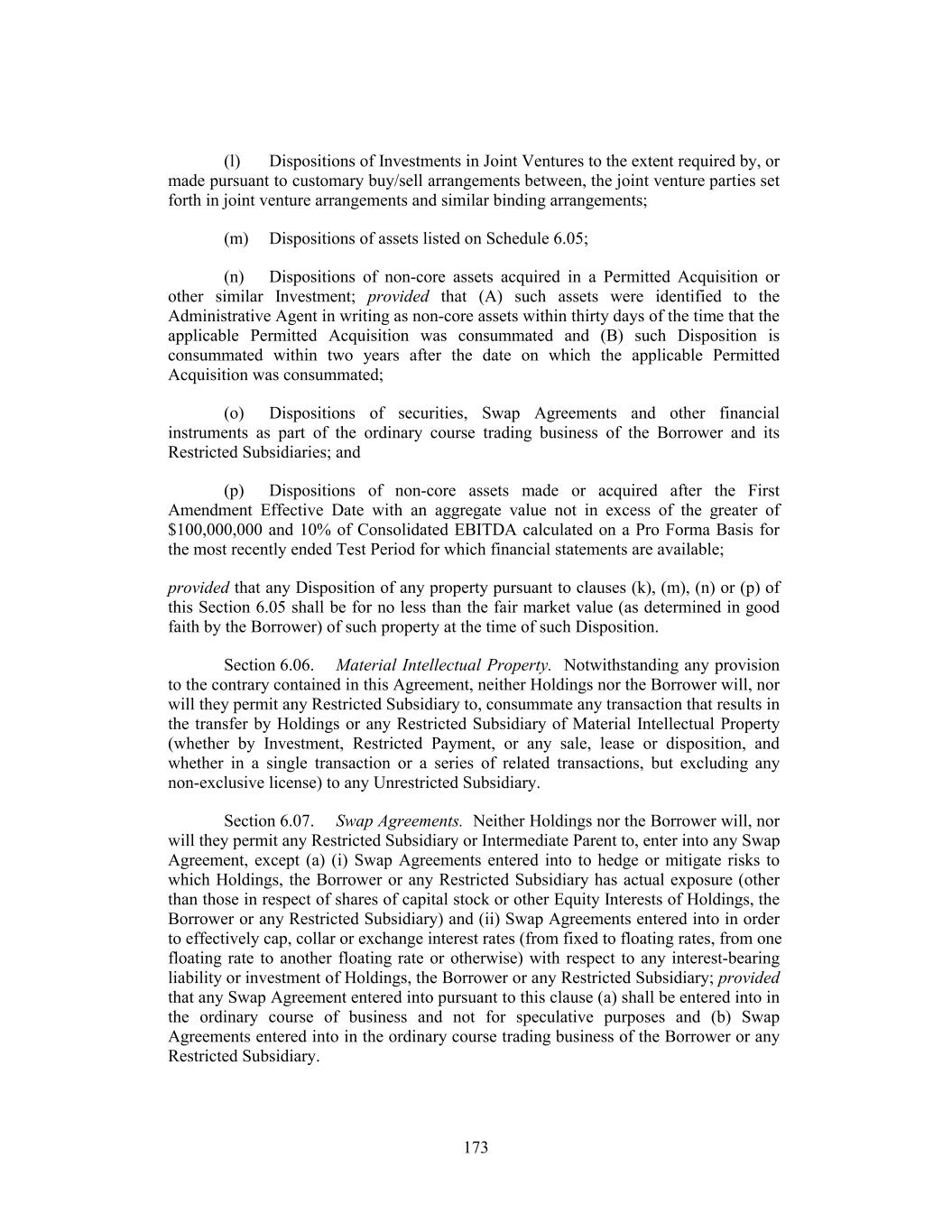 (l) Dispositions of Investments in Joint Ventures to the extent required by, or made pursuant to customary buy/sell arrangements between, the joint venture parties set forth in joint venture arrangements and similar binding arrangements; (m) Dispositions of assets listed on Schedule 6.05; (n) Dispositions of non-core assets acquired in a Permitted Acquisition or other similar Investment; provided that (A) such assets were identified to the Administrative Agent in writing as non-core assets within thirty days of the time that the applicable Permitted Acquisition was consummated and (B) such Disposition is consummated within two years after the date on which the applicable Permitted Acquisition was consummated; (o) Dispositions of securities, Swap Agreements and other financial instruments as part of the ordinary course trading business of the Borrower and its Restricted Subsidiaries; and (p) Dispositions of non-core assets made or acquired after the First Amendment Effective Date with an aggregate value not in excess of the greater of $100,000,000 and 10% of Consolidated EBITDA calculated on a Pro Forma Basis for the most recently ended Test Period for which financial statements are available; provided that any Disposition of any property pursuant to clauses (k), (m), (n) or (p) of this Section 6.05 shall be for no less than the fair market value (as determined in good faith by the Borrower) of such property at the time of such Disposition. Section 6.06. Material Intellectual Property. Notwithstanding any provision to the contrary contained in this Agreement, neither Holdings nor the Borrower will, nor will they permit any Restricted Subsidiary to, consummate any transaction that results in the transfer by Holdings or any Restricted Subsidiary of Material Intellectual Property (whether by Investment, Restricted Payment, or any sale, lease or disposition, and whether in a single transaction or a series of related transactions, but excluding any non-exclusive license) to any Unrestricted Subsidiary. Section 6.07. Swap Agreements. Neither Holdings nor the Borrower will, nor will they permit any Restricted Subsidiary or Intermediate Parent to, enter into any Swap Agreement, except (a) (i) Swap Agreements entered into to hedge or mitigate risks to which Holdings, the Borrower or any Restricted Subsidiary has actual exposure (other than those in respect of shares of capital stock or other Equity Interests of Holdings, the Borrower or any Restricted Subsidiary) and (ii) Swap Agreements entered into in order to effectively cap, collar or exchange interest rates (from fixed to floating rates, from one floating rate to another floating rate or otherwise) with respect to any interest-bearing liability or investment of Holdings, the Borrower or any Restricted Subsidiary; provided that any Swap Agreement entered into pursuant to this clause (a) shall be entered into in the ordinary course of business and not for speculative purposes and (b) Swap Agreements entered into in the ordinary course trading business of the Borrower or any Restricted Subsidiary. 173