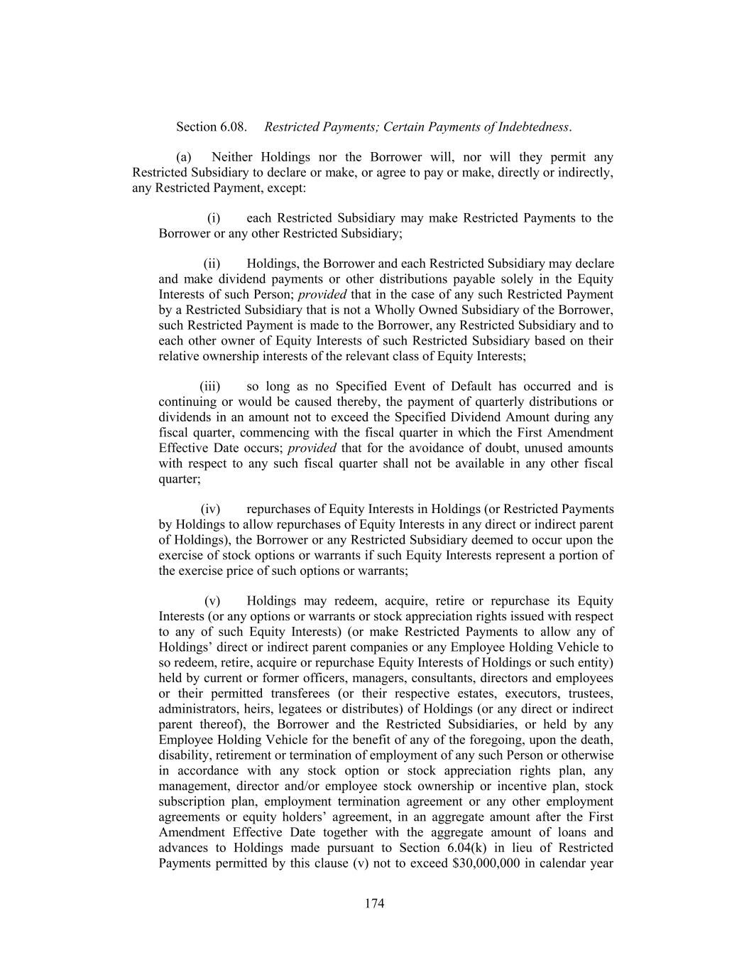 Section 6.08. Restricted Payments; Certain Payments of Indebtedness. (a) Neither Holdings nor the Borrower will, nor will they permit any Restricted Subsidiary to declare or make, or agree to pay or make, directly or indirectly, any Restricted Payment, except: (i) each Restricted Subsidiary may make Restricted Payments to the Borrower or any other Restricted Subsidiary; (ii) Holdings, the Borrower and each Restricted Subsidiary may declare and make dividend payments or other distributions payable solely in the Equity Interests of such Person; provided that in the case of any such Restricted Payment by a Restricted Subsidiary that is not a Wholly Owned Subsidiary of the Borrower, such Restricted Payment is made to the Borrower, any Restricted Subsidiary and to each other owner of Equity Interests of such Restricted Subsidiary based on their relative ownership interests of the relevant class of Equity Interests; (iii) so long as no Specified Event of Default has occurred and is continuing or would be caused thereby, the payment of quarterly distributions or dividends in an amount not to exceed the Specified Dividend Amount during any fiscal quarter, commencing with the fiscal quarter in which the First Amendment Effective Date occurs; provided that for the avoidance of doubt, unused amounts with respect to any such fiscal quarter shall not be available in any other fiscal quarter; (iv) repurchases of Equity Interests in Holdings (or Restricted Payments by Holdings to allow repurchases of Equity Interests in any direct or indirect parent of Holdings), the Borrower or any Restricted Subsidiary deemed to occur upon the exercise of stock options or warrants if such Equity Interests represent a portion of the exercise price of such options or warrants; (v) Holdings may redeem, acquire, retire or repurchase its Equity Interests (or any options or warrants or stock appreciation rights issued with respect to any of such Equity Interests) (or make Restricted Payments to allow any of Holdings’ direct or indirect parent companies or any Employee Holding Vehicle to so redeem, retire, acquire or repurchase Equity Interests of Holdings or such entity) held by current or former officers, managers, consultants, directors and employees or their permitted transferees (or their respective estates, executors, trustees, administrators, heirs, legatees or distributes) of Holdings (or any direct or indirect parent thereof), the Borrower and the Restricted Subsidiaries, or held by any Employee Holding Vehicle for the benefit of any of the foregoing, upon the death, disability, retirement or termination of employment of any such Person or otherwise in accordance with any stock option or stock appreciation rights plan, any management, director and/or employee stock ownership or incentive plan, stock subscription plan, employment termination agreement or any other employment agreements or equity holders’ agreement, in an aggregate amount after the First Amendment Effective Date together with the aggregate amount of loans and advances to Holdings made pursuant to Section 6.04(k) in lieu of Restricted Payments permitted by this clause (v) not to exceed $30,000,000 in calendar year 174