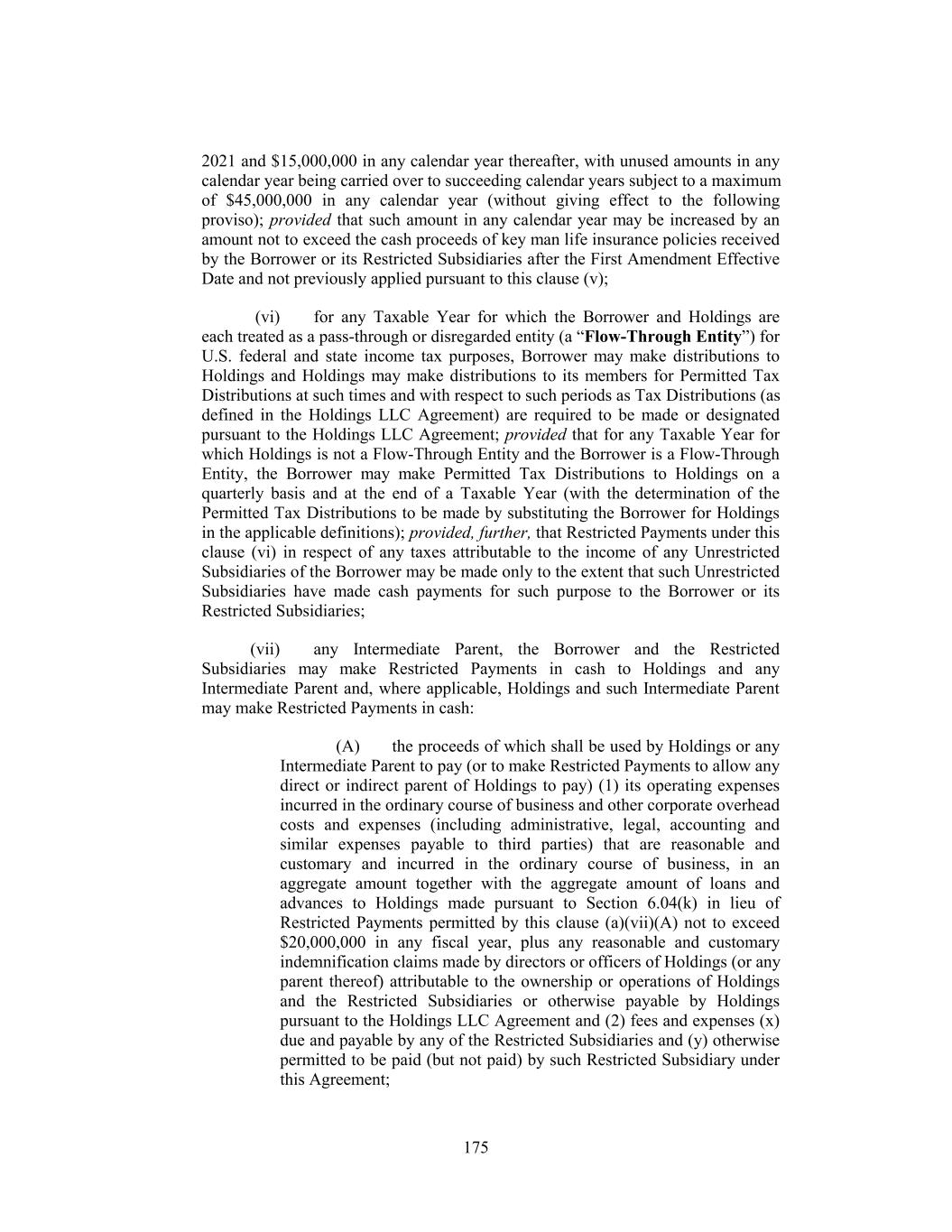 2021 and $15,000,000 in any calendar year thereafter, with unused amounts in any calendar year being carried over to succeeding calendar years subject to a maximum of $45,000,000 in any calendar year (without giving effect to the following proviso); provided that such amount in any calendar year may be increased by an amount not to exceed the cash proceeds of key man life insurance policies received by the Borrower or its Restricted Subsidiaries after the First Amendment Effective Date and not previously applied pursuant to this clause (v); (vi) for any Taxable Year for which the Borrower and Holdings are each treated as a pass-through or disregarded entity (a “Flow-Through Entity”) for U.S. federal and state income tax purposes, Borrower may make distributions to Holdings and Holdings may make distributions to its members for Permitted Tax Distributions at such times and with respect to such periods as Tax Distributions (as defined in the Holdings LLC Agreement) are required to be made or designated pursuant to the Holdings LLC Agreement; provided that for any Taxable Year for which Holdings is not a Flow-Through Entity and the Borrower is a Flow-Through Entity, the Borrower may make Permitted Tax Distributions to Holdings on a quarterly basis and at the end of a Taxable Year (with the determination of the Permitted Tax Distributions to be made by substituting the Borrower for Holdings in the applicable definitions); provided, further, that Restricted Payments under this clause (vi) in respect of any taxes attributable to the income of any Unrestricted Subsidiaries of the Borrower may be made only to the extent that such Unrestricted Subsidiaries have made cash payments for such purpose to the Borrower or its Restricted Subsidiaries; (vii) any Intermediate Parent, the Borrower and the Restricted Subsidiaries may make Restricted Payments in cash to Holdings and any Intermediate Parent and, where applicable, Holdings and such Intermediate Parent may make Restricted Payments in cash: (A) the proceeds of which shall be used by Holdings or any Intermediate Parent to pay (or to make Restricted Payments to allow any direct or indirect parent of Holdings to pay) (1) its operating expenses incurred in the ordinary course of business and other corporate overhead costs and expenses (including administrative, legal, accounting and similar expenses payable to third parties) that are reasonable and customary and incurred in the ordinary course of business, in an aggregate amount together with the aggregate amount of loans and advances to Holdings made pursuant to Section 6.04(k) in lieu of Restricted Payments permitted by this clause (a)(vii)(A) not to exceed $20,000,000 in any fiscal year, plus any reasonable and customary indemnification claims made by directors or officers of Holdings (or any parent thereof) attributable to the ownership or operations of Holdings and the Restricted Subsidiaries or otherwise payable by Holdings pursuant to the Holdings LLC Agreement and (2) fees and expenses (x) due and payable by any of the Restricted Subsidiaries and (y) otherwise permitted to be paid (but not paid) by such Restricted Subsidiary under this Agreement; 175