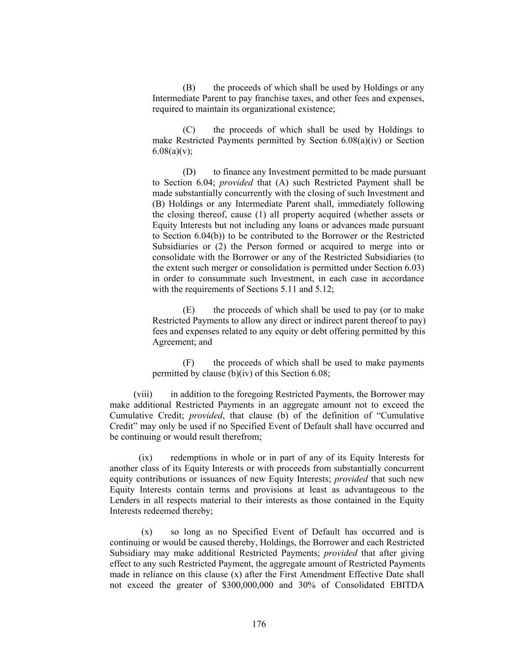 (B) the proceeds of which shall be used by Holdings or any Intermediate Parent to pay franchise taxes, and other fees and expenses, required to maintain its organizational existence; (C) the proceeds of which shall be used by Holdings to make Restricted Payments permitted by Section 6.08(a)(iv) or Section 6.08(a)(v); (D) to finance any Investment permitted to be made pursuant to Section 6.04; provided that (A) such Restricted Payment shall be made substantially concurrently with the closing of such Investment and (B) Holdings or any Intermediate Parent shall, immediately following the closing thereof, cause (1) all property acquired (whether assets or Equity Interests but not including any loans or advances made pursuant to Section 6.04(b)) to be contributed to the Borrower or the Restricted Subsidiaries or (2) the Person formed or acquired to merge into or consolidate with the Borrower or any of the Restricted Subsidiaries (to the extent such merger or consolidation is permitted under Section 6.03) in order to consummate such Investment, in each case in accordance with the requirements of Sections 5.11 and 5.12; (E) the proceeds of which shall be used to pay (or to make Restricted Payments to allow any direct or indirect parent thereof to pay) fees and expenses related to any equity or debt offering permitted by this Agreement; and (F) the proceeds of which shall be used to make payments permitted by clause (b)(iv) of this Section 6.08; (viii) in addition to the foregoing Restricted Payments, the Borrower may make additional Restricted Payments in an aggregate amount not to exceed the Cumulative Credit; provided, that clause (b) of the definition of “Cumulative Credit” may only be used if no Specified Event of Default shall have occurred and be continuing or would result therefrom; (ix) redemptions in whole or in part of any of its Equity Interests for another class of its Equity Interests or with proceeds from substantially concurrent equity contributions or issuances of new Equity Interests; provided that such new Equity Interests contain terms and provisions at least as advantageous to the Lenders in all respects material to their interests as those contained in the Equity Interests redeemed thereby; (x) so long as no Specified Event of Default has occurred and is continuing or would be caused thereby, Holdings, the Borrower and each Restricted Subsidiary may make additional Restricted Payments; provided that after giving effect to any such Restricted Payment, the aggregate amount of Restricted Payments made in reliance on this clause (x) after the First Amendment Effective Date shall not exceed the greater of $300,000,000 and 30% of Consolidated EBITDA 176