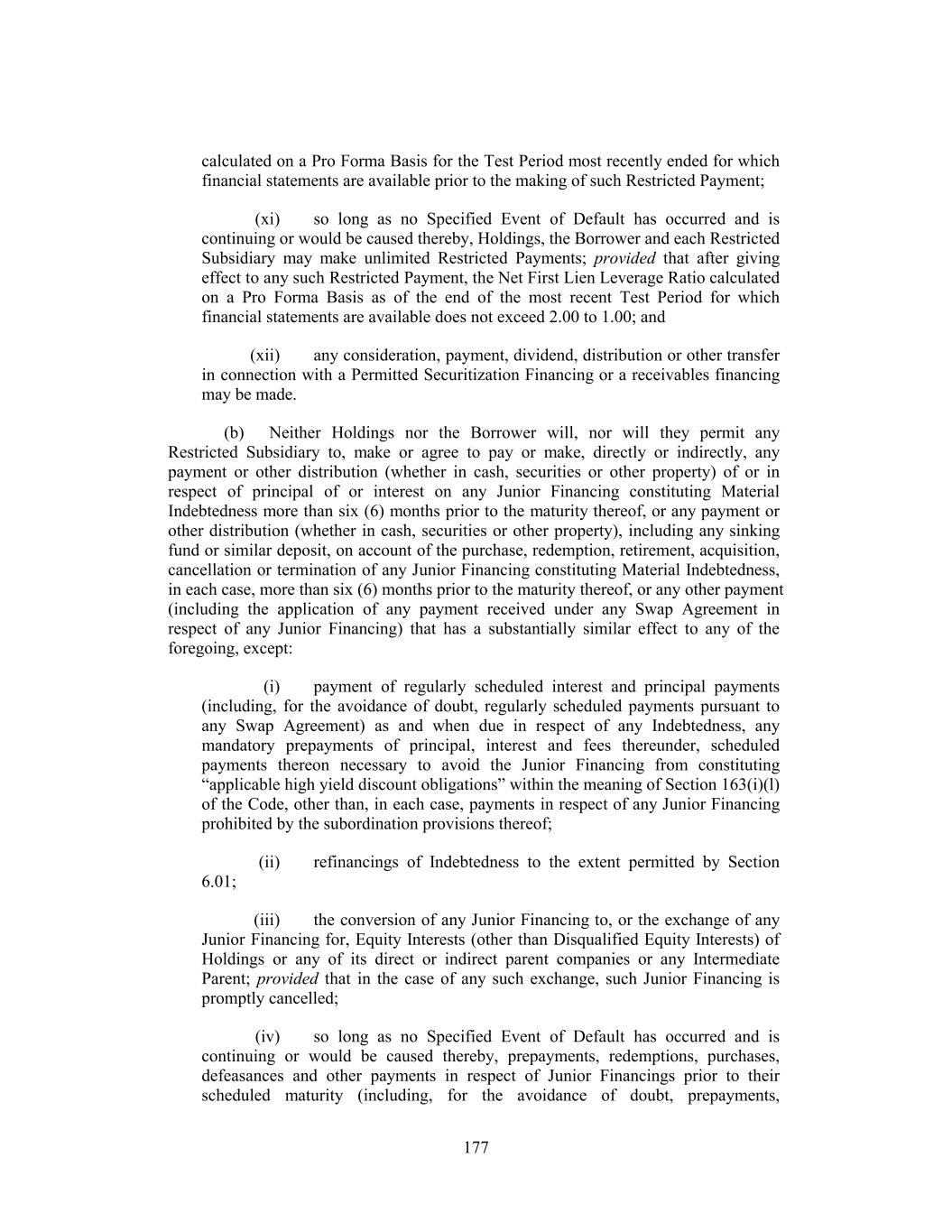 calculated on a Pro Forma Basis for the Test Period most recently ended for which financial statements are available prior to the making of such Restricted Payment; (xi) so long as no Specified Event of Default has occurred and is continuing or would be caused thereby, Holdings, the Borrower and each Restricted Subsidiary may make unlimited Restricted Payments; provided that after giving effect to any such Restricted Payment, the Net First Lien Leverage Ratio calculated on a Pro Forma Basis as of the end of the most recent Test Period for which financial statements are available does not exceed 2.00 to 1.00; and (xii) any consideration, payment, dividend, distribution or other transfer in connection with a Permitted Securitization Financing or a receivables financing may be made. (b) Neither Holdings nor the Borrower will, nor will they permit any Restricted Subsidiary to, make or agree to pay or make, directly or indirectly, any payment or other distribution (whether in cash, securities or other property) of or in respect of principal of or interest on any Junior Financing constituting Material Indebtedness more than six (6) months prior to the maturity thereof, or any payment or other distribution (whether in cash, securities or other property), including any sinking fund or similar deposit, on account of the purchase, redemption, retirement, acquisition, cancellation or termination of any Junior Financing constituting Material Indebtedness, in each case, more than six (6) months prior to the maturity thereof, or any other payment (including the application of any payment received under any Swap Agreement in respect of any Junior Financing) that has a substantially similar effect to any of the foregoing, except: (i) payment of regularly scheduled interest and principal payments (including, for the avoidance of doubt, regularly scheduled payments pursuant to any Swap Agreement) as and when due in respect of any Indebtedness, any mandatory prepayments of principal, interest and fees thereunder, scheduled payments thereon necessary to avoid the Junior Financing from constituting “applicable high yield discount obligations” within the meaning of Section 163(i)(l) of the Code, other than, in each case, payments in respect of any Junior Financing prohibited by the subordination provisions thereof; (ii) refinancings of Indebtedness to the extent permitted by Section 6.01; (iii) the conversion of any Junior Financing to, or the exchange of any Junior Financing for, Equity Interests (other than Disqualified Equity Interests) of Holdings or any of its direct or indirect parent companies or any Intermediate Parent; provided that in the case of any such exchange, such Junior Financing is promptly cancelled; (iv) so long as no Specified Event of Default has occurred and is continuing or would be caused thereby, prepayments, redemptions, purchases, defeasances and other payments in respect of Junior Financings prior to their scheduled maturity (including, for the avoidance of doubt, prepayments, 177