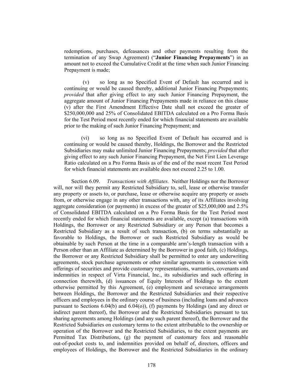 redemptions, purchases, defeasances and other payments resulting from the termination of any Swap Agreement) (“Junior Financing Prepayments”) in an amount not to exceed the Cumulative Credit at the time when such Junior Financing Prepayment is made; (v) so long as no Specified Event of Default has occurred and is continuing or would be caused thereby, additional Junior Financing Prepayments; provided that after giving effect to any such Junior Financing Prepayment, the aggregate amount of Junior Financing Prepayments made in reliance on this clause (v) after the First Amendment Effective Date shall not exceed the greater of $250,000,000 and 25% of Consolidated EBITDA calculated on a Pro Forma Basis for the Test Period most recently ended for which financial statements are available prior to the making of such Junior Financing Prepayment; and (vi) so long as no Specified Event of Default has occurred and is continuing or would be caused thereby, Holdings, the Borrower and the Restricted Subsidiaries may make unlimited Junior Financing Prepayments; provided that after giving effect to any such Junior Financing Prepayment, the Net First Lien Leverage Ratio calculated on a Pro Forma Basis as of the end of the most recent Test Period for which financial statements are available does not exceed 2.25 to 1.00. Section 6.09. Transactions with Affiliates. Neither Holdings nor the Borrower will, nor will they permit any Restricted Subsidiary to, sell, lease or otherwise transfer any property or assets to, or purchase, lease or otherwise acquire any property or assets from, or otherwise engage in any other transactions with, any of its Affiliates involving aggregate consideration (or payments) in excess of the greater of $25,000,000 and 2.5% of Consolidated EBITDA calculated on a Pro Forma Basis for the Test Period most recently ended for which financial statements are available, except (a) transactions with Holdings, the Borrower or any Restricted Subsidiary or any Person that becomes a Restricted Subsidiary as a result of such transaction, (b) on terms substantially as favorable to Holdings, the Borrower or such Restricted Subsidiary as would be obtainable by such Person at the time in a comparable arm’s-length transaction with a Person other than an Affiliate as determined by the Borrower in good faith, (c) Holdings, the Borrower or any Restricted Subsidiary shall be permitted to enter any underwriting agreements, stock purchase agreements or other similar agreements in connection with offerings of securities and provide customary representations, warranties, covenants and indemnities in respect of Virtu Financial, Inc., its subsidiaries and such offering in connection therewith, (d) issuances of Equity Interests of Holdings to the extent otherwise permitted by this Agreement, (e) employment and severance arrangements between Holdings, the Borrower and the Restricted Subsidiaries and their respective officers and employees in the ordinary course of business (including loans and advances pursuant to Sections 6.04(b) and 6.04(o)), (f) payments by Holdings (and any direct or indirect parent thereof), the Borrower and the Restricted Subsidiaries pursuant to tax sharing agreements among Holdings (and any such parent thereof), the Borrower and the Restricted Subsidiaries on customary terms to the extent attributable to the ownership or operation of the Borrower and the Restricted Subsidiaries, to the extent payments are Permitted Tax Distributions, (g) the payment of customary fees and reasonable out-of-pocket costs to, and indemnities provided on behalf of, directors, officers and employees of Holdings, the Borrower and the Restricted Subsidiaries in the ordinary 178