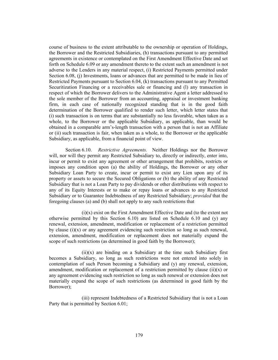 course of business to the extent attributable to the ownership or operation of Holdings, the Borrower and the Restricted Subsidiaries, (h) transactions pursuant to any permitted agreements in existence or contemplated on the First Amendment Effective Date and set forth on Schedule 6.09 or any amendment thereto to the extent such an amendment is not adverse to the Lenders in any material respect, (i) Restricted Payments permitted under Section 6.08, (j) Investments, loans or advances that are permitted to be made in lieu of Restricted Payments pursuant to Section 6.04, (k) transactions pursuant to any Permitted Securitization Financing or a receivables sale or financing and (l) any transaction in respect of which the Borrower delivers to the Administrative Agent a letter addressed to the sole member of the Borrower from an accounting, appraisal or investment banking firm, in each case of nationally recognized standing that is in the good faith determination of the Borrower qualified to render such letter, which letter states that (i) such transaction is on terms that are substantially no less favorable, when taken as a whole, to the Borrower or the applicable Subsidiary, as applicable, than would be obtained in a comparable arm’s-length transaction with a person that is not an Affiliate or (ii) such transaction is fair, when taken as a whole, to the Borrower or the applicable Subsidiary, as applicable, from a financial point of view. Section 6.10. Restrictive Agreements. Neither Holdings nor the Borrower will, nor will they permit any Restricted Subsidiary to, directly or indirectly, enter into, incur or permit to exist any agreement or other arrangement that prohibits, restricts or imposes any condition upon (a) the ability of Holdings, the Borrower or any other Subsidiary Loan Party to create, incur or permit to exist any Lien upon any of its property or assets to secure the Secured Obligations or (b) the ability of any Restricted Subsidiary that is not a Loan Party to pay dividends or other distributions with respect to any of its Equity Interests or to make or repay loans or advances to any Restricted Subsidiary or to Guarantee Indebtedness of any Restricted Subsidiary; provided that the foregoing clauses (a) and (b) shall not apply to any such restrictions that (i)(x) exist on the First Amendment Effective Date and (to the extent not otherwise permitted by this Section 6.10) are listed on Schedule 6.10 and (y) any renewal, extension, amendment, modification or replacement of a restriction permitted by clause (i)(x) or any agreement evidencing such restriction so long as such renewal, extension, amendment, modification or replacement does not materially expand the scope of such restrictions (as determined in good faith by the Borrower); (ii)(x) are binding on a Subsidiary at the time such Subsidiary first becomes a Subsidiary, so long as such restrictions were not entered into solely in contemplation of such Person becoming a Subsidiary and (y) any renewal, extension, amendment, modification or replacement of a restriction permitted by clause (ii)(x) or any agreement evidencing such restriction so long as such renewal or extension does not materially expand the scope of such restrictions (as determined in good faith by the Borrower); (iii) represent Indebtedness of a Restricted Subsidiary that is not a Loan Party that is permitted by Section 6.01; 179