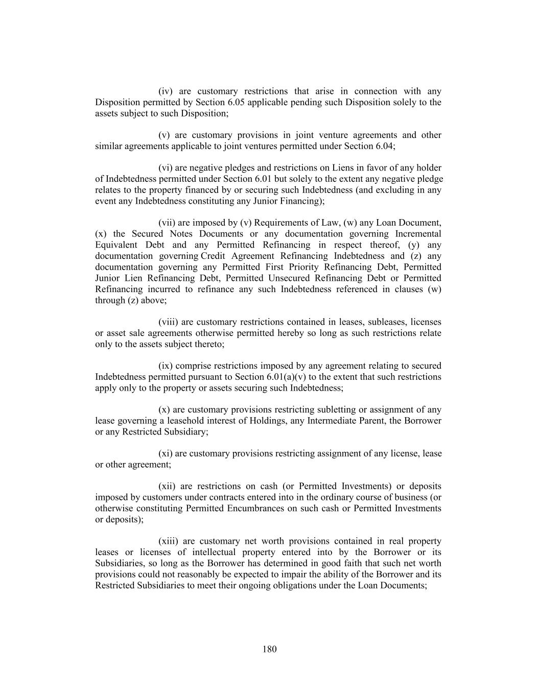 (iv) are customary restrictions that arise in connection with any Disposition permitted by Section 6.05 applicable pending such Disposition solely to the assets subject to such Disposition; (v) are customary provisions in joint venture agreements and other similar agreements applicable to joint ventures permitted under Section 6.04; (vi) are negative pledges and restrictions on Liens in favor of any holder of Indebtedness permitted under Section 6.01 but solely to the extent any negative pledge relates to the property financed by or securing such Indebtedness (and excluding in any event any Indebtedness constituting any Junior Financing); (vii) are imposed by (v) Requirements of Law, (w) any Loan Document, (x) the Secured Notes Documents or any documentation governing Incremental Equivalent Debt and any Permitted Refinancing in respect thereof, (y) any documentation governing Credit Agreement Refinancing Indebtedness and (z) any documentation governing any Permitted First Priority Refinancing Debt, Permitted Junior Lien Refinancing Debt, Permitted Unsecured Refinancing Debt or Permitted Refinancing incurred to refinance any such Indebtedness referenced in clauses (w) through (z) above; (viii) are customary restrictions contained in leases, subleases, licenses or asset sale agreements otherwise permitted hereby so long as such restrictions relate only to the assets subject thereto; (ix) comprise restrictions imposed by any agreement relating to secured Indebtedness permitted pursuant to Section 6.01(a)(v) to the extent that such restrictions apply only to the property or assets securing such Indebtedness; (x) are customary provisions restricting subletting or assignment of any lease governing a leasehold interest of Holdings, any Intermediate Parent, the Borrower or any Restricted Subsidiary; (xi) are customary provisions restricting assignment of any license, lease or other agreement; (xii) are restrictions on cash (or Permitted Investments) or deposits imposed by customers under contracts entered into in the ordinary course of business (or otherwise constituting Permitted Encumbrances on such cash or Permitted Investments or deposits); (xiii) are customary net worth provisions contained in real property leases or licenses of intellectual property entered into by the Borrower or its Subsidiaries, so long as the Borrower has determined in good faith that such net worth provisions could not reasonably be expected to impair the ability of the Borrower and its Restricted Subsidiaries to meet their ongoing obligations under the Loan Documents; 180