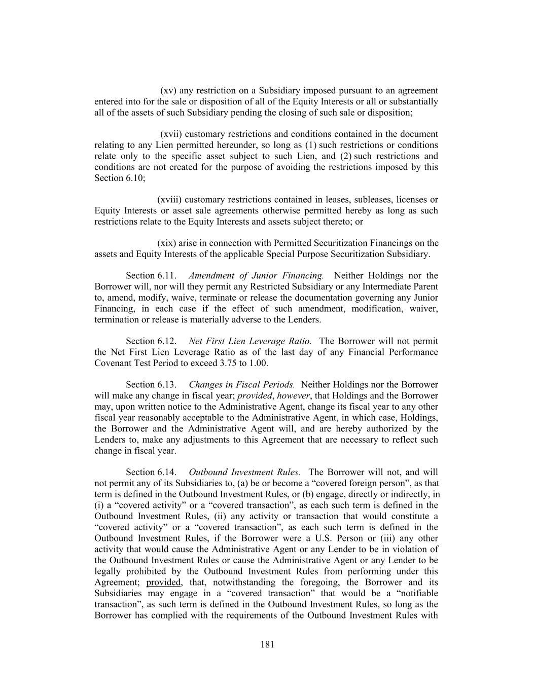 (xv) any restriction on a Subsidiary imposed pursuant to an agreement entered into for the sale or disposition of all of the Equity Interests or all or substantially all of the assets of such Subsidiary pending the closing of such sale or disposition; (xvii) customary restrictions and conditions contained in the document relating to any Lien permitted hereunder, so long as (1) such restrictions or conditions relate only to the specific asset subject to such Lien, and (2) such restrictions and conditions are not created for the purpose of avoiding the restrictions imposed by this Section 6.10; (xviii) customary restrictions contained in leases, subleases, licenses or Equity Interests or asset sale agreements otherwise permitted hereby as long as such restrictions relate to the Equity Interests and assets subject thereto; or (xix) arise in connection with Permitted Securitization Financings on the assets and Equity Interests of the applicable Special Purpose Securitization Subsidiary. Section 6.11. Amendment of Junior Financing. Neither Holdings nor the Borrower will, nor will they permit any Restricted Subsidiary or any Intermediate Parent to, amend, modify, waive, terminate or release the documentation governing any Junior Financing, in each case if the effect of such amendment, modification, waiver, termination or release is materially adverse to the Lenders. Section 6.12. Net First Lien Leverage Ratio. The Borrower will not permit the Net First Lien Leverage Ratio as of the last day of any Financial Performance Covenant Test Period to exceed 3.75 to 1.00. Section 6.13. Changes in Fiscal Periods. Neither Holdings nor the Borrower will make any change in fiscal year; provided, however, that Holdings and the Borrower may, upon written notice to the Administrative Agent, change its fiscal year to any other fiscal year reasonably acceptable to the Administrative Agent, in which case, Holdings, the Borrower and the Administrative Agent will, and are hereby authorized by the Lenders to, make any adjustments to this Agreement that are necessary to reflect such change in fiscal year. Section 6.14. Outbound Investment Rules. The Borrower will not, and will not permit any of its Subsidiaries to, (a) be or become a “covered foreign person”, as that term is defined in the Outbound Investment Rules, or (b) engage, directly or indirectly, in (i) a “covered activity” or a “covered transaction”, as each such term is defined in the Outbound Investment Rules, (ii) any activity or transaction that would constitute a “covered activity” or a “covered transaction”, as each such term is defined in the Outbound Investment Rules, if the Borrower were a U.S. Person or (iii) any other activity that would cause the Administrative Agent or any Lender to be in violation of the Outbound Investment Rules or cause the Administrative Agent or any Lender to be legally prohibited by the Outbound Investment Rules from performing under this Agreement; provided, that, notwithstanding the foregoing, the Borrower and its Subsidiaries may engage in a “covered transaction” that would be a “notifiable transaction”, as such term is defined in the Outbound Investment Rules, so long as the Borrower has complied with the requirements of the Outbound Investment Rules with 181