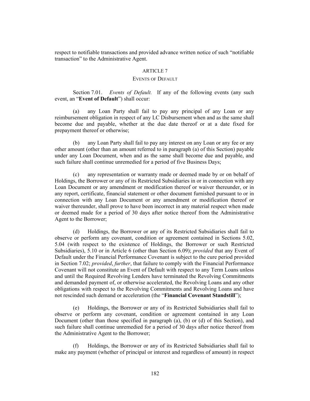 respect to notifiable transactions and provided advance written notice of such “notifiable transaction” to the Administrative Agent. ARTICLE 7 EVENTS OF DEFAULT Section 7.01. Events of Default. If any of the following events (any such event, an “Event of Default”) shall occur: (a) any Loan Party shall fail to pay any principal of any Loan or any reimbursement obligation in respect of any LC Disbursement when and as the same shall become due and payable, whether at the due date thereof or at a date fixed for prepayment thereof or otherwise; (b) any Loan Party shall fail to pay any interest on any Loan or any fee or any other amount (other than an amount referred to in paragraph (a) of this Section) payable under any Loan Document, when and as the same shall become due and payable, and such failure shall continue unremedied for a period of five Business Days; (c) any representation or warranty made or deemed made by or on behalf of Holdings, the Borrower or any of its Restricted Subsidiaries in or in connection with any Loan Document or any amendment or modification thereof or waiver thereunder, or in any report, certificate, financial statement or other document furnished pursuant to or in connection with any Loan Document or any amendment or modification thereof or waiver thereunder, shall prove to have been incorrect in any material respect when made or deemed made for a period of 30 days after notice thereof from the Administrative Agent to the Borrower; (d) Holdings, the Borrower or any of its Restricted Subsidiaries shall fail to observe or perform any covenant, condition or agreement contained in Sections 5.02, 5.04 (with respect to the existence of Holdings, the Borrower or such Restricted Subsidiaries), 5.10 or in Article 6 (other than Section 6.09); provided that any Event of Default under the Financial Performance Covenant is subject to the cure period provided in Section 7.02; provided, further, that failure to comply with the Financial Performance Covenant will not constitute an Event of Default with respect to any Term Loans unless and until the Required Revolving Lenders have terminated the Revolving Commitments and demanded payment of, or otherwise accelerated, the Revolving Loans and any other obligations with respect to the Revolving Commitments and Revolving Loans and have not rescinded such demand or acceleration (the “Financial Covenant Standstill”); (e) Holdings, the Borrower or any of its Restricted Subsidiaries shall fail to observe or perform any covenant, condition or agreement contained in any Loan Document (other than those specified in paragraph (a), (b) or (d) of this Section), and such failure shall continue unremedied for a period of 30 days after notice thereof from the Administrative Agent to the Borrower; (f) Holdings, the Borrower or any of its Restricted Subsidiaries shall fail to make any payment (whether of principal or interest and regardless of amount) in respect 182