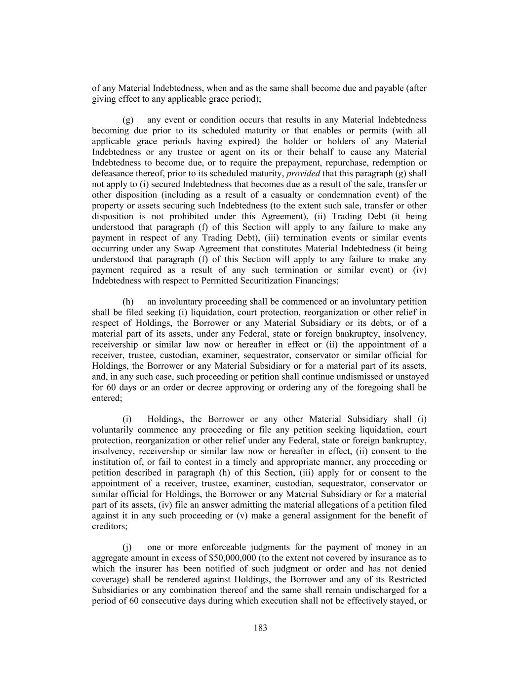 of any Material Indebtedness, when and as the same shall become due and payable (after giving effect to any applicable grace period); (g) any event or condition occurs that results in any Material Indebtedness becoming due prior to its scheduled maturity or that enables or permits (with all applicable grace periods having expired) the holder or holders of any Material Indebtedness or any trustee or agent on its or their behalf to cause any Material Indebtedness to become due, or to require the prepayment, repurchase, redemption or defeasance thereof, prior to its scheduled maturity, provided that this paragraph (g) shall not apply to (i) secured Indebtedness that becomes due as a result of the sale, transfer or other disposition (including as a result of a casualty or condemnation event) of the property or assets securing such Indebtedness (to the extent such sale, transfer or other disposition is not prohibited under this Agreement), (ii) Trading Debt (it being understood that paragraph (f) of this Section will apply to any failure to make any payment in respect of any Trading Debt), (iii) termination events or similar events occurring under any Swap Agreement that constitutes Material Indebtedness (it being understood that paragraph (f) of this Section will apply to any failure to make any payment required as a result of any such termination or similar event) or (iv) Indebtedness with respect to Permitted Securitization Financings; (h) an involuntary proceeding shall be commenced or an involuntary petition shall be filed seeking (i) liquidation, court protection, reorganization or other relief in respect of Holdings, the Borrower or any Material Subsidiary or its debts, or of a material part of its assets, under any Federal, state or foreign bankruptcy, insolvency, receivership or similar law now or hereafter in effect or (ii) the appointment of a receiver, trustee, custodian, examiner, sequestrator, conservator or similar official for Holdings, the Borrower or any Material Subsidiary or for a material part of its assets, and, in any such case, such proceeding or petition shall continue undismissed or unstayed for 60 days or an order or decree approving or ordering any of the foregoing shall be entered; (i) Holdings, the Borrower or any other Material Subsidiary shall (i) voluntarily commence any proceeding or file any petition seeking liquidation, court protection, reorganization or other relief under any Federal, state or foreign bankruptcy, insolvency, receivership or similar law now or hereafter in effect, (ii) consent to the institution of, or fail to contest in a timely and appropriate manner, any proceeding or petition described in paragraph (h) of this Section, (iii) apply for or consent to the appointment of a receiver, trustee, examiner, custodian, sequestrator, conservator or similar official for Holdings, the Borrower or any Material Subsidiary or for a material part of its assets, (iv) file an answer admitting the material allegations of a petition filed against it in any such proceeding or (v) make a general assignment for the benefit of creditors; (j) one or more enforceable judgments for the payment of money in an aggregate amount in excess of $50,000,000 (to the extent not covered by insurance as to which the insurer has been notified of such judgment or order and has not denied coverage) shall be rendered against Holdings, the Borrower and any of its Restricted Subsidiaries or any combination thereof and the same shall remain undischarged for a period of 60 consecutive days during which execution shall not be effectively stayed, or 183