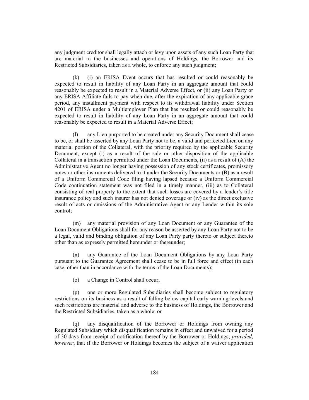 any judgment creditor shall legally attach or levy upon assets of any such Loan Party that are material to the businesses and operations of Holdings, the Borrower and its Restricted Subsidiaries, taken as a whole, to enforce any such judgment; (k) (i) an ERISA Event occurs that has resulted or could reasonably be expected to result in liability of any Loan Party in an aggregate amount that could reasonably be expected to result in a Material Adverse Effect, or (ii) any Loan Party or any ERISA Affiliate fails to pay when due, after the expiration of any applicable grace period, any installment payment with respect to its withdrawal liability under Section 4201 of ERISA under a Multiemployer Plan that has resulted or could reasonably be expected to result in liability of any Loan Party in an aggregate amount that could reasonably be expected to result in a Material Adverse Effect; (l) any Lien purported to be created under any Security Document shall cease to be, or shall be asserted by any Loan Party not to be, a valid and perfected Lien on any material portion of the Collateral, with the priority required by the applicable Security Document, except (i) as a result of the sale or other disposition of the applicable Collateral in a transaction permitted under the Loan Documents, (ii) as a result of (A) the Administrative Agent no longer having possession of any stock certificates, promissory notes or other instruments delivered to it under the Security Documents or (B) as a result of a Uniform Commercial Code filing having lapsed because a Uniform Commercial Code continuation statement was not filed in a timely manner, (iii) as to Collateral consisting of real property to the extent that such losses are covered by a lender’s title insurance policy and such insurer has not denied coverage or (iv) as the direct exclusive result of acts or omissions of the Administrative Agent or any Lender within its sole control; (m) any material provision of any Loan Document or any Guarantee of the Loan Document Obligations shall for any reason be asserted by any Loan Party not to be a legal, valid and binding obligation of any Loan Party party thereto or subject thereto other than as expressly permitted hereunder or thereunder; (n) any Guarantee of the Loan Document Obligations by any Loan Party pursuant to the Guarantee Agreement shall cease to be in full force and effect (in each case, other than in accordance with the terms of the Loan Documents); (o) a Change in Control shall occur; (p) one or more Regulated Subsidiaries shall become subject to regulatory restrictions on its business as a result of falling below capital early warning levels and such restrictions are material and adverse to the business of Holdings, the Borrower and the Restricted Subsidiaries, taken as a whole; or (q) any disqualification of the Borrower or Holdings from owning any Regulated Subsidiary which disqualification remains in effect and unwaived for a period of 30 days from receipt of notification thereof by the Borrower or Holdings; provided, however, that if the Borrower or Holdings becomes the subject of a waiver application 184