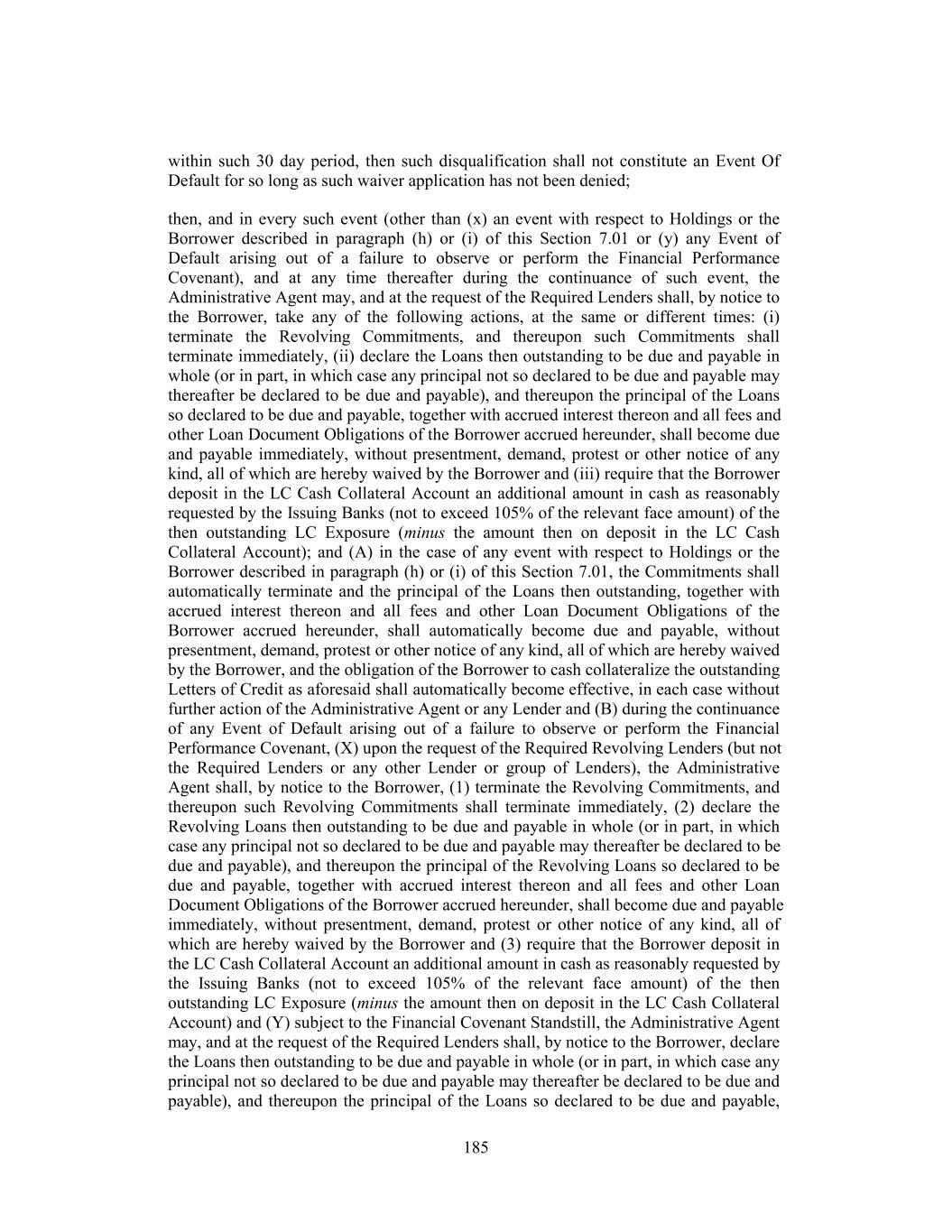 within such 30 day period, then such disqualification shall not constitute an Event Of Default for so long as such waiver application has not been denied; then, and in every such event (other than (x) an event with respect to Holdings or the Borrower described in paragraph (h) or (i) of this Section 7.01 or (y) any Event of Default arising out of a failure to observe or perform the Financial Performance Covenant), and at any time thereafter during the continuance of such event, the Administrative Agent may, and at the request of the Required Lenders shall, by notice to the Borrower, take any of the following actions, at the same or different times: (i) terminate the Revolving Commitments, and thereupon such Commitments shall terminate immediately, (ii) declare the Loans then outstanding to be due and payable in whole (or in part, in which case any principal not so declared to be due and payable may thereafter be declared to be due and payable), and thereupon the principal of the Loans so declared to be due and payable, together with accrued interest thereon and all fees and other Loan Document Obligations of the Borrower accrued hereunder, shall become due and payable immediately, without presentment, demand, protest or other notice of any kind, all of which are hereby waived by the Borrower and (iii) require that the Borrower deposit in the LC Cash Collateral Account an additional amount in cash as reasonably requested by the Issuing Banks (not to exceed 105% of the relevant face amount) of the then outstanding LC Exposure (minus the amount then on deposit in the LC Cash Collateral Account); and (A) in the case of any event with respect to Holdings or the Borrower described in paragraph (h) or (i) of this Section 7.01, the Commitments shall automatically terminate and the principal of the Loans then outstanding, together with accrued interest thereon and all fees and other Loan Document Obligations of the Borrower accrued hereunder, shall automatically become due and payable, without presentment, demand, protest or other notice of any kind, all of which are hereby waived by the Borrower, and the obligation of the Borrower to cash collateralize the outstanding Letters of Credit as aforesaid shall automatically become effective, in each case without further action of the Administrative Agent or any Lender and (B) during the continuance of any Event of Default arising out of a failure to observe or perform the Financial Performance Covenant, (X) upon the request of the Required Revolving Lenders (but not the Required Lenders or any other Lender or group of Lenders), the Administrative Agent shall, by notice to the Borrower, (1) terminate the Revolving Commitments, and thereupon such Revolving Commitments shall terminate immediately, (2) declare the Revolving Loans then outstanding to be due and payable in whole (or in part, in which case any principal not so declared to be due and payable may thereafter be declared to be due and payable), and thereupon the principal of the Revolving Loans so declared to be due and payable, together with accrued interest thereon and all fees and other Loan Document Obligations of the Borrower accrued hereunder, shall become due and payable immediately, without presentment, demand, protest or other notice of any kind, all of which are hereby waived by the Borrower and (3) require that the Borrower deposit in the LC Cash Collateral Account an additional amount in cash as reasonably requested by the Issuing Banks (not to exceed 105% of the relevant face amount) of the then outstanding LC Exposure (minus the amount then on deposit in the LC Cash Collateral Account) and (Y) subject to the Financial Covenant Standstill, the Administrative Agent may, and at the request of the Required Lenders shall, by notice to the Borrower, declare the Loans then outstanding to be due and payable in whole (or in part, in which case any principal not so declared to be due and payable may thereafter be declared to be due and payable), and thereupon the principal of the Loans so declared to be due and payable, 185