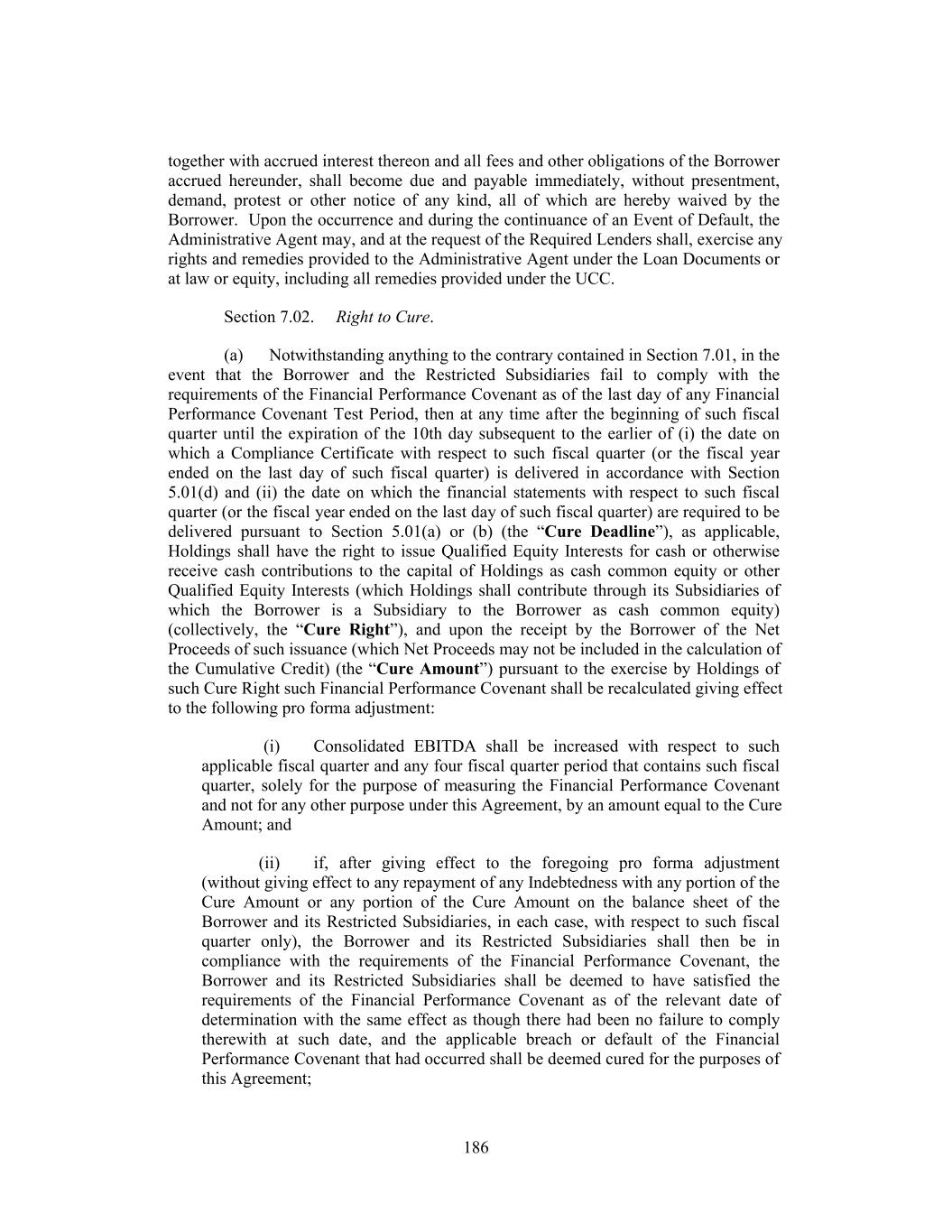 together with accrued interest thereon and all fees and other obligations of the Borrower accrued hereunder, shall become due and payable immediately, without presentment, demand, protest or other notice of any kind, all of which are hereby waived by the Borrower. Upon the occurrence and during the continuance of an Event of Default, the Administrative Agent may, and at the request of the Required Lenders shall, exercise any rights and remedies provided to the Administrative Agent under the Loan Documents or at law or equity, including all remedies provided under the UCC. Section 7.02. Right to Cure. (a) Notwithstanding anything to the contrary contained in Section 7.01, in the event that the Borrower and the Restricted Subsidiaries fail to comply with the requirements of the Financial Performance Covenant as of the last day of any Financial Performance Covenant Test Period, then at any time after the beginning of such fiscal quarter until the expiration of the 10th day subsequent to the earlier of (i) the date on which a Compliance Certificate with respect to such fiscal quarter (or the fiscal year ended on the last day of such fiscal quarter) is delivered in accordance with Section 5.01(d) and (ii) the date on which the financial statements with respect to such fiscal quarter (or the fiscal year ended on the last day of such fiscal quarter) are required to be delivered pursuant to Section 5.01(a) or (b) (the “Cure Deadline”), as applicable, Holdings shall have the right to issue Qualified Equity Interests for cash or otherwise receive cash contributions to the capital of Holdings as cash common equity or other Qualified Equity Interests (which Holdings shall contribute through its Subsidiaries of which the Borrower is a Subsidiary to the Borrower as cash common equity) (collectively, the “Cure Right”), and upon the receipt by the Borrower of the Net Proceeds of such issuance (which Net Proceeds may not be included in the calculation of the Cumulative Credit) (the “Cure Amount”) pursuant to the exercise by Holdings of such Cure Right such Financial Performance Covenant shall be recalculated giving effect to the following pro forma adjustment: (i) Consolidated EBITDA shall be increased with respect to such applicable fiscal quarter and any four fiscal quarter period that contains such fiscal quarter, solely for the purpose of measuring the Financial Performance Covenant and not for any other purpose under this Agreement, by an amount equal to the Cure Amount; and (ii) if, after giving effect to the foregoing pro forma adjustment (without giving effect to any repayment of any Indebtedness with any portion of the Cure Amount or any portion of the Cure Amount on the balance sheet of the Borrower and its Restricted Subsidiaries, in each case, with respect to such fiscal quarter only), the Borrower and its Restricted Subsidiaries shall then be in compliance with the requirements of the Financial Performance Covenant, the Borrower and its Restricted Subsidiaries shall be deemed to have satisfied the requirements of the Financial Performance Covenant as of the relevant date of determination with the same effect as though there had been no failure to comply therewith at such date, and the applicable breach or default of the Financial Performance Covenant that had occurred shall be deemed cured for the purposes of this Agreement; 186
