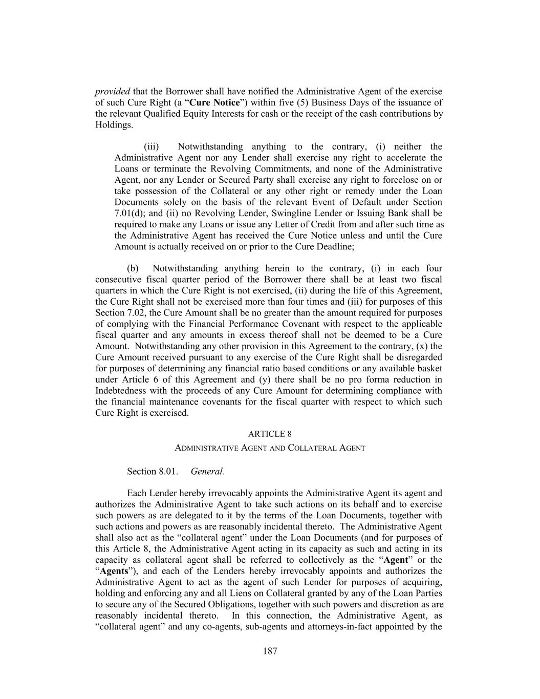 provided that the Borrower shall have notified the Administrative Agent of the exercise of such Cure Right (a “Cure Notice”) within five (5) Business Days of the issuance of the relevant Qualified Equity Interests for cash or the receipt of the cash contributions by Holdings. (iii) Notwithstanding anything to the contrary, (i) neither the Administrative Agent nor any Lender shall exercise any right to accelerate the Loans or terminate the Revolving Commitments, and none of the Administrative Agent, nor any Lender or Secured Party shall exercise any right to foreclose on or take possession of the Collateral or any other right or remedy under the Loan Documents solely on the basis of the relevant Event of Default under Section 7.01(d); and (ii) no Revolving Lender, Swingline Lender or Issuing Bank shall be required to make any Loans or issue any Letter of Credit from and after such time as the Administrative Agent has received the Cure Notice unless and until the Cure Amount is actually received on or prior to the Cure Deadline; (b) Notwithstanding anything herein to the contrary, (i) in each four consecutive fiscal quarter period of the Borrower there shall be at least two fiscal quarters in which the Cure Right is not exercised, (ii) during the life of this Agreement, the Cure Right shall not be exercised more than four times and (iii) for purposes of this Section 7.02, the Cure Amount shall be no greater than the amount required for purposes of complying with the Financial Performance Covenant with respect to the applicable fiscal quarter and any amounts in excess thereof shall not be deemed to be a Cure Amount. Notwithstanding any other provision in this Agreement to the contrary, (x) the Cure Amount received pursuant to any exercise of the Cure Right shall be disregarded for purposes of determining any financial ratio based conditions or any available basket under Article 6 of this Agreement and (y) there shall be no pro forma reduction in Indebtedness with the proceeds of any Cure Amount for determining compliance with the financial maintenance covenants for the fiscal quarter with respect to which such Cure Right is exercised. ARTICLE 8 ADMINISTRATIVE AGENT AND COLLATERAL AGENT Section 8.01. General. Each Lender hereby irrevocably appoints the Administrative Agent its agent and authorizes the Administrative Agent to take such actions on its behalf and to exercise such powers as are delegated to it by the terms of the Loan Documents, together with such actions and powers as are reasonably incidental thereto. The Administrative Agent shall also act as the “collateral agent” under the Loan Documents (and for purposes of this Article 8, the Administrative Agent acting in its capacity as such and acting in its capacity as collateral agent shall be referred to collectively as the “Agent” or the “Agents”), and each of the Lenders hereby irrevocably appoints and authorizes the Administrative Agent to act as the agent of such Lender for purposes of acquiring, holding and enforcing any and all Liens on Collateral granted by any of the Loan Parties to secure any of the Secured Obligations, together with such powers and discretion as are reasonably incidental thereto. In this connection, the Administrative Agent, as “collateral agent” and any co-agents, sub-agents and attorneys-in-fact appointed by the 187
