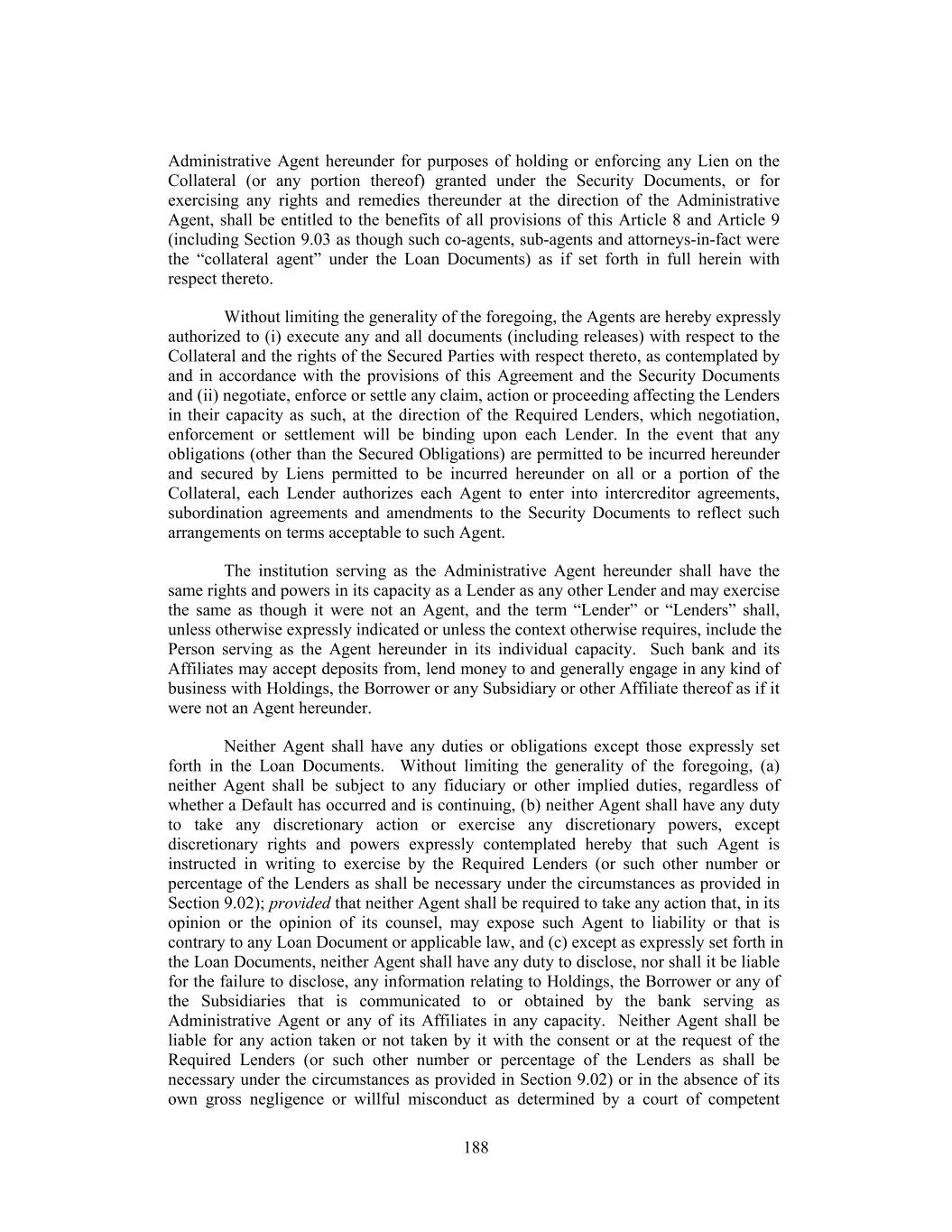 Administrative Agent hereunder for purposes of holding or enforcing any Lien on the Collateral (or any portion thereof) granted under the Security Documents, or for exercising any rights and remedies thereunder at the direction of the Administrative Agent, shall be entitled to the benefits of all provisions of this Article 8 and Article 9 (including Section 9.03 as though such co-agents, sub-agents and attorneys-in-fact were the “collateral agent” under the Loan Documents) as if set forth in full herein with respect thereto. Without limiting the generality of the foregoing, the Agents are hereby expressly authorized to (i) execute any and all documents (including releases) with respect to the Collateral and the rights of the Secured Parties with respect thereto, as contemplated by and in accordance with the provisions of this Agreement and the Security Documents and (ii) negotiate, enforce or settle any claim, action or proceeding affecting the Lenders in their capacity as such, at the direction of the Required Lenders, which negotiation, enforcement or settlement will be binding upon each Lender. In the event that any obligations (other than the Secured Obligations) are permitted to be incurred hereunder and secured by Liens permitted to be incurred hereunder on all or a portion of the Collateral, each Lender authorizes each Agent to enter into intercreditor agreements, subordination agreements and amendments to the Security Documents to reflect such arrangements on terms acceptable to such Agent. The institution serving as the Administrative Agent hereunder shall have the same rights and powers in its capacity as a Lender as any other Lender and may exercise the same as though it were not an Agent, and the term “Lender” or “Lenders” shall, unless otherwise expressly indicated or unless the context otherwise requires, include the Person serving as the Agent hereunder in its individual capacity. Such bank and its Affiliates may accept deposits from, lend money to and generally engage in any kind of business with Holdings, the Borrower or any Subsidiary or other Affiliate thereof as if it were not an Agent hereunder. Neither Agent shall have any duties or obligations except those expressly set forth in the Loan Documents. Without limiting the generality of the foregoing, (a) neither Agent shall be subject to any fiduciary or other implied duties, regardless of whether a Default has occurred and is continuing, (b) neither Agent shall have any duty to take any discretionary action or exercise any discretionary powers, except discretionary rights and powers expressly contemplated hereby that such Agent is instructed in writing to exercise by the Required Lenders (or such other number or percentage of the Lenders as shall be necessary under the circumstances as provided in Section 9.02); provided that neither Agent shall be required to take any action that, in its opinion or the opinion of its counsel, may expose such Agent to liability or that is contrary to any Loan Document or applicable law, and (c) except as expressly set forth in the Loan Documents, neither Agent shall have any duty to disclose, nor shall it be liable for the failure to disclose, any information relating to Holdings, the Borrower or any of the Subsidiaries that is communicated to or obtained by the bank serving as Administrative Agent or any of its Affiliates in any capacity. Neither Agent shall be liable for any action taken or not taken by it with the consent or at the request of the Required Lenders (or such other number or percentage of the Lenders as shall be necessary under the circumstances as provided in Section 9.02) or in the absence of its own gross negligence or willful misconduct as determined by a court of competent 188