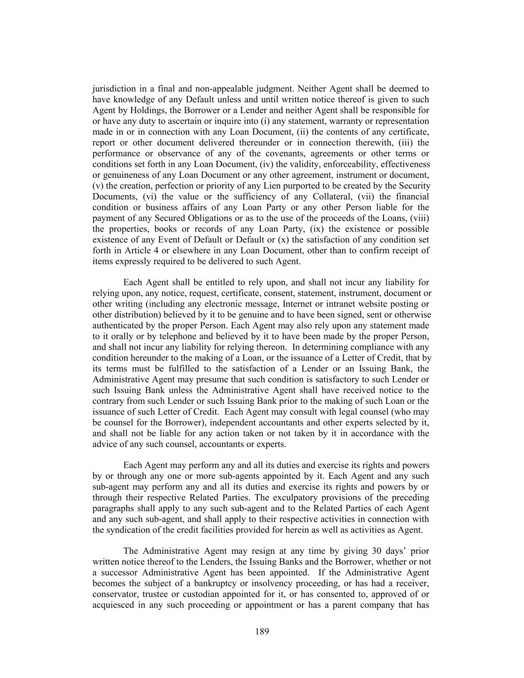 jurisdiction in a final and non-appealable judgment. Neither Agent shall be deemed to have knowledge of any Default unless and until written notice thereof is given to such Agent by Holdings, the Borrower or a Lender and neither Agent shall be responsible for or have any duty to ascertain or inquire into (i) any statement, warranty or representation made in or in connection with any Loan Document, (ii) the contents of any certificate, report or other document delivered thereunder or in connection therewith, (iii) the performance or observance of any of the covenants, agreements or other terms or conditions set forth in any Loan Document, (iv) the validity, enforceability, effectiveness or genuineness of any Loan Document or any other agreement, instrument or document, (v) the creation, perfection or priority of any Lien purported to be created by the Security Documents, (vi) the value or the sufficiency of any Collateral, (vii) the financial condition or business affairs of any Loan Party or any other Person liable for the payment of any Secured Obligations or as to the use of the proceeds of the Loans, (viii) the properties, books or records of any Loan Party, (ix) the existence or possible existence of any Event of Default or Default or (x) the satisfaction of any condition set forth in Article 4 or elsewhere in any Loan Document, other than to confirm receipt of items expressly required to be delivered to such Agent. Each Agent shall be entitled to rely upon, and shall not incur any liability for relying upon, any notice, request, certificate, consent, statement, instrument, document or other writing (including any electronic message, Internet or intranet website posting or other distribution) believed by it to be genuine and to have been signed, sent or otherwise authenticated by the proper Person. Each Agent may also rely upon any statement made to it orally or by telephone and believed by it to have been made by the proper Person, and shall not incur any liability for relying thereon. In determining compliance with any condition hereunder to the making of a Loan, or the issuance of a Letter of Credit, that by its terms must be fulfilled to the satisfaction of a Lender or an Issuing Bank, the Administrative Agent may presume that such condition is satisfactory to such Lender or such Issuing Bank unless the Administrative Agent shall have received notice to the contrary from such Lender or such Issuing Bank prior to the making of such Loan or the issuance of such Letter of Credit. Each Agent may consult with legal counsel (who may be counsel for the Borrower), independent accountants and other experts selected by it, and shall not be liable for any action taken or not taken by it in accordance with the advice of any such counsel, accountants or experts. Each Agent may perform any and all its duties and exercise its rights and powers by or through any one or more sub-agents appointed by it. Each Agent and any such sub-agent may perform any and all its duties and exercise its rights and powers by or through their respective Related Parties. The exculpatory provisions of the preceding paragraphs shall apply to any such sub-agent and to the Related Parties of each Agent and any such sub-agent, and shall apply to their respective activities in connection with the syndication of the credit facilities provided for herein as well as activities as Agent. The Administrative Agent may resign at any time by giving 30 days’ prior written notice thereof to the Lenders, the Issuing Banks and the Borrower, whether or not a successor Administrative Agent has been appointed. If the Administrative Agent becomes the subject of a bankruptcy or insolvency proceeding, or has had a receiver, conservator, trustee or custodian appointed for it, or has consented to, approved of or acquiesced in any such proceeding or appointment or has a parent company that has 189