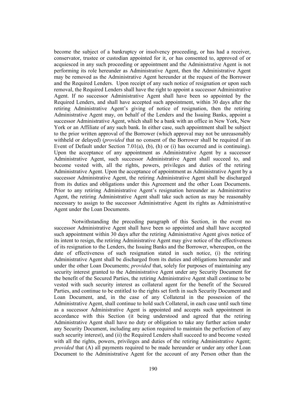 become the subject of a bankruptcy or insolvency proceeding, or has had a receiver, conservator, trustee or custodian appointed for it, or has consented to, approved of or acquiesced in any such proceeding or appointment and the Administrative Agent is not performing its role hereunder as Administrative Agent, then the Administrative Agent may be removed as the Administrative Agent hereunder at the request of the Borrower and the Required Lenders. Upon receipt of any such notice of resignation or upon such removal, the Required Lenders shall have the right to appoint a successor Administrative Agent. If no successor Administrative Agent shall have been so appointed by the Required Lenders, and shall have accepted such appointment, within 30 days after the retiring Administrative Agent’s giving of notice of resignation, then the retiring Administrative Agent may, on behalf of the Lenders and the Issuing Banks, appoint a successor Administrative Agent, which shall be a bank with an office in New York, New York or an Affiliate of any such bank. In either case, such appointment shall be subject to the prior written approval of the Borrower (which approval may not be unreasonably withheld or delayed) (provided that no consent of the Borrower shall be required if an Event of Default under Section 7.01(a), (b), (h) or (i) has occurred and is continuing). Upon the acceptance of any appointment as Administrative Agent by a successor Administrative Agent, such successor Administrative Agent shall succeed to, and become vested with, all the rights, powers, privileges and duties of the retiring Administrative Agent. Upon the acceptance of appointment as Administrative Agent by a successor Administrative Agent, the retiring Administrative Agent shall be discharged from its duties and obligations under this Agreement and the other Loan Documents. Prior to any retiring Administrative Agent’s resignation hereunder as Administrative Agent, the retiring Administrative Agent shall take such action as may be reasonably necessary to assign to the successor Administrative Agent its rights as Administrative Agent under the Loan Documents. Notwithstanding the preceding paragraph of this Section, in the event no successor Administrative Agent shall have been so appointed and shall have accepted such appointment within 30 days after the retiring Administrative Agent gives notice of its intent to resign, the retiring Administrative Agent may give notice of the effectiveness of its resignation to the Lenders, the Issuing Banks and the Borrower, whereupon, on the date of effectiveness of such resignation stated in such notice, (i) the retiring Administrative Agent shall be discharged from its duties and obligations hereunder and under the other Loan Documents; provided that, solely for purposes of maintaining any security interest granted to the Administrative Agent under any Security Document for the benefit of the Secured Parties, the retiring Administrative Agent shall continue to be vested with such security interest as collateral agent for the benefit of the Secured Parties, and continue to be entitled to the rights set forth in such Security Document and Loan Document, and, in the case of any Collateral in the possession of the Administrative Agent, shall continue to hold such Collateral, in each case until such time as a successor Administrative Agent is appointed and accepts such appointment in accordance with this Section (it being understood and agreed that the retiring Administrative Agent shall have no duty or obligation to take any further action under any Security Document, including any action required to maintain the perfection of any such security interest), and (ii) the Required Lenders shall succeed to and become vested with all the rights, powers, privileges and duties of the retiring Administrative Agent; provided that (A) all payments required to be made hereunder or under any other Loan Document to the Administrative Agent for the account of any Person other than the 190