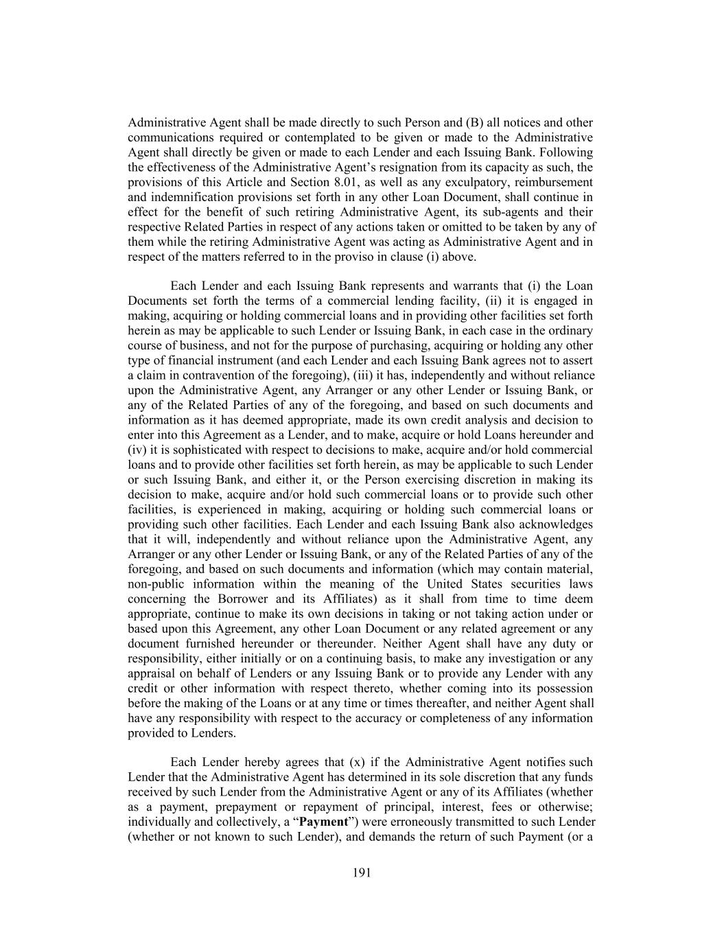 Administrative Agent shall be made directly to such Person and (B) all notices and other communications required or contemplated to be given or made to the Administrative Agent shall directly be given or made to each Lender and each Issuing Bank. Following the effectiveness of the Administrative Agent’s resignation from its capacity as such, the provisions of this Article and Section 8.01, as well as any exculpatory, reimbursement and indemnification provisions set forth in any other Loan Document, shall continue in effect for the benefit of such retiring Administrative Agent, its sub-agents and their respective Related Parties in respect of any actions taken or omitted to be taken by any of them while the retiring Administrative Agent was acting as Administrative Agent and in respect of the matters referred to in the proviso in clause (i) above. Each Lender and each Issuing Bank represents and warrants that (i) the Loan Documents set forth the terms of a commercial lending facility, (ii) it is engaged in making, acquiring or holding commercial loans and in providing other facilities set forth herein as may be applicable to such Lender or Issuing Bank, in each case in the ordinary course of business, and not for the purpose of purchasing, acquiring or holding any other type of financial instrument (and each Lender and each Issuing Bank agrees not to assert a claim in contravention of the foregoing), (iii) it has, independently and without reliance upon the Administrative Agent, any Arranger or any other Lender or Issuing Bank, or any of the Related Parties of any of the foregoing, and based on such documents and information as it has deemed appropriate, made its own credit analysis and decision to enter into this Agreement as a Lender, and to make, acquire or hold Loans hereunder and (iv) it is sophisticated with respect to decisions to make, acquire and/or hold commercial loans and to provide other facilities set forth herein, as may be applicable to such Lender or such Issuing Bank, and either it, or the Person exercising discretion in making its decision to make, acquire and/or hold such commercial loans or to provide such other facilities, is experienced in making, acquiring or holding such commercial loans or providing such other facilities. Each Lender and each Issuing Bank also acknowledges that it will, independently and without reliance upon the Administrative Agent, any Arranger or any other Lender or Issuing Bank, or any of the Related Parties of any of the foregoing, and based on such documents and information (which may contain material, non-public information within the meaning of the United States securities laws concerning the Borrower and its Affiliates) as it shall from time to time deem appropriate, continue to make its own decisions in taking or not taking action under or based upon this Agreement, any other Loan Document or any related agreement or any document furnished hereunder or thereunder. Neither Agent shall have any duty or responsibility, either initially or on a continuing basis, to make any investigation or any appraisal on behalf of Lenders or any Issuing Bank or to provide any Lender with any credit or other information with respect thereto, whether coming into its possession before the making of the Loans or at any time or times thereafter, and neither Agent shall have any responsibility with respect to the accuracy or completeness of any information provided to Lenders. Each Lender hereby agrees that (x) if the Administrative Agent notifies such Lender that the Administrative Agent has determined in its sole discretion that any funds received by such Lender from the Administrative Agent or any of its Affiliates (whether as a payment, prepayment or repayment of principal, interest, fees or otherwise; individually and collectively, a “Payment”) were erroneously transmitted to such Lender (whether or not known to such Lender), and demands the return of such Payment (or a 191