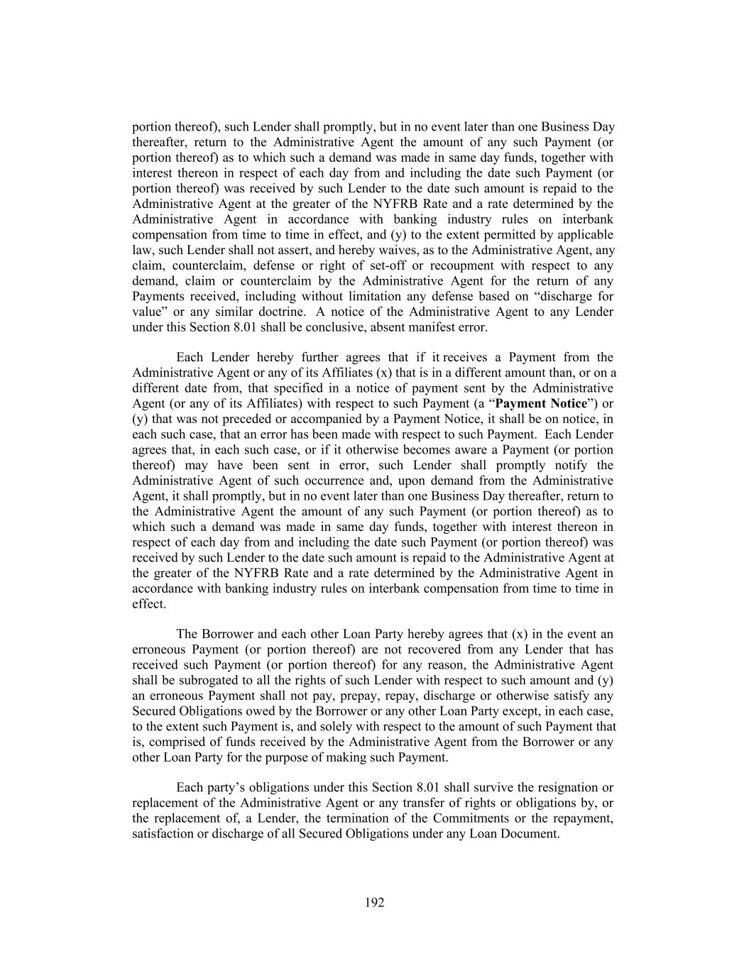 portion thereof), such Lender shall promptly, but in no event later than one Business Day thereafter, return to the Administrative Agent the amount of any such Payment (or portion thereof) as to which such a demand was made in same day funds, together with interest thereon in respect of each day from and including the date such Payment (or portion thereof) was received by such Lender to the date such amount is repaid to the Administrative Agent at the greater of the NYFRB Rate and a rate determined by the Administrative Agent in accordance with banking industry rules on interbank compensation from time to time in effect, and (y) to the extent permitted by applicable law, such Lender shall not assert, and hereby waives, as to the Administrative Agent, any claim, counterclaim, defense or right of set-off or recoupment with respect to any demand, claim or counterclaim by the Administrative Agent for the return of any Payments received, including without limitation any defense based on “discharge for value” or any similar doctrine. A notice of the Administrative Agent to any Lender under this Section 8.01 shall be conclusive, absent manifest error. Each Lender hereby further agrees that if it receives a Payment from the Administrative Agent or any of its Affiliates (x) that is in a different amount than, or on a different date from, that specified in a notice of payment sent by the Administrative Agent (or any of its Affiliates) with respect to such Payment (a “Payment Notice”) or (y) that was not preceded or accompanied by a Payment Notice, it shall be on notice, in each such case, that an error has been made with respect to such Payment. Each Lender agrees that, in each such case, or if it otherwise becomes aware a Payment (or portion thereof) may have been sent in error, such Lender shall promptly notify the Administrative Agent of such occurrence and, upon demand from the Administrative Agent, it shall promptly, but in no event later than one Business Day thereafter, return to the Administrative Agent the amount of any such Payment (or portion thereof) as to which such a demand was made in same day funds, together with interest thereon in respect of each day from and including the date such Payment (or portion thereof) was received by such Lender to the date such amount is repaid to the Administrative Agent at the greater of the NYFRB Rate and a rate determined by the Administrative Agent in accordance with banking industry rules on interbank compensation from time to time in effect. The Borrower and each other Loan Party hereby agrees that (x) in the event an erroneous Payment (or portion thereof) are not recovered from any Lender that has received such Payment (or portion thereof) for any reason, the Administrative Agent shall be subrogated to all the rights of such Lender with respect to such amount and (y) an erroneous Payment shall not pay, prepay, repay, discharge or otherwise satisfy any Secured Obligations owed by the Borrower or any other Loan Party except, in each case, to the extent such Payment is, and solely with respect to the amount of such Payment that is, comprised of funds received by the Administrative Agent from the Borrower or any other Loan Party for the purpose of making such Payment. Each party’s obligations under this Section 8.01 shall survive the resignation or replacement of the Administrative Agent or any transfer of rights or obligations by, or the replacement of, a Lender, the termination of the Commitments or the repayment, satisfaction or discharge of all Secured Obligations under any Loan Document. 192