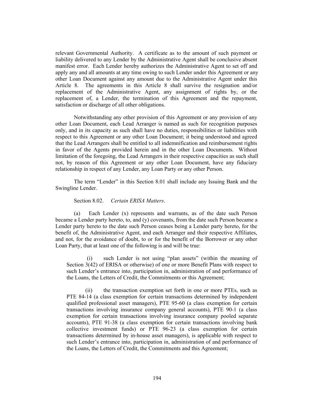 relevant Governmental Authority. A certificate as to the amount of such payment or liability delivered to any Lender by the Administrative Agent shall be conclusive absent manifest error. Each Lender hereby authorizes the Administrative Agent to set off and apply any and all amounts at any time owing to such Lender under this Agreement or any other Loan Document against any amount due to the Administrative Agent under this Article 8. The agreements in this Article 8 shall survive the resignation and/or replacement of the Administrative Agent, any assignment of rights by, or the replacement of, a Lender, the termination of this Agreement and the repayment, satisfaction or discharge of all other obligations. Notwithstanding any other provision of this Agreement or any provision of any other Loan Document, each Lead Arranger is named as such for recognition purposes only, and in its capacity as such shall have no duties, responsibilities or liabilities with respect to this Agreement or any other Loan Document; it being understood and agreed that the Lead Arrangers shall be entitled to all indemnification and reimbursement rights in favor of the Agents provided herein and in the other Loan Documents. Without limitation of the foregoing, the Lead Arrangers in their respective capacities as such shall not, by reason of this Agreement or any other Loan Document, have any fiduciary relationship in respect of any Lender, any Loan Party or any other Person. The term “Lender” in this Section 8.01 shall include any Issuing Bank and the Swingline Lender. Section 8.02. Certain ERISA Matters. (a) Each Lender (x) represents and warrants, as of the date such Person became a Lender party hereto, to, and (y) covenants, from the date such Person became a Lender party hereto to the date such Person ceases being a Lender party hereto, for the benefit of, the Administrative Agent, and each Arranger and their respective Affiliates, and not, for the avoidance of doubt, to or for the benefit of the Borrower or any other Loan Party, that at least one of the following is and will be true: (i) such Lender is not using “plan assets” (within the meaning of Section 3(42) of ERISA or otherwise) of one or more Benefit Plans with respect to such Lender’s entrance into, participation in, administration of and performance of the Loans, the Letters of Credit, the Commitments or this Agreement; (ii) the transaction exemption set forth in one or more PTEs, such as PTE 84-14 (a class exemption for certain transactions determined by independent qualified professional asset managers), PTE 95-60 (a class exemption for certain transactions involving insurance company general accounts), PTE 90-1 (a class exemption for certain transactions involving insurance company pooled separate accounts), PTE 91-38 (a class exemption for certain transactions involving bank collective investment funds) or PTE 96-23 (a class exemption for certain transactions determined by in-house asset managers), is applicable with respect to such Lender’s entrance into, participation in, administration of and performance of the Loans, the Letters of Credit, the Commitments and this Agreement; 194