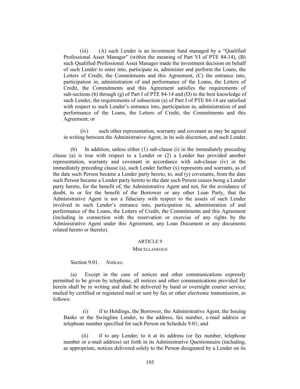 (iii) (A) such Lender is an investment fund managed by a “Qualified Professional Asset Manager” (within the meaning of Part VI of PTE 84-14), (B) such Qualified Professional Asset Manager made the investment decision on behalf of such Lender to enter into, participate in, administer and perform the Loans, the Letters of Credit, the Commitments and this Agreement, (C) the entrance into, participation in, administration of and performance of the Loans, the Letters of Credit, the Commitments and this Agreement satisfies the requirements of sub-sections (b) through (g) of Part I of PTE 84-14 and (D) to the best knowledge of such Lender, the requirements of subsection (a) of Part I of PTE 84-14 are satisfied with respect to such Lender’s entrance into, participation in, administration of and performance of the Loans, the Letters of Credit, the Commitments and this Agreement; or (iv) such other representation, warranty and covenant as may be agreed in writing between the Administrative Agent, in its sole discretion, and such Lender. (b) In addition, unless either (1) sub-clause (i) in the immediately preceding clause (a) is true with respect to a Lender or (2) a Lender has provided another representation, warranty and covenant in accordance with sub-clause (iv) in the immediately preceding clause (a), such Lender further (x) represents and warrants, as of the date such Person became a Lender party hereto, to, and (y) covenants, from the date such Person became a Lender party hereto to the date such Person ceases being a Lender party hereto, for the benefit of, the Administrative Agent and not, for the avoidance of doubt, to or for the benefit of the Borrower or any other Loan Party, that the Administrative Agent is not a fiduciary with respect to the assets of such Lender involved in such Lender’s entrance into, participation in, administration of and performance of the Loans, the Letters of Credit, the Commitments and this Agreement (including in connection with the reservation or exercise of any rights by the Administrative Agent under this Agreement, any Loan Document or any documents related hereto or thereto). ARTICLE 9 MISCELLANEOUS Section 9.01. Notices. (a) Except in the case of notices and other communications expressly permitted to be given by telephone, all notices and other communications provided for herein shall be in writing and shall be delivered by hand or overnight courier service, mailed by certified or registered mail or sent by fax or other electronic transmission, as follows: (i) if to Holdings, the Borrower, the Administrative Agent, the Issuing Banks or the Swingline Lender, to the address, fax number, e-mail address or telephone number specified for such Person on Schedule 9.01; and (ii) if to any Lender, to it at its address (or fax number, telephone number or e-mail address) set forth in its Administrative Questionnaire (including, as appropriate, notices delivered solely to the Person designated by a Lender on its 195