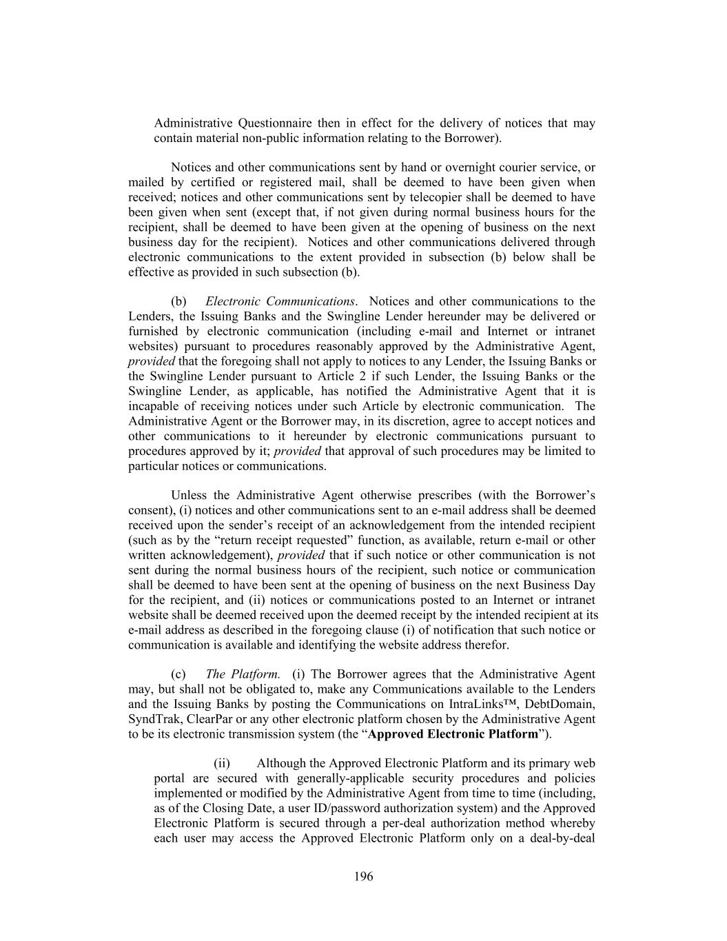 Administrative Questionnaire then in effect for the delivery of notices that may contain material non-public information relating to the Borrower). Notices and other communications sent by hand or overnight courier service, or mailed by certified or registered mail, shall be deemed to have been given when received; notices and other communications sent by telecopier shall be deemed to have been given when sent (except that, if not given during normal business hours for the recipient, shall be deemed to have been given at the opening of business on the next business day for the recipient). Notices and other communications delivered through electronic communications to the extent provided in subsection (b) below shall be effective as provided in such subsection (b). (b) Electronic Communications. Notices and other communications to the Lenders, the Issuing Banks and the Swingline Lender hereunder may be delivered or furnished by electronic communication (including e-mail and Internet or intranet websites) pursuant to procedures reasonably approved by the Administrative Agent, provided that the foregoing shall not apply to notices to any Lender, the Issuing Banks or the Swingline Lender pursuant to Article 2 if such Lender, the Issuing Banks or the Swingline Lender, as applicable, has notified the Administrative Agent that it is incapable of receiving notices under such Article by electronic communication. The Administrative Agent or the Borrower may, in its discretion, agree to accept notices and other communications to it hereunder by electronic communications pursuant to procedures approved by it; provided that approval of such procedures may be limited to particular notices or communications. Unless the Administrative Agent otherwise prescribes (with the Borrower’s consent), (i) notices and other communications sent to an e-mail address shall be deemed received upon the sender’s receipt of an acknowledgement from the intended recipient (such as by the “return receipt requested” function, as available, return e-mail or other written acknowledgement), provided that if such notice or other communication is not sent during the normal business hours of the recipient, such notice or communication shall be deemed to have been sent at the opening of business on the next Business Day for the recipient, and (ii) notices or communications posted to an Internet or intranet website shall be deemed received upon the deemed receipt by the intended recipient at its e-mail address as described in the foregoing clause (i) of notification that such notice or communication is available and identifying the website address therefor. (c) The Platform. (i) The Borrower agrees that the Administrative Agent may, but shall not be obligated to, make any Communications available to the Lenders and the Issuing Banks by posting the Communications on IntraLinks™, DebtDomain, SyndTrak, ClearPar or any other electronic platform chosen by the Administrative Agent to be its electronic transmission system (the “Approved Electronic Platform”). (ii) Although the Approved Electronic Platform and its primary web portal are secured with generally-applicable security procedures and policies implemented or modified by the Administrative Agent from time to time (including, as of the Closing Date, a user ID/password authorization system) and the Approved Electronic Platform is secured through a per-deal authorization method whereby each user may access the Approved Electronic Platform only on a deal-by-deal 196