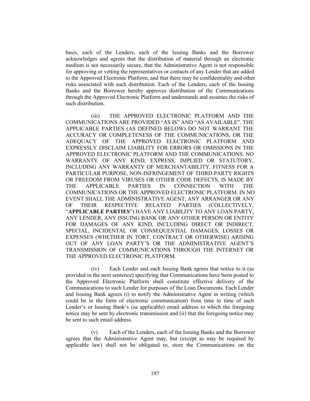 basis, each of the Lenders, each of the Issuing Banks and the Borrower acknowledges and agrees that the distribution of material through an electronic medium is not necessarily secure, that the Administrative Agent is not responsible for approving or vetting the representatives or contacts of any Lender that are added to the Approved Electronic Platform, and that there may be confidentiality and other risks associated with such distribution. Each of the Lenders, each of the Issuing Banks and the Borrower hereby approves distribution of the Communications through the Approved Electronic Platform and understands and assumes the risks of such distribution. (iii) THE APPROVED ELECTRONIC PLATFORM AND THE COMMUNICATIONS ARE PROVIDED “AS IS” AND “AS AVAILABLE”. THE APPLICABLE PARTIES (AS DEFINED BELOW) DO NOT WARRANT THE ACCURACY OR COMPLETENESS OF THE COMMUNICATIONS, OR THE ADEQUACY OF THE APPROVED ELECTRONIC PLATFORM AND EXPRESSLY DISCLAIM LIABILITY FOR ERRORS OR OMISSIONS IN THE APPROVED ELECTRONIC PLATFORM AND THE COMMUNICATIONS. NO WARRANTY OF ANY KIND, EXPRESS, IMPLIED OR STATUTORY, INCLUDING ANY WARRANTY OF MERCHANTABILITY, FITNESS FOR A PARTICULAR PURPOSE, NON-INFRINGEMENT OF THIRD PARTY RIGHTS OR FREEDOM FROM VIRUSES OR OTHER CODE DEFECTS, IS MADE BY THE APPLICABLE PARTIES IN CONNECTION WITH THE COMMUNICATIONS OR THE APPROVED ELECTRONIC PLATFORM. IN NO EVENT SHALL THE ADMINISTRATIVE AGENT, ANY ARRANGER OR ANY OF THEIR RESPECTIVE RELATED PARTIES (COLLECTIVELY, “APPLICABLE PARTIES”) HAVE ANY LIABILITY TO ANY LOAN PARTY, ANY LENDER, ANY ISSUING BANK OR ANY OTHER PERSON OR ENTITY FOR DAMAGES OF ANY KIND, INCLUDING DIRECT OR INDIRECT, SPECIAL, INCIDENTAL OR CONSEQUENTIAL DAMAGES, LOSSES OR EXPENSES (WHETHER IN TORT, CONTRACT OR OTHERWISE) ARISING OUT OF ANY LOAN PARTY’S OR THE ADMINISTRATIVE AGENT’S TRANSMISSION OF COMMUNICATIONS THROUGH THE INTERNET OR THE APPROVED ELECTRONIC PLATFORM. (iv) Each Lender and each Issuing Bank agrees that notice to it (as provided in the next sentence) specifying that Communications have been posted to the Approved Electronic Platform shall constitute effective delivery of the Communications to such Lender for purposes of the Loan Documents. Each Lender and Issuing Bank agrees (i) to notify the Administrative Agent in writing (which could be in the form of electronic communication) from time to time of such Lender’s or Issuing Bank’s (as applicable) email address to which the foregoing notice may be sent by electronic transmission and (ii) that the foregoing notice may be sent to such email address. (v) Each of the Lenders, each of the Issuing Banks and the Borrower agrees that the Administrative Agent may, but (except as may be required by applicable law) shall not be obligated to, store the Communications on the 197