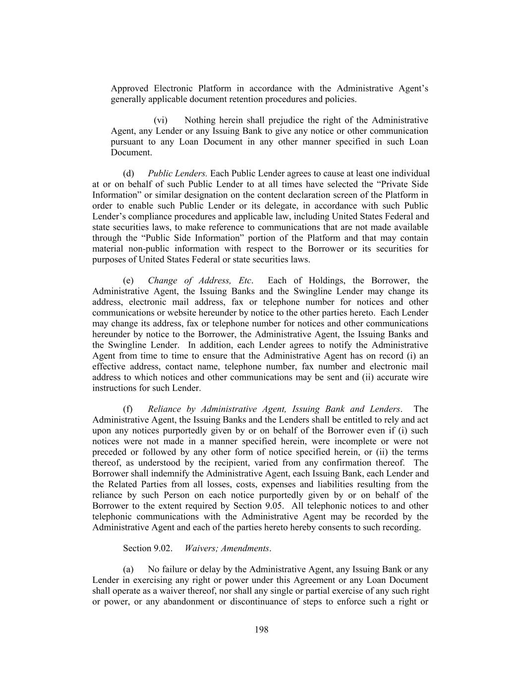 Approved Electronic Platform in accordance with the Administrative Agent’s generally applicable document retention procedures and policies. (vi) Nothing herein shall prejudice the right of the Administrative Agent, any Lender or any Issuing Bank to give any notice or other communication pursuant to any Loan Document in any other manner specified in such Loan Document. (d) Public Lenders. Each Public Lender agrees to cause at least one individual at or on behalf of such Public Lender to at all times have selected the “Private Side Information” or similar designation on the content declaration screen of the Platform in order to enable such Public Lender or its delegate, in accordance with such Public Lender’s compliance procedures and applicable law, including United States Federal and state securities laws, to make reference to communications that are not made available through the “Public Side Information” portion of the Platform and that may contain material non-public information with respect to the Borrower or its securities for purposes of United States Federal or state securities laws. (e) Change of Address, Etc. Each of Holdings, the Borrower, the Administrative Agent, the Issuing Banks and the Swingline Lender may change its address, electronic mail address, fax or telephone number for notices and other communications or website hereunder by notice to the other parties hereto. Each Lender may change its address, fax or telephone number for notices and other communications hereunder by notice to the Borrower, the Administrative Agent, the Issuing Banks and the Swingline Lender. In addition, each Lender agrees to notify the Administrative Agent from time to time to ensure that the Administrative Agent has on record (i) an effective address, contact name, telephone number, fax number and electronic mail address to which notices and other communications may be sent and (ii) accurate wire instructions for such Lender. (f) Reliance by Administrative Agent, Issuing Bank and Lenders. The Administrative Agent, the Issuing Banks and the Lenders shall be entitled to rely and act upon any notices purportedly given by or on behalf of the Borrower even if (i) such notices were not made in a manner specified herein, were incomplete or were not preceded or followed by any other form of notice specified herein, or (ii) the terms thereof, as understood by the recipient, varied from any confirmation thereof. The Borrower shall indemnify the Administrative Agent, each Issuing Bank, each Lender and the Related Parties from all losses, costs, expenses and liabilities resulting from the reliance by such Person on each notice purportedly given by or on behalf of the Borrower to the extent required by Section 9.05. All telephonic notices to and other telephonic communications with the Administrative Agent may be recorded by the Administrative Agent and each of the parties hereto hereby consents to such recording. Section 9.02. Waivers; Amendments. (a) No failure or delay by the Administrative Agent, any Issuing Bank or any Lender in exercising any right or power under this Agreement or any Loan Document shall operate as a waiver thereof, nor shall any single or partial exercise of any such right or power, or any abandonment or discontinuance of steps to enforce such a right or 198