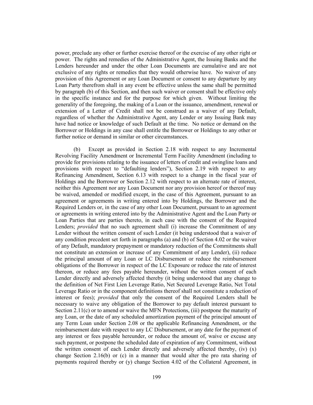 power, preclude any other or further exercise thereof or the exercise of any other right or power. The rights and remedies of the Administrative Agent, the Issuing Banks and the Lenders hereunder and under the other Loan Documents are cumulative and are not exclusive of any rights or remedies that they would otherwise have. No waiver of any provision of this Agreement or any Loan Document or consent to any departure by any Loan Party therefrom shall in any event be effective unless the same shall be permitted by paragraph (b) of this Section, and then such waiver or consent shall be effective only in the specific instance and for the purpose for which given. Without limiting the generality of the foregoing, the making of a Loan or the issuance, amendment, renewal or extension of a Letter of Credit shall not be construed as a waiver of any Default, regardless of whether the Administrative Agent, any Lender or any Issuing Bank may have had notice or knowledge of such Default at the time. No notice or demand on the Borrower or Holdings in any case shall entitle the Borrower or Holdings to any other or further notice or demand in similar or other circumstances. (b) Except as provided in Section 2.18 with respect to any Incremental Revolving Facility Amendment or Incremental Term Facility Amendment (including to provide for provisions relating to the issuance of letters of credit and swingline loans and provisions with respect to “defaulting lenders”), Section 2.19 with respect to any Refinancing Amendment, Section 6.13 with respect to a change in the fiscal year of Holdings and the Borrower or Section 2.12 with respect to an alternate rate of interest, neither this Agreement nor any Loan Document nor any provision hereof or thereof may be waived, amended or modified except, in the case of this Agreement, pursuant to an agreement or agreements in writing entered into by Holdings, the Borrower and the Required Lenders or, in the case of any other Loan Document, pursuant to an agreement or agreements in writing entered into by the Administrative Agent and the Loan Party or Loan Parties that are parties thereto, in each case with the consent of the Required Lenders; provided that no such agreement shall (i) increase the Commitment of any Lender without the written consent of such Lender (it being understood that a waiver of any condition precedent set forth in paragraphs (a) and (b) of Section 4.02 or the waiver of any Default, mandatory prepayment or mandatory reduction of the Commitments shall not constitute an extension or increase of any Commitment of any Lender), (ii) reduce the principal amount of any Loan or LC Disbursement or reduce the reimbursement obligations of the Borrower in respect of the LC Exposure or reduce the rate of interest thereon, or reduce any fees payable hereunder, without the written consent of each Lender directly and adversely affected thereby (it being understood that any change to the definition of Net First Lien Leverage Ratio, Net Secured Leverage Ratio, Net Total Leverage Ratio or in the component definitions thereof shall not constitute a reduction of interest or fees); provided that only the consent of the Required Lenders shall be necessary to waive any obligation of the Borrower to pay default interest pursuant to Section 2.11(c) or to amend or waive the MFN Protections, (iii) postpone the maturity of any Loan, or the date of any scheduled amortization payment of the principal amount of any Term Loan under Section 2.08 or the applicable Refinancing Amendment, or the reimbursement date with respect to any LC Disbursement, or any date for the payment of any interest or fees payable hereunder, or reduce the amount of, waive or excuse any such payment, or postpone the scheduled date of expiration of any Commitment, without the written consent of each Lender directly and adversely affected thereby, (iv) (x) change Section 2.16(b) or (c) in a manner that would alter the pro rata sharing of payments required thereby or (y) change Section 4.02 of the Collateral Agreement, in 199
