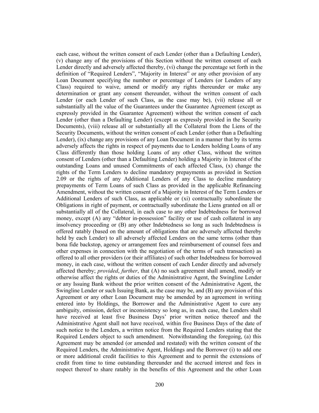 each case, without the written consent of each Lender (other than a Defaulting Lender), (v) change any of the provisions of this Section without the written consent of each Lender directly and adversely affected thereby, (vi) change the percentage set forth in the definition of “Required Lenders”, “Majority in Interest” or any other provision of any Loan Document specifying the number or percentage of Lenders (or Lenders of any Class) required to waive, amend or modify any rights thereunder or make any determination or grant any consent thereunder, without the written consent of each Lender (or each Lender of such Class, as the case may be), (vii) release all or substantially all the value of the Guarantees under the Guarantee Agreement (except as expressly provided in the Guarantee Agreement) without the written consent of each Lender (other than a Defaulting Lender) (except as expressly provided in the Security Documents), (viii) release all or substantially all the Collateral from the Liens of the Security Documents, without the written consent of each Lender (other than a Defaulting Lender), (ix) change any provisions of any Loan Document in a manner that by its terms adversely affects the rights in respect of payments due to Lenders holding Loans of any Class differently than those holding Loans of any other Class, without the written consent of Lenders (other than a Defaulting Lender) holding a Majority in Interest of the outstanding Loans and unused Commitments of each affected Class, (x) change the rights of the Term Lenders to decline mandatory prepayments as provided in Section 2.09 or the rights of any Additional Lenders of any Class to decline mandatory prepayments of Term Loans of such Class as provided in the applicable Refinancing Amendment, without the written consent of a Majority in Interest of the Term Lenders or Additional Lenders of such Class, as applicable or (xi) contractually subordinate the Obligations in right of payment, or contractually subordinate the Liens granted on all or substantially all of the Collateral, in each case to any other Indebtedness for borrowed money, except (A) any “debtor in-possession” facility or use of cash collateral in any insolvency proceeding or (B) any other Indebtedness so long as such Indebtedness is offered ratably (based on the amount of obligations that are adversely affected thereby held by each Lender) to all adversely affected Lenders on the same terms (other than bona fide backstop, agency or arrangement fees and reimbursement of counsel fees and other expenses in connection with the negotiation of the terms of such transaction) as offered to all other providers (or their affiliates) of such other Indebtedness for borrowed money, in each case, without the written consent of each Lender directly and adversely affected thereby; provided, further, that (A) no such agreement shall amend, modify or otherwise affect the rights or duties of the Administrative Agent, the Swingline Lender or any Issuing Bank without the prior written consent of the Administrative Agent, the Swingline Lender or such Issuing Bank, as the case may be, and (B) any provision of this Agreement or any other Loan Document may be amended by an agreement in writing entered into by Holdings, the Borrower and the Administrative Agent to cure any ambiguity, omission, defect or inconsistency so long as, in each case, the Lenders shall have received at least five Business Days’ prior written notice thereof and the Administrative Agent shall not have received, within five Business Days of the date of such notice to the Lenders, a written notice from the Required Lenders stating that the Required Lenders object to such amendment. Notwithstanding the foregoing, (a) this Agreement may be amended (or amended and restated) with the written consent of the Required Lenders, the Administrative Agent, Holdings and the Borrower (i) to add one or more additional credit facilities to this Agreement and to permit the extensions of credit from time to time outstanding thereunder and the accrued interest and fees in respect thereof to share ratably in the benefits of this Agreement and the other Loan 200