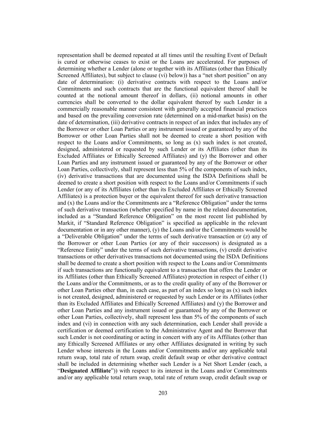representation shall be deemed repeated at all times until the resulting Event of Default is cured or otherwise ceases to exist or the Loans are accelerated. For purposes of determining whether a Lender (alone or together with its Affiliates (other than Ethically Screened Affiliates), but subject to clause (vi) below)) has a “net short position” on any date of determination: (i) derivative contracts with respect to the Loans and/or Commitments and such contracts that are the functional equivalent thereof shall be counted at the notional amount thereof in dollars, (ii) notional amounts in other currencies shall be converted to the dollar equivalent thereof by such Lender in a commercially reasonable manner consistent with generally accepted financial practices and based on the prevailing conversion rate (determined on a mid-market basis) on the date of determination, (iii) derivative contracts in respect of an index that includes any of the Borrower or other Loan Parties or any instrument issued or guaranteed by any of the Borrower or other Loan Parties shall not be deemed to create a short position with respect to the Loans and/or Commitments, so long as (x) such index is not created, designed, administered or requested by such Lender or its Affiliates (other than its Excluded Affiliates or Ethically Screened Affiliates) and (y) the Borrower and other Loan Parties and any instrument issued or guaranteed by any of the Borrower or other Loan Parties, collectively, shall represent less than 5% of the components of such index, (iv) derivative transactions that are documented using the ISDA Definitions shall be deemed to create a short position with respect to the Loans and/or Commitments if such Lender (or any of its Affiliates (other than its Excluded Affiliates or Ethically Screened Affiliates) is a protection buyer or the equivalent thereof for such derivative transaction and (x) the Loans and/or the Commitments are a “Reference Obligation” under the terms of such derivative transaction (whether specified by name in the related documentation, included as a “Standard Reference Obligation” on the most recent list published by Markit, if “Standard Reference Obligation” is specified as applicable in the relevant documentation or in any other manner), (y) the Loans and/or the Commitments would be a “Deliverable Obligation” under the terms of such derivative transaction or (z) any of the Borrower or other Loan Parties (or any of their successors) is designated as a “Reference Entity” under the terms of such derivative transactions, (v) credit derivative transactions or other derivatives transactions not documented using the ISDA Definitions shall be deemed to create a short position with respect to the Loans and/or Commitments if such transactions are functionally equivalent to a transaction that offers the Lender or its Affiliates (other than Ethically Screened Affiliates) protection in respect of either (1) the Loans and/or the Commitments, or as to the credit quality of any of the Borrower or other Loan Parties other than, in each case, as part of an index so long as (x) such index is not created, designed, administered or requested by such Lender or its Affiliates (other than its Excluded Affiliates and Ethically Screened Affiliates) and (y) the Borrower and other Loan Parties and any instrument issued or guaranteed by any of the Borrower or other Loan Parties, collectively, shall represent less than 5% of the components of such index and (vi) in connection with any such determination, each Lender shall provide a certification or deemed certification to the Administrative Agent and the Borrower that such Lender is not coordinating or acting in concert with any of its Affiliates (other than any Ethically Screened Affiliates or any other Affiliates designated in writing by such Lender whose interests in the Loans and/or Commitments and/or any applicable total return swap, total rate of return swap, credit default swap or other derivative contract shall be included in determining whether such Lender is a Net Short Lender (each, a “Designated Affiliate”)) with respect to its interest in the Loans and/or Commitments and/or any applicable total return swap, total rate of return swap, credit default swap or 203