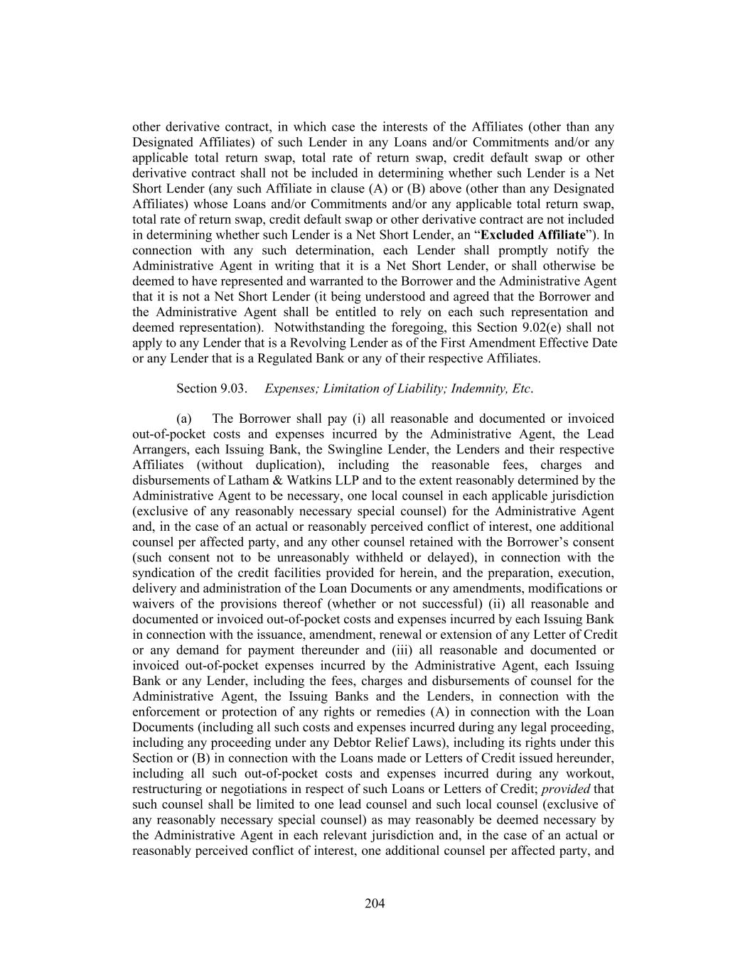 other derivative contract, in which case the interests of the Affiliates (other than any Designated Affiliates) of such Lender in any Loans and/or Commitments and/or any applicable total return swap, total rate of return swap, credit default swap or other derivative contract shall not be included in determining whether such Lender is a Net Short Lender (any such Affiliate in clause (A) or (B) above (other than any Designated Affiliates) whose Loans and/or Commitments and/or any applicable total return swap, total rate of return swap, credit default swap or other derivative contract are not included in determining whether such Lender is a Net Short Lender, an “Excluded Affiliate”). In connection with any such determination, each Lender shall promptly notify the Administrative Agent in writing that it is a Net Short Lender, or shall otherwise be deemed to have represented and warranted to the Borrower and the Administrative Agent that it is not a Net Short Lender (it being understood and agreed that the Borrower and the Administrative Agent shall be entitled to rely on each such representation and deemed representation). Notwithstanding the foregoing, this Section 9.02(e) shall not apply to any Lender that is a Revolving Lender as of the First Amendment Effective Date or any Lender that is a Regulated Bank or any of their respective Affiliates. Section 9.03. Expenses; Limitation of Liability; Indemnity, Etc. (a) The Borrower shall pay (i) all reasonable and documented or invoiced out-of-pocket costs and expenses incurred by the Administrative Agent, the Lead Arrangers, each Issuing Bank, the Swingline Lender, the Lenders and their respective Affiliates (without duplication), including the reasonable fees, charges and disbursements of Latham & Watkins LLP and to the extent reasonably determined by the Administrative Agent to be necessary, one local counsel in each applicable jurisdiction (exclusive of any reasonably necessary special counsel) for the Administrative Agent and, in the case of an actual or reasonably perceived conflict of interest, one additional counsel per affected party, and any other counsel retained with the Borrower’s consent (such consent not to be unreasonably withheld or delayed), in connection with the syndication of the credit facilities provided for herein, and the preparation, execution, delivery and administration of the Loan Documents or any amendments, modifications or waivers of the provisions thereof (whether or not successful) (ii) all reasonable and documented or invoiced out-of-pocket costs and expenses incurred by each Issuing Bank in connection with the issuance, amendment, renewal or extension of any Letter of Credit or any demand for payment thereunder and (iii) all reasonable and documented or invoiced out-of-pocket expenses incurred by the Administrative Agent, each Issuing Bank or any Lender, including the fees, charges and disbursements of counsel for the Administrative Agent, the Issuing Banks and the Lenders, in connection with the enforcement or protection of any rights or remedies (A) in connection with the Loan Documents (including all such costs and expenses incurred during any legal proceeding, including any proceeding under any Debtor Relief Laws), including its rights under this Section or (B) in connection with the Loans made or Letters of Credit issued hereunder, including all such out-of-pocket costs and expenses incurred during any workout, restructuring or negotiations in respect of such Loans or Letters of Credit; provided that such counsel shall be limited to one lead counsel and such local counsel (exclusive of any reasonably necessary special counsel) as may reasonably be deemed necessary by the Administrative Agent in each relevant jurisdiction and, in the case of an actual or reasonably perceived conflict of interest, one additional counsel per affected party, and 204