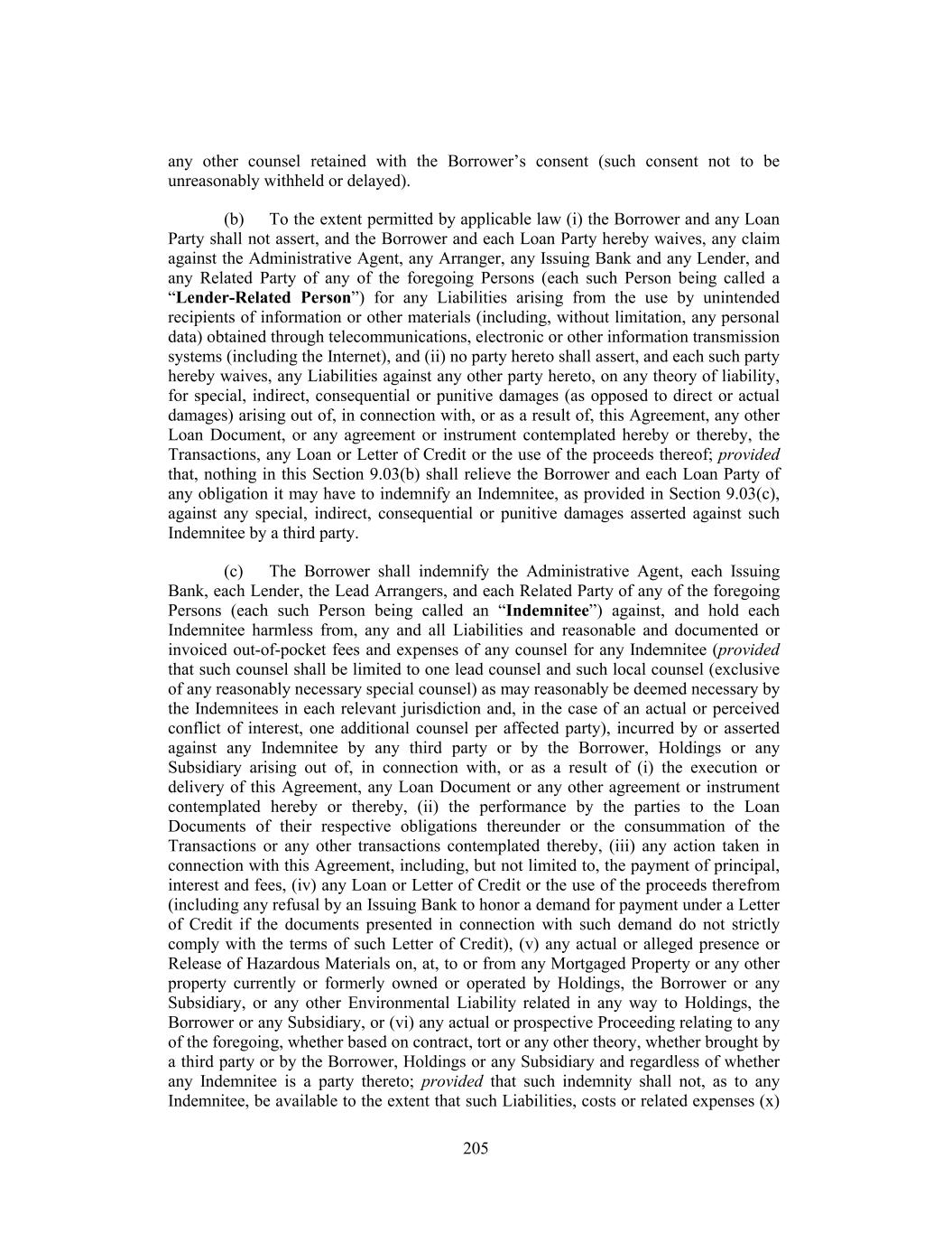 any other counsel retained with the Borrower’s consent (such consent not to be unreasonably withheld or delayed). (b) To the extent permitted by applicable law (i) the Borrower and any Loan Party shall not assert, and the Borrower and each Loan Party hereby waives, any claim against the Administrative Agent, any Arranger, any Issuing Bank and any Lender, and any Related Party of any of the foregoing Persons (each such Person being called a “Lender-Related Person”) for any Liabilities arising from the use by unintended recipients of information or other materials (including, without limitation, any personal data) obtained through telecommunications, electronic or other information transmission systems (including the Internet), and (ii) no party hereto shall assert, and each such party hereby waives, any Liabilities against any other party hereto, on any theory of liability, for special, indirect, consequential or punitive damages (as opposed to direct or actual damages) arising out of, in connection with, or as a result of, this Agreement, any other Loan Document, or any agreement or instrument contemplated hereby or thereby, the Transactions, any Loan or Letter of Credit or the use of the proceeds thereof; provided that, nothing in this Section 9.03(b) shall relieve the Borrower and each Loan Party of any obligation it may have to indemnify an Indemnitee, as provided in Section 9.03(c), against any special, indirect, consequential or punitive damages asserted against such Indemnitee by a third party. (c) The Borrower shall indemnify the Administrative Agent, each Issuing Bank, each Lender, the Lead Arrangers, and each Related Party of any of the foregoing Persons (each such Person being called an “Indemnitee”) against, and hold each Indemnitee harmless from, any and all Liabilities and reasonable and documented or invoiced out-of-pocket fees and expenses of any counsel for any Indemnitee (provided that such counsel shall be limited to one lead counsel and such local counsel (exclusive of any reasonably necessary special counsel) as may reasonably be deemed necessary by the Indemnitees in each relevant jurisdiction and, in the case of an actual or perceived conflict of interest, one additional counsel per affected party), incurred by or asserted against any Indemnitee by any third party or by the Borrower, Holdings or any Subsidiary arising out of, in connection with, or as a result of (i) the execution or delivery of this Agreement, any Loan Document or any other agreement or instrument contemplated hereby or thereby, (ii) the performance by the parties to the Loan Documents of their respective obligations thereunder or the consummation of the Transactions or any other transactions contemplated thereby, (iii) any action taken in connection with this Agreement, including, but not limited to, the payment of principal, interest and fees, (iv) any Loan or Letter of Credit or the use of the proceeds therefrom (including any refusal by an Issuing Bank to honor a demand for payment under a Letter of Credit if the documents presented in connection with such demand do not strictly comply with the terms of such Letter of Credit), (v) any actual or alleged presence or Release of Hazardous Materials on, at, to or from any Mortgaged Property or any other property currently or formerly owned or operated by Holdings, the Borrower or any Subsidiary, or any other Environmental Liability related in any way to Holdings, the Borrower or any Subsidiary, or (vi) any actual or prospective Proceeding relating to any of the foregoing, whether based on contract, tort or any other theory, whether brought by a third party or by the Borrower, Holdings or any Subsidiary and regardless of whether any Indemnitee is a party thereto; provided that such indemnity shall not, as to any Indemnitee, be available to the extent that such Liabilities, costs or related expenses (x) 205